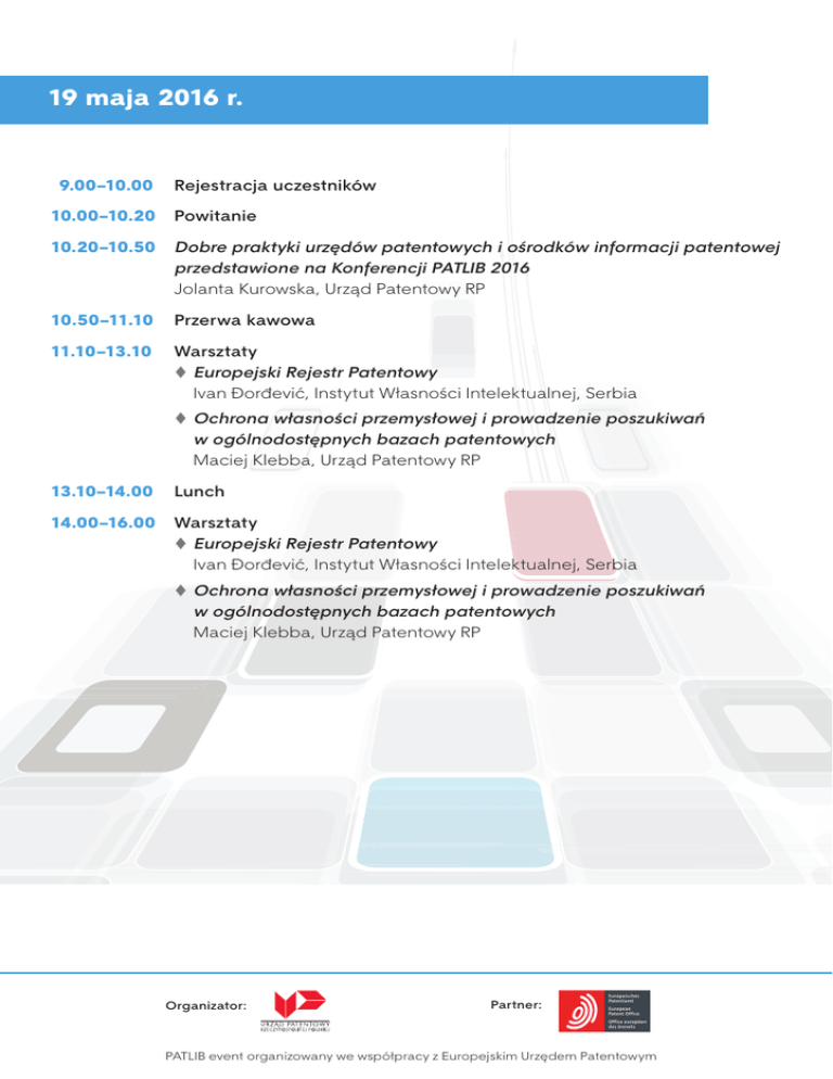 19 maja 2016 r. 9.00–10.00 Rejestracja uczestników 10.00–10.20 Powitanie 10.20–10.50 Dobre praktyki urzędów patentowych i ośrodków informacji patentowej przedstawione na Konferencji PATLIB 2016 Jolanta Kurowska, Urząd Patentowy RP 10.50–11.10 Przerwa kawowa 11.10–13.10 Warsztaty Europejski Rejestr Patentowy Ivan Đorđević, Instytut Własności Intelektualnej, Serbia Ochrona własności przemysłowej i prowadzenie poszukiwań w ogólnodostępnych bazach patentowych Maciej Klebba, Urząd Patentowy RP 13.10–14.00 Lunch 14.00–16.00 Warsztaty Europejski Rejestr Patentowy Ivan Đorđević, Instytut Własności Intelektualnej, Serbia Ochrona własności przemysłowej i prowadzenie poszukiwań w ogólnodostępnych bazach patentowych Maciej Klebba, Urząd Patentowy RP Organizator: Partner: PATLIB event organizowany we współpracy z Europejskim Urzędem Patentowym