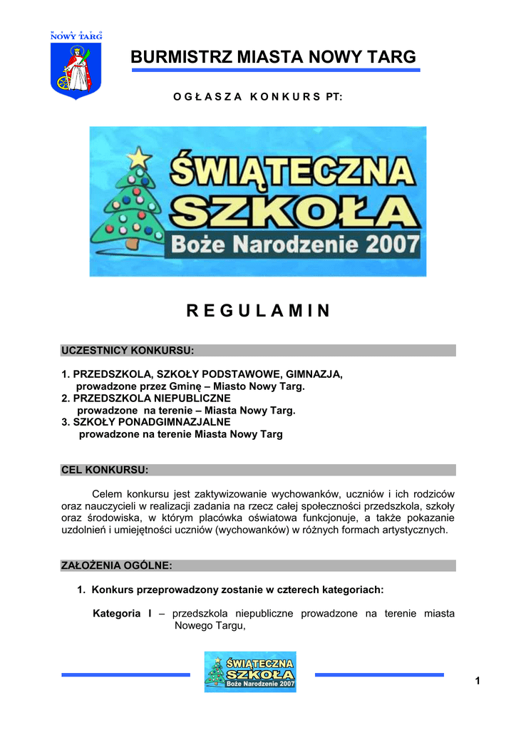 BURMISTRZ MIASTA NOWY TARG O G Ł A S Z A K O N K U R S PT: REGULAMIN UCZESTNICY KONKURSU: 1. PRZEDSZKOLA, SZKOŁY PODSTAWOWE, GIMNAZJA, prowadzone przez Gminę – Miasto Nowy Targ. 2. PRZEDSZKOLA NIEPUBLICZNE prowadzone na terenie – Miasta Nowy Targ. 3. SZKOŁY PONADGIMNAZJALNE prowadzone na terenie Miasta Nowy Targ CEL KONKURSU: Celem konkursu jest zaktywizowanie wychowanków, uczniów i ich rodziców oraz nauczycieli w realizacji zadania na rzecz całej społeczności przedszkola, szkoły oraz środowiska, w którym placówka oświatowa funkcjonuje, a takŜe pokazanie uzdolnień i umiejętności uczniów (wychowanków) w róŜnych formach artystycznych. ZAŁOśENIA OGÓLNE: 1. Konkurs przeprowadzony zostanie w czterech kategoriach: Kategoria I – przedszkola niepubliczne prowadzone na terenie miasta Nowego Targu, 1 Kategoria II – szkoły ponadgimnazjalne prowadzone na terenie miasta Nowy Targ Kategoria III – przedszkola i szkoły podstawowe prowadzone przez miasto Nowy Targ o liczbie nie większej niŜ 200 uczniów Kategoria IV – szkoły podstawowe, gimnazja prowadzone przez miasto Nowy Targ o liczbie powyŜej 200 uczniów. 2. Konkurs polegał będzie na wykonaniu przez uczniów (wychowanków) dekoracji świątecznej – o tematyce BoŜonarodzeniowej w szkole i na zewnątrz szkoły (przystrojeniu budynku szkoły, przedszkola) – dotyczy kategorii I, II, III, IV uczestników, oraz organizacji przedsięwzięcia/imprezy o wymiarze co najmniej szkolnym i o tematyce BoŜonarodzeniowe – dotyczy kategorii IV uczestników. 3. Pod pojęciem „w szkole” rozumie się sale lekcyjne, korytarze i inne pomieszczenia placówki pod warunkiem, Ŝe są one ogólnodostępne dla uczniów szkoły, 4. Pod pojęciem „na zewnątrz szkoły” rozumie się przystrojenie zewnętrzne elewacji budynku szkoły, wejścia do szkoły i pomieszczeń szkoły pod warunkiem, iŜ są one widoczne z zewnątrz budynku a takŜe przystrojenie dekoracjami świątecznymi terenu będącego w zarządzie szkoły. 5. Dekoracje świąteczne powinny w jak największym stopniu stanowić samodzielne prace uczniów (wychowanków). 6. Materiały dekoracyjne mogą zostać wykonane dowolną techniką plastyczną. Dopuszczalna jest równieŜ instalacja zakupionych, gotowych elementów dekoracyjnych. WARUNKI UCZESTNICTWA: 1. Zgłoszenie do konkursu w terminie określonym w niniejszym regulaminem, oraz według przyjętej karty zgłoszenia (karta w załączeniu) 2. Wyznaczenie przez dyrektora szkoły (przedszkola) spośród pracowników placówki Świątecznego Koordynatora Dekoracji (maksymalnie 2 osoby), odpowiedzialnego za synchronizację całości projektu i reprezentującego, wspólnie z uczniami, placówkę w konkursie. TERMINY: Zgłoszenia do konkursu: do 3 grudnia 2007r. Oceny dekoracji: w okresie od 15 do 27 grudnia 2007r. Ocena przedsięwzięcia: w terminie wskazanym przez uczestnika, w okresie od 15 do 27 grudnia 2007r. Rozstrzygnięcia konkursu i wręczenia nagród do końca 2007r. PRZEBIEG KONKURSU: 2 1. Dyrektor szkoły przystępującej do konkursu, po zapoznaniu się z Regulaminem, potwierdza udział w konkursie przesyłając, zgodnie z terminem określonym w regulaminie kartę zgłoszenia na adres: URZĄD MIASTA NOWY TARG WYDZIAŁ OŚWIATY ul. PARKOWA 14 2. Powołana Przez Burmistrza Miasta Nowego Targu Komisja dokona oceny wykonanych przez poszczególne placówki dekoracji świątecznych, a w przypadku uczestników IV kategorii dokona takŜe oceny sposobu oraz poziomu realizacji przedsięwzięcia, ze szczególnym uwzględnieniem następujących kryteriów : 2.1 DEKORACJA A) Oryginalność dekoracji, B) Estetyka dekoracji, C) Technika wykonania eksponowanych prac (stopień trudności wykonania), D) Stopień wkładu samodzielnej pracy uczniów, E) Zasięg (stopień udekorowania obiektu), F) Ekspozycja dekoracji (dostępność dla mieszkańców). 2.2 PRZEDSIĘWZIĘCIE A) Zasięg (liczba realizatorów, uczestników), B) Nowatorska forma, C) Poziom wykonania 3. Ocena wykonania dekoracji odbędzie się dwukrotnie: w dzień przy udziale przedstawiciela uczestnika konkursu i w porze nocnej (bez Jego udziału), 4. Ocena poziomu realizacji zgłoszonego przedsięwzięcia dokonana zostanie w terminie (dniu, godzinie) zgłoszonej przez uczestnika konkursu w deklaracji uczestnictwa. 5. Organizator konkursu zastrzega sobie prawo zmiany terminu oceny przedsięwzięcia oraz powołania odrębnych zespołów do oceny wykonania dekoracji i realizacji przedsięwzięcia. 6. Komisja oceniająca wykonane dekoracje i realizację przedsięwzięcia, sporządzi opinie, oraz opracuje protokół w którym zarekomenduje Burmistrzowi Miasta trzy kolejno najwyŜej ocenione placówki w poszczególnej kategorii uczestników, 7. Burmistrz Miasta Nowy Targ zatwierdza ocenę sporządzoną przez Komisję i dokona uroczystego wręczenia dyplomów oraz nagród. NAGRODY: Wyłonione w drodze postępowania konkursowego trzy najwyŜej ocenione placówki w ramach poszczególnych kategorii uczestników, otrzymają nagrody rzeczowe będące wyposaŜeniem lub pomocami dydaktycznowychowawczymi dla przedszkola, szkoły w : 3 Kategoria I I. miejsce – do kwoty 1.000 zł II. miejsce – do kwoty 800 zł III. miejsce – do kwoty 500 zł Kategoria II I. miejsce – do kwoty 1.500 zł II. miejsce – do kwoty 1.300zł III. miejsce – do kwoty 1.000zł Kategoria III I. miejsce – do kwoty 1.500 zł II. miejsce – do kwoty 1.300 zł III. miejsce – do kwoty 1.000 zł Kategoria IV I. miejsce – do kwoty 3.000 zł II. miejsce – do kwoty 2.000 zł III. miejsce – do kwoty 1.500 zł Wszyscy uczestnicy (placówki) otrzymają dyplomy uczestnictwa w konkursie, oraz atrakcyjne nagrody rzeczowe (pomoce dydaktyczne) o mniejszej wartości. Przekazanie (odbiór) nagród rzeczowych nastąpi za potwierdzeniem odbioru. O wynikach konkursu organizator poinformuje na stronie internetowej miasta Nowego Targu. 4