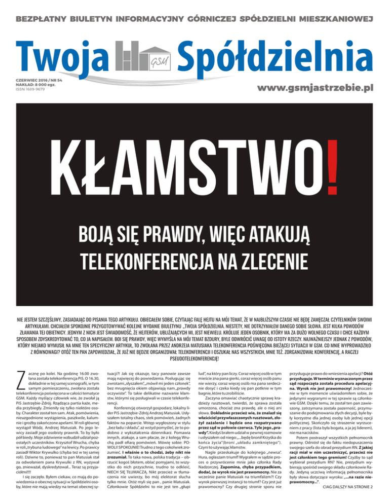 CZERWIEC 2016 / NR 54 NAKŁAD: 8 000 egz. Kłamstwo! BOJĄ SIĘ PRAWDY, WIĘC ATAKUJĄ TELEKONFERENCJA NA ZLECENIE NIE JESTEM SZCZĘŚLIWY, ZASIADAJĄC DO PISANIA TEGO ARTYKUŁU. OBIECAŁEM SOBIE, CZYTAJĄC FALĘ HEJTU NA MÓJ TEMAT, ŻE W NAJBLIŻSZYM CZASIE NIE BĘDĘ ZAMĘCZAŁ CZYTELNIKÓW SWOIMI ARTYKUŁAMI. CHCIAŁEM SPOKOJNIE PRZYGOTOWYWAĆ KOLEJNE WYDANIE BIULETYNU „TWOJA SPÓŁDZIELNIA. NIESTETY, NIE DOTRZYMAŁEM DANEGO SOBIE SŁOWA. JEST KILKA POWODÓW ZŁAMANIA TEJ OBIETNICY. JEDNYM Z NICH JEST ŚWIADOMOŚĆ, ŻE HEJTERÓW, UBLIŻAJĄCYCH MI, JEST NIEWIELU. KRÓLUJE JEDEN OSOBNIK, KTÓRY MA ZA DUŻO WOLNEGO CZASU I CHCE KAŻDYM SPOSOBEM ZDYSKREDYTOWAĆ TO, CO JA NAPISAŁEM. BOI SIĘ PRAWDY, WIĘC WYMYŚLA NA MÓJ TEMAT BZDURY, BYLE ODWRÓCIĆ UWAGĘ OD ISTOTY RZECZY. NAJWAŻNIEJSZY JEDNAK Z POWODÓW, KTÓRY NIEJAKO WYMUSIŁ NA MNIE TEN SPECYFICZNY ARTYKUŁ, TO ZWOŁANA PRZEZ ANDRZEJA MATUSIAKA TELEKONFERENCJA POŚWIĘCONA BIEŻĄCEJ SYTUACJI W GSM. CO MNIE WYPROWADZIŁO Z RÓWNOWAGI? OTÓŻ TEN PAN ZAPOWIEDZIAŁ, ŻE JUŻ NIE BĘDZIE ORGANIZOWAŁ TELEKONFERENCJI I OSZUKAŁ NAS WSZYSTKICH, MNIE TEŻ. ZORGANIZOWAŁ KONFERENCJĘ, A RACZEJ PSEUDOTELEKONFERENCJĘ! Z acznę po kolei. Na godzinę 16.00 zwołana została telekonferencja PiS. O 16.30, dokładnie w tej samej scenogra i, w tym samym pomieszczeniu, zwołana została telekonferencja poświęcona w całości tematyce GSM. Każdy myślący człowiek wie, że zwołał ją PiS Jastrzębie-Zdrój. Rządząca partia każe, media przybiegły. Zmieniły się tylko niektóre osoby. Charakter został ten sam. Atak, pomówienia, nieuzgodnione wystąpienia, paszkwile, kalumnie i groźby zakończone apelami. W roli głównej wystąpił Wódz, Andrzej Matusiak. Po jego lewicy zasiadł jego osobisty prawnik. To by było pół biedy. Moje zdziwienie wzbudził udział pozostałych uczestników. Krzysztof Wrucha, chyba w roli „trybuna ludowego” na lewicy. Po prawicy zasiadł Wiktor Krywulko (chyba też w tej samej roli). Dziwne to, ponieważ to pan Matusiak stał za odwołaniem pana Krywulki z RN, wyzywał go, znieważał, dyskredytował... Teraz są przyjaciółmi!!!! I się zaczęło. Byłem ciekaw, co mają do powiedzenia o obecnej sytuacji w Spółdzielni osoby, które nie mają wiedzy na temat obecnej sy- tuacji?! Jak się okazuje, tacy panowie zawsze mają najwięcej do powiedzenia. Posługując się zwrotami „słyszałem”, „mówił mi jeden członek”, bez mrugnięcia okiem objawiają nam „prawdy oczywiste”. To takie delikatne nazwanie kłamstw, którymi się posługiwali w czasie telekonferencji. Konferencję otworzył gospodarz, lokalny lider PiS Jastrzębie-Zdrój Andrzej Matusiak. Usłyszałem totalny chaos, stek pomówień, żadnych faktów na poparcie. Wstęp wygłoszony w stylu „bez ładu i składu”, aż wstyd pomyśleć, że to podobno z wykształcenia dziennikarz. Pomawia innych, atakuje, a sam płacze, że z kolegą Wruchą padł o arą pomówień. Mówię sobie: POWOLI! SPOKOJNIE! Trudno z tego cokolwiek zrozumieć. I właśnie o to chodzi, żeby nikt nie zrozumiał. To taka nowa, polska tradycja – obrzucić kogoś błotem, oblać pomyjami, to wszystko do nich przyschnie, trudno to odkleić, NIECH SIĘ TŁUMACZĄ. Nikt przecież w tłumaczenia nie uwierzy, bo mój elektorat słucha tylko mnie. Otóż myli się pan , panie Matusiak. Członkowie Spółdzielni to nie jest ten „głupi lud”, na który pan liczy. Coraz więcej osób w tym mieście zna pana gierki, coraz więcej osób panu nie wierzy, coraz więcej osób ma pana serdecznie dosyć i czeka kiedy się pan potknie w tym bagnie, które tu zrobiliście. Zaczyna omawiać chaotycznie sprawę kradzieży rusztowań, twierdzi, że sprawa została umorzona, chociaż zna prawdę, ale o niej ani słowa. Dokładnie przecież wie, że znalazł się właściciel przywłaszczonych rusztowań, złożył zażalenie i będzie ono rozpatrywane przez sąd w połowie czerwca. Tyle jego „prawdy”. Kiedyś brałem udział w pewnej rozmowie i usłyszałem od niego: „...będę bronił Krzyśka do końca życia”(broni „układu zamkniętego”). Czyni to używając kłamstw. Nagle przeskakuje do kolejnego „newsa”. Hura, ogłaszam triumf! Wygrałem w sądzie proces o przywrócenie mnie jako członka Rady Nadzorczej. Zapomina, chyba przypadkiem, dodać, że wyrok nie jest prawomocny. Nie za wcześnie panie Matusiak na triumfalizm?! Czy wyrok pierwszej instancji to triumf? Czy jest już prawomocny? Czy drugiej stronie sporu nie przysługuje prawo do wniesienia apelacji? Otóż przysługuje. W terminie wyznaczonym przez sąd rozpoczęta została procedura apelacyjna. Wyrok nie jest prawomocny! Jednocześnie w tym momencie uświadomiłem sobie, że jedynymi wygranymi w tej sprawie są członkowie GSM. Dzięki temu, że został ten pan zawieszony, zatrzymana została pazerność, przymuszanie do podejmowania złych decyzji, byle były korzystne dla jednej osoby lub jednej opcji politycznej. Skończyło się straszenie wyrzuceniem z pracy (lista była bogata, a ja jej liderem), nie ma nacisków. Potem postraszył wszystkich pełnomocnik prawny. Odniósł się do faktu niedopuszczenia swojego szefa do obrad prezydium RN. Z jakiej racji miał w nim uczestniczyć, przecież nie jest członkiem tego gremium! Czyżby to sąd wybierał prezydium RN? Nie, prezydium wybierają spośród swojego składu członkowie Rady. Jedyną uczciwą informacją pełnomocnika były słowa dotyczące wyroku: „...na razie nieprawomocny...”. CIAG DALSZY NA STRONIE 2 02 CIĄG DALSZY ZE STRONY 1 Teraz do głosu został dopuszczony „trybun ludowy” Krzysztof Wrucha. Ma przedstawić aktualną sytuację w GSM. Co ten pan wie o Spółdzielni od momentu zwolnienia dyscyplinarnego? Niewiele. Żeby uprawdopodobnić swoje wypowiedzi, powołuje się na jakieś informacje, od jakiegoś niesprecyzowanego członka RN. Zaczyna, oczywiście, od sprawy swojego zwolnienia. To od razu pokazuje, 