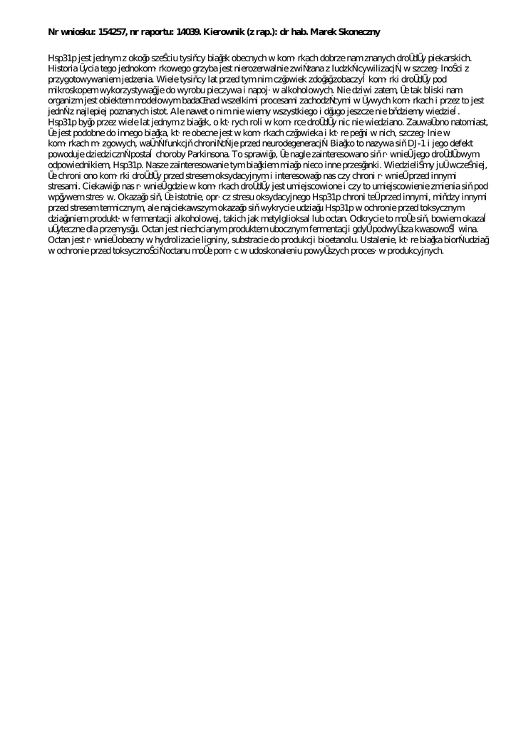 Nr wniosku: 154257, nr raportu: 14039. Kierownik (z rap.): dr hab. Marek Skoneczny Hsp31p jest jednym z około sześciu tysięcy białek obecnych w komórkach dobrze nam znanych drożdży piekarskich. Historia życia tego jednokomórkowego grzyba jest nierozerwalnie związana z ludzką cywilizacją, w szczególności z przygotowywaniem jedzenia. Wiele tysięcy lat przed tym nim człowiek zdołał zobaczyć komórki drożdży pod mikroskopem wykorzystywał je do wyrobu pieczywa i napojów alkoholowych. Nie dziwi zatem, że tak bliski nam organizm jest obiektem modelowym badań nad wszelkimi procesami zachodzącymi w żywych komórkach i przez to jest jedną z najlepiej poznanych istot. Ale nawet o nim nie wiemy wszystkiego i długo jeszcze nie będziemy wiedzieć. Hsp31p było przez wiele lat jednym z białek, o których roli w komórce drożdży nic nie wiedziano. Zauważono natomiast, że jest podobne do innego białka, które obecne jest w komórkach człowieka i które pełni w nich, szczególnie w komórkach mózgowych, ważną funkcję chroniącą je przed neurodegeneracją. Białko to nazywa się DJ-1 i jego defekt powoduje dziedziczną postać choroby Parkinsona. To sprawiło, że nagle zainteresowano się również jego drożdżowym odpowiednikiem, Hsp31p. Nasze zainteresowanie tym białkiem miało nieco inne przesłanki. Wiedzieliśmy już wcześniej, że chroni ono komórki drożdży przed stresem oksydacyjnym i interesowało nas czy chroni również przed innymi stresami. Ciekawiło nas również gdzie w komórkach drożdży jest umiejscowione i czy to umiejscowienie zmienia się pod wpływem stresów. Okazało się, że istotnie, oprócz stresu oksydacyjnego Hsp31p chroni też przed innymi, między innymi przed stresem termicznym, ale najciekawszym okazało się wykrycie udziału Hsp31p w ochronie przed toksycznym działaniem produktów fermentacji alkoholowej, takich jak metylglioksal lub octan. Odkrycie to może się, bowiem okazać użyteczne dla przemysłu. Octan jest niechcianym produktem ubocznym fermentacji gdyż podwyższa kwasowość wina. Octan jest również obecny w hydrolizacie ligniny, substracie do produkcji bioetanolu. Ustalenie, które białka biorą udział w ochronie przed toksycznością octanu może pomóc w udoskonaleniu powyższych procesów produkcyjnych.