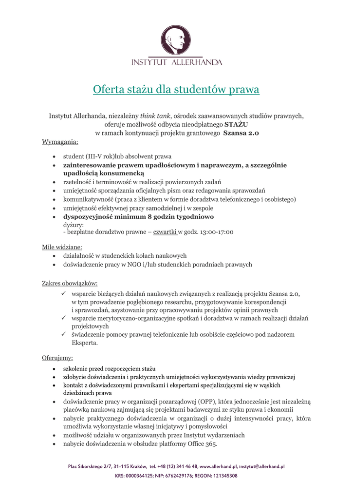 Oferta stażu dla studentów prawa Instytut Allerhanda, niezależny think tank, ośrodek zaawansowanych studiów prawnych, oferuje możliwość odbycia nieodpłatnego STAŻU w ramach kontynuacji projektu grantowego Szansa 2.0 Wymagania: student (III-V rok)lub absolwent prawa zainteresowanie prawem upadłościowym i naprawczym, a szczególnie upadłością konsumencką rzetelność i terminowość w realizacji powierzonych zadań umiejętność sporządzania oficjalnych pism oraz redagowania sprawozdań komunikatywność (praca z klientem w formie doradztwa telefonicznego i osobistego) umiejętność efektywnej pracy samodzielnej i w zespole dyspozycyjność minimum 8 godzin tygodniowo dyżury: - bezpłatne doradztwo prawne – czwartki w godz. 13:00-17:00 Mile widziane: działalność w studenckich kołach naukowych doświadczenie pracy w NGO i/lub studenckich poradniach prawnych Zakres obowiązków: wsparcie bieżących działań naukowych związanych z realizacją projektu Szansa 2.0, w tym prowadzenie pogłębionego researchu, przygotowywanie korespondencji i sprawozdań, asystowanie przy opracowywaniu projektów opinii prawnych wsparcie merytoryczno-organizacyjne spotkań i doradztwa w ramach realizacji działań projektowych świadczenie pomocy prawnej telefonicznie lub osobiście częściowo pod nadzorem Eksperta. Oferujemy: szkolenie przed rozpoczęciem stażu zdobycie doświadczenia i praktycznych umiejętności wykorzystywania wiedzy prawniczej kontakt z doświadczonymi prawnikami i ekspertami specjalizującymi się w wąskich dziedzinach prawa doświadczenie pracy w organizacji pozarządowej (OPP), która jednocześnie jest niezależną placówką naukową zajmującą się projektami badawczymi ze styku prawa i ekonomii nabycie praktycznego doświadczenia w organizacji o dużej intensywności pracy, która umożliwia wykorzystanie własnej inicjatywy i pomysłowości możliwość udziału w organizowanych przez Instytut wydarzeniach nabycie doświadczenia w obsłudze platformy Office 365. Plac Sikorskiego 2/7, 31-115 Kraków, tel. +48 (12) 341 46 48, www.allerhand.pl, [email protected] KRS: 0000364125; NIP: 6762429176; REGON: 121345308 Rozpoczęcie stażu: od zaraz Okres stażu: styczeń-marzec 2017 istnieje możliwość również przedłużenia stażu na kolejne miesiące CV prosimy przesyłać do dnia 22 grudnia 2016 r. na adres mailowy: [email protected] z dopiskiem „STAŻ Szansa 2.0” Szczegółowe warunki stażu ustalane są indywidualnie. Więcej informacji o projekcie na stronie http://szansadwazero.pl/ Plac Sikorskiego 2/7, 31-115 Kraków, tel. +48 (12) 341 46 48, www.allerhand.pl, [email protected] KRS: 0000364125; NIP: 6762429176; REGON: 121345308