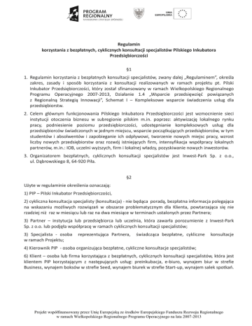 Regulamin korzystania z bezpłatnych, cyklicznych konsultacji specjalistów Pilskiego Inkubatora Przedsiębiorczości §1 1. Regulamin korzystania z bezpłatnych konsultacji specjalistów, zwany dalej „Regulaminem”, określa zakres, zasady i sposób korzystania z konsultacji realizowanych w ramach projektu pt. Pilski Inkubator Przedsiębiorczości, który został sfinansowany w ramach Wielkopolskiego Regionalnego Programu Operacyjnego 2007-2013, Działanie 1.4 „Wsparcie przedsięwzięć powiązanych z Regionalną Strategią Innowacji”, Schemat I – Kompleksowe wsparcie świadczenia usług dla przedsiębiorstw. 2. Celem głównym funkcjonowania Pilskiego Inkubatora Przedsiębiorczości jest wzmocnienie sieci instytucji otoczenia biznesu w subregionie pilskim m.in. poprzez: aktywizację lokalnego rynku pracy, podniesienie poziomu przedsiębiorczości, udostępnianie kompleksowych usług dla przedsiębiorców świadczonych w jednym miejscu, wsparcie początkujących przedsiębiorców, w tym studentów i absolwentów i zapobieganie ich odpływowi, tworzenie nowych miejsc pracy, wzrost liczby nowych przedsiębiorstw oraz rozwój istniejących firm, intensyfikacja współpracy lokalnych partnerów, m.in.: IOB, uczelni wyższych, firm i lokalnej władzy, pozyskiwanie nowych inwestorów. 3. Organizatorem bezpłatnych, cyklicznych konsultacji specjalistów jest Inwest-Park Sp. z o.o., ul. Dąbrowskiego 8, 64-920 Piła. §2 Użyte w regulaminie określenia oznaczają: 1) PIP – Pilski Inkubator Przedsiębiorczości, 2) cykliczna konsultacja specjalisty (konsultacja) - nie będąca poradą, bezpłatna informacja polegająca na wskazaniu możliwych rozwiązań w obszarze problematycznym dla Klienta, powtarzająca się nie rzadziej niż raz w miesiącu lub raz na dwa miesiące w terminach ustalonych przez Partnera; 3) Partner – instytucja lub przedsiębiorca lub uczelnia, która zawarła porozumienie z Inwest-Park Sp. z o.o. lub podjęła współpracę w ramach cyklicznych konsultacji specjalistów; 3) Specjalista - osoba w ramach Projektu; reprezentująca Partnera, świadcząca bezpłatne, cykliczne konsultacje 4) Kierownik PIP - osoba organizująca bezpłatne, cykliczne konsultacje specjalistów; 6) Klient – osoba lub firma korzystająca z bezpłatnych, cyklicznych konsultacji specjalistów, która jest klientem PIP korzystającym z następujących usług: preinkubacja, e-biuro, wynajem biur w strefie Business, wynajem boksów w strefie Seed, wynajem biurek w strefie Start-up, wynajem salek spotkań. Projekt współfinansowany przez Unię Europejską ze środków Europejskiego Funduszu Rozwoju Regionalnego w ramach Wielkopolskiego Regionalnego Programu Operacyjnego na lata 2007-2013 §3 1. Bezpłatne cykliczne konsultacje specjalistów realizowane są na mocy porozumień o współpracy zawartych z następującymi Partnerami: Państwową Wyższą Szkołą Zawodową im. Stanisława Staszica w Pile, Wielkopolską Agencją Rozwoju Przedsiębiorczości Sp. z o.o., Biurem Rachunkowo-Konsultingowym Sławomir Czerniel, EXELIOR Mirosław Kałuża, Sky Coaching Damian Rozmarynowski, Poligrafia-Promocja-Reklama STUDIO K2, Kancelariami Adwokackimi - adw. Dariusz Grabarczyk, adw. Arkadiusz Drabik, adw. Mateusz Nowaczyk, Kancelarią Patentową Elżbieta Majcherczak. 2. Do współpracy w ramach konsultacji został zaproszony Urząd Skarbowy w Pile, zwany także Partnerem. 3. W celu świadczenia konsultacji Partnerzy wyznaczają Specjalistów i wskazują następujące obszary konsultacji: PRAWNIK - prawo gospodarcze, SPECJALISTA DS. POZYSKIWANIA FUNDUSZY - pozyskiwanie funduszy dla firmy, KSIĘGOWY - księgowość i podatki, ASYSTENT PODATNIKA - administracja podatkowa, e-deklaracje, DYREKTOR CENTRUM TRANSFERU TECHNOLOGII - transfer technologii do firmy, DORADCA BIZNESOWY - biznes plan i dotacje, SPECJALISTA DS. REKLAMY I MARKETINGU - marketing i promocja, RZECZNIK PATENTOWY - prawo własności intelektualnej, CERTYFIKOWANY COACH Noble Manhattan Coaching - warsztaty grupowe lub indywidualne o tematyce: „Wizja i cele działalności gospodarczej” „Strategia rozwoju biznesu” „Priorytety i plan działania” „Potencjalne przeszkody i ich eliminacja” „Kompetencje współczesnego menedżera” 4. Konsultacje udzielane są podczas indywidualnych spotkań Klienta ze Specjalistą w siedzibie Pilskiego Inkubatora Przedsiębiorczości, w terminach wyznaczonych przez Partnerów. 5. W celu skorzystania z bezpłatnych konsultacji specjalistów należy wypełnić Formularz zgłoszeniowy stanowiący załącznik nr 1 do niniejszego Regulaminu oraz przesłać na adres e-mail: Projekt współfinansowany przez Unię Europejską ze środków Europejskiego Funduszu Rozwoju Regionalnego w ramach Wielkopolskiego Regionalnego Programu Operacyjnego na lata 2007-2013 [email protected], lub dostarczyć pocztą albo osobiście do Inwest-Park Sp. z o. o., ul. Dąbrowskiego 8, 64-920 Piła. 6. Potwierdzenie terminu konsultacji nastąpi mailowo lub telefonicznie w ciągu maksymalnie 5 dni od otrzymania Formularza zgłoszeniowego. 7. Data konsultacji zostanie ustalona w terminie nie dłuższym niż 14 dni od daty otrzymania Formularza zgłoszeniowego. §4 1. Warunkiem skorzystania z konsultacji jest wyrażenie zgody na przetwarzanie danych osobowych zawartych w Formularzu zgłoszeniowym przez Inwest-Park Sp. z o.o., zgodnie z ustawą z dnia 29.08.1997 r. o ochronie danych osobowych. (Dz. U. z 2002 r. nr 101, poz.926 z późn. zm.). 2. Potwierdzeniem skorzystania z konsultacji będzie Karta konsultacji stanowiąca załącznik nr 2 do niniejszego Regulaminu, wypełniana przez Specjalistę, podpisana przez Klienta. 3. Po skorzystaniu z konsultacji Klient weźmie udział w dobrowolnym badaniu zadowolenia klientów PIP. 4. Klienci, którzy skorzystają z konsultacji nabywają prawo do rabatów cenowych na usługi płatne Partnerów wykraczające poza zakres bezpłatnych konsultacji. Wysokość rabatu cenowego zostanie uzg