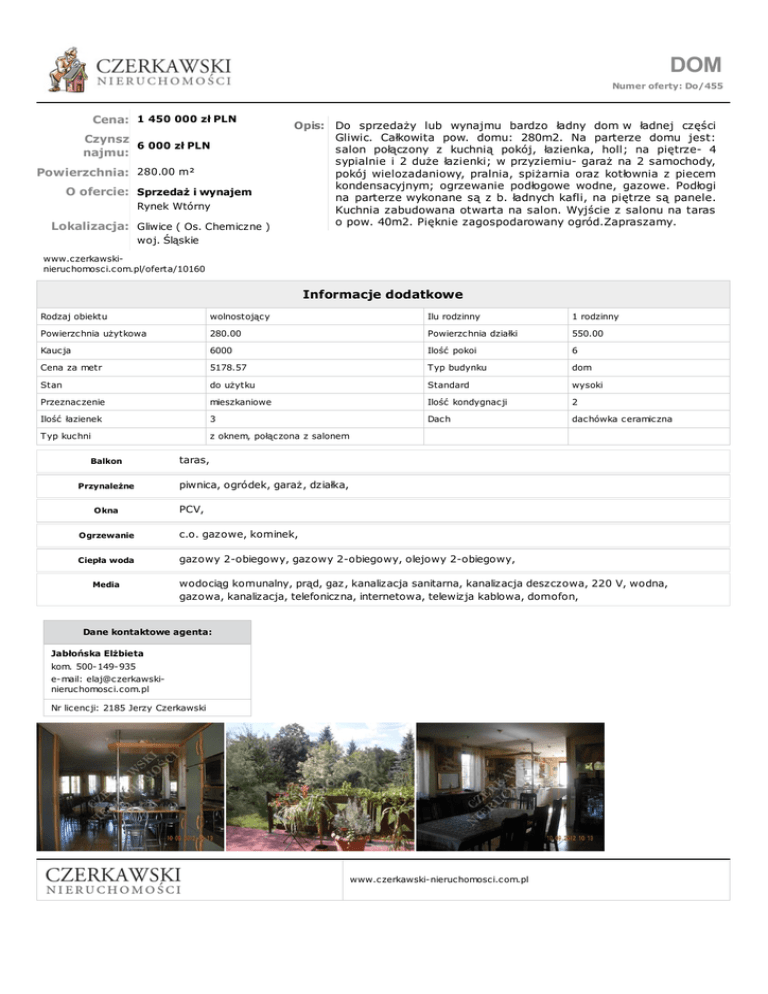 DOM Numer oferty: Do/455 Cena: 1 450 000 zł PLN Czynsz 6 000 zł PLN najmu: Powierzchnia: 280.00 m² O ofercie: Sprzedaż i wynajem Rynek Wtórny Lokalizacja: Gliwice ( Os. Chemiczne ) Opis: Do sprzedaży lub wynajmu bardzo ładny dom w ładnej części Gliwic. Całkowita pow. domu: 280m2. Na parterze domu jest: salon połączony z kuchnią pokój, łazienka, holl; na piętrze- 4 sypialnie i 2 duże łazienki; w przyziemiu- garaż na 2 samochody, pokój wielozadaniowy, pralnia, spiżarnia oraz kotłownia z piecem kondensacyjnym; ogrzewanie podłogowe wodne, gazowe. Podłogi na parterze wykonane są z b. ładnych kafli, na piętrze są panele. Kuchnia zabudowana otwarta na salon. Wyjście z salonu na taras o pow. 40m2. Pięknie zagospodarowany ogród.Zapraszamy. woj. Śląskie www.czerkawskinieruchomosci.com.pl/oferta/10160 Informacje dodatkowe Rodzaj obiektu wolnostojący Ilu rodzinny 1 rodzinny Powierzchnia użytkowa 280.00 Powierzchnia działki 550.00 Kaucja 6000 Ilość pokoi 6 Cena za metr 5178.57 Typ budynku dom Stan do użytku Standard wysoki Przeznaczenie mieszkaniowe Ilość kondygnacji 2 Ilość łazienek 3 Dach dachówka ceramiczna Typ kuchni z oknem, połączona z salonem Balkon Przynależne Okna taras, piwnica, ogródek, garaż, działka, PCV, Ogrzewanie c.o. gazowe, kominek, Ciepła woda gazowy 2-obiegowy, gazowy 2-obiegowy, olejowy 2-obiegowy, Media wodociąg komunalny, prąd, gaz, kanalizacja sanitarna, kanalizacja deszczowa, 220 V, wodna, gazowa, kanalizacja, telefoniczna, internetowa, telewizja kablowa, domofon, Dane kontaktowe agenta: Jabłońska Elżbieta kom. 500-149-935 e-mail: [email protected] Nr licencji: 2185 Jerzy Czerkawski www.czerkawski-nieruchomosci.com.pl