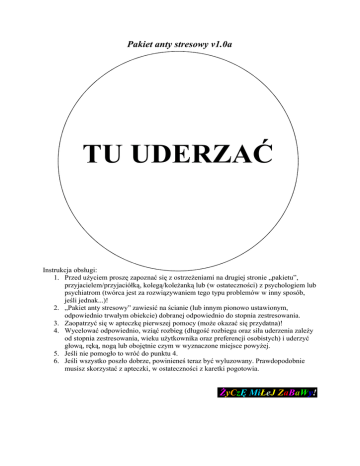 Pakiet anty stresowy v1.0a TU UDERZAĆ Instrukcja obsługi: 1. Przed użyciem proszę zapoznać się z ostrzeżeniami na drugiej stronie „pakietu”, przyjacielem/przyjaciółką, kolegą/koleżanką lub (w ostateczności) z psychologiem lub psychiatrom (twórca jest za rozwiązywaniem tego typu problemów w inny sposób, jeśli jednak...)! 2. „Pakiet anty stresowy” zawiesić na ścianie (lub innym pionowo ustawionym, odpowiednio trwałym obiekcie) dobranej odpowiednio do stopnia zestresowania. 3. Zaopatrzyć się w apteczkę pierwszej pomocy (może okazać się przydatna)! 4. Wycelować odpowiednio, wziąć rozbieg (długość rozbiegu oraz siła uderzenia zależy od stopnia zestresowania, wieku użytkownika oraz preferencji osobistych) i uderzyć głową, ręką, nogą lub obojętnie czym w wyznaczone miejsce powyżej. 5. Jeśli nie pomogło to wróć do punktu 4. 6. Jeśli wszystko poszło dobrze, powinieneś teraz być wyluzowany. Prawdopodobnie musisz skorzystać z apteczki, w ostateczności z karetki pogotowia. ŻyCzĘ MiŁeJ ZaBaWy! Uwagi i ostrzeżenia dotyczące „pakietu anty stresowego” w wersji 1.0a (testowej): 1. Twórca nie ponosi odpowiedzialności za jakiekolwiek szkody powstałe w wyniku użytkowania niniejszego „pakietu”. Działasz na własną odpowiedzialność!!! 2. Autor zastrzega sobie, że użytkownik zostaje ostrzeżony o możliwości uszkodzenia pakietu, ściany czy siebie samego! 3. Pakiet jest darmowy, możesz go powielać dowoli lecz autor zastrzega sobie, że każda kopia „pakietu” musi zawierać wszystkie elementy oryginału (instrukcje, tarcze i ostrzeżenia). 4. Autor nie udziela użytkownikowi jakiejkolwiek gwarancji przydatności do użytku „pakietu”. Autor nie ponosi konsekwencji wynikających z działania osób korzystających z „pakietu”. Przed użyciem pakietu twórca zaleca rozmowę o tym co nas dręczy, stresuje z przyjacielem, kolegą w ostateczności z psychologiem lub psychiatrom.