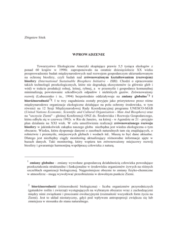 Zbigniew Sitek WPROWADZENIE Towarzystwo Ekologiczne Ameryki skupiające prawie 5,5 tysiąca ekologów z ponad 60 krajów w 1990r. zaproponowaáo na ostatnie dziesiĊciolecie XX wieku przeprowadzenie badaĔ miĊdzynarodowych nad rozwojem gospodarczym ukierunkowanym na ochronĊ biosfery, czyli badaĔ nad zrównowaĪonym ksztaátowaniem (rozwojem) biosfery (International Sustainable Biosphere Initiative - ISBI). Chodzi o opracowanie takich technologii proekologicznych, które nie degradują ekosystemów (a gáównie gleb i wód) w trakcie produkcji rolnej, leĞnej, rybnej, a w przemyĞle i gospodarce komunalnej minimalizują powstawanie szkodliwych odpadów i niektórych gazów. ZrównowaĪony 1 rozwój (Lubaszenko i in., 1994) bezpoĞrednio oddziaáywuje na zmiany globalne ) i 2 bioróĪnorodnoĞü ). I te trzy zagadnienia zostaáy przyjĊte jako priorytetowe przez róĪne miĊdzynarodowe organizacje ekologiczne dziaáające na polu ochrony Ğrodowiska, w tym równieĪ na 12 Sesji MiĊdzynarodowej Rady Koordynacyjnej programu UNESCO-MAB (United Nations Economic, Scientific and Cultural Organization - Man And Biosphere) oraz na "szczycie Ziemi" - gáoĞnej Konferencji ONZ ds. ĝrodowiska i Rozwoju Gospodarczego, która odbyáa siĊ w czerwcu 1992r. w Rio de Janeiro, na której - w Agendzie nr 21 - przyjĊto plan dziaáania na XXI wiek. W celu umoĪliwienia realizacji zrównowaĪonego rozwoju biosfery w jakimkolwiek zakątku naszego globu niezbĊdna jest wiedza ekologiczna o tym obszarze. Wiedza, która dysponuje danymi o zasobach naturalnych tam siĊ znajdujących, o rolnictwie i przemyĞle, miejscowych glebach i wodach itd.. Muszą to byü dane aktualne. Dlatego jest niezbĊdny ciągáy monitoring aktualizujący róĪnorodne informacje ujĊte w bazach danych. Taki monitoring, który wspiera ten zrównowaĪony miejscowy rozwój biosfery i gwarantuje harmonijną wspóápracĊ czáowieka z naturą. 1 zmiany globalne - zmiany wywoáane gospodarczą dziaáalnoĞcią czáowieka powodujące przeksztaácenia strukturalne i funkcjonalne w Ğrodowisku organizmów Īywych na róĪnych szczeblach organizacji biologicznej. NajgroĨniejsze obecnie to zmiany fizyko-chemiczne w atmosferze - mogą wywoáywaü przeobraĪenia w dowolnym punkcie Ziemi. 2 bioróĪnorodnoĞü (róĪnorodnoĞü biologiczna) - liczba organizmów przyrodniczych (gatunków roĞlin i zwierząt) wystĊpujących na wybranym obszarze wraz z zachodzącymi miĊdzy nimi związkami i procesami ewolucyjnymi (rozmaitoĞü wszystkich form Īycia na Ziemi). Jest to ukáad niestatyczny, gdyĪ pod wpáywem antropopresji zwiĊksza siĊ lub zmniejsza w stosunku do stanu naturalnego. Prowadzone w ramach niniejszego projektu KBN badania są zgodne z tendencjami Ğwiatowymi - realizują program UNESCO-MAB. Omawiany projekt badawczy KBN miaá do zrealizowania nastĊpujące zadania badawcze: 1. Opracowanie numerycznego modelu terenu (NMT) dla czĊĞci województwa krakowskiego jako elementu bazy danych. 2. Zakupienie digitajzera formatu A0 lub A1 oraz drukarki kolorowej z wyposaĪeniem. 3. Zakupienie 2 scen okolic Krakowa ze skanera TM LANDSAT-a z lat 1990-1992 oraz ERS-1. 4. Opracowanie metodyki zasilania bazy danych GIS pozyskiwanych bezpoĞrednio i teledetekcyjnie wraz z opracowaniem programów do konwersji tych danych do postaci nadającej siĊ do systemu IDRISI (amerykaĔski) . 5. Ocena przydatnoĞci pakietów GIS i róĪnych technik manipulowania danymi do analiz i prezentacji róĪnych elementów skaĪenia Ğrodowiska i ich wzajemnej korelacji. 6. Wypeánianie wielowarstwowej (przestrzennej) bazy danych wybranego obszaru woj. krakowskiego wraz z digitalizacją materiaáów Ĩródáowych. 7. Zakupienie skanera z urządzeniami uzupeániającymi. 8. Skonfigurowanie stanowiska komputerowego dla potrzeb oprogramowania typu GIS i baz danych oraz rozszerzenie pamiĊci drukarki kolorowej. 9. Zasilanie (pozyskiwanie, gromadzenie, aktualizacja i korekcja) bazy danych GIS o elementy skaĪenia Ğrodowiska (np. wody podziemne i powierzchniowe, przypowierzchniowa warstwa atmosfery, itp). 10.Opracowanie przykáadów przedstawiania i rozpowszechniania informacji o stanie Ğrodowiska z wykorzystaniem pakietów GIS (oraz publikacja). 11.Wybór optymalnych cech z bazy danych do analizy lub klasyfikacji zjawisk ekologicznych przy zastosowaniu statystycznej dyskryminacji obserwacji wielowymiarowych. W ramach niniejszego projektu przeprowadzono badania na obszarze okoáo 1500 km2 wokóá Krakowa. Obszar ten stanowi poligon badawczy i moĪe staü siĊ czĊĞcią duĪego "regionu-laboratorium", jakie w najbliĪszym czasie mają byü powoáane w ramach cytowanego programu UNESCO (International 1993). Takie poligony mają dostarczaü danych do wiedzy o utrzymaniu biosfery i powinny wspomagaü planowanie uĪytkowania ziemi wraz z odpowiednim zrównowaĪonym rozwojem gospodarczym ujmującym mieszaninĊ form strukturalnych i funkcjonalnych, z odpowiednio szerokim uwarunkowaniem ekologicznym. Pozyskana informacja o Ğrodowisku przyrodniczym powinna zostaü w peáni wykorzystana do ksztaátowania áadu ekologicznego w przestrzeni geograficznej. Przeprowadzone badania i zebrane w czasie ich trwania dane moĪna wáączyü do Globalnego Systemu Obserwacyjnego Ziemi (Global Terrestrial Observing System GTOS) - jaki w ramach przyszáego programu zamierza powoáaü UNESCO-MAB dla monitorowania zmian globalnych. GTOS jest jednym z piĊciu zasadniczych obszarów przyszáego dziaáania programu MAB obok takich priorytetowych zadaĔ jak : (International, 1993): - sprawowanie ochrony nad bioróĪnorodnoĞcią i procesami ekologicznymi, - poszukiwaĔ zmierzających do planowania uĪytkowania ziemi i podtrzymywania umiejĊtnego korzystania z zasobów naturalnych, - formowanie i rozpowszechnianie polityki informacyjnej o zrównowaĪonym wykorzystaniu zasobów naturalnych, - budowanie ludzkiej i instytucjonalnej odpowiedzialnoĞci w odniesieniu do planowania uĪytkowania ziemi i korzystania
