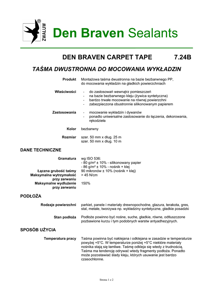 Den Braven Sealants DEN BRAVEN CARPET TAPE 7.24B TAŚMA DWUSTRONNA DO MOCOWANIA WYKŁADZIN Produkt Montażowa taśma dwustronna na bazie bezbarwnego PP, do mocowania wykładzin na gładkich powierzchniach Właściwości - do zastosowań wewnątrz pomieszczeń na bazie bezbarwnego kleju (żywica syntetyczna) bardzo trwałe mocowanie na równej powierzchni zabezpieczona obustronnie silikonowanym papierem Zastosowania - mocowanie wykładzin i dywanów ponadto uniwersalne zastosowanie do łączenia, dekorowania, rękodzieła Kolor Rozmiar bezbarwny szer. 50 mm x dług. 25 m szer. 50 mm x dług. 10 m DANE TECHNICZNE Gramatura Łączna grubość taśmy Maksymalna wytrzymałość przy zerwaniu Maksymalne wydłużenie przy zerwaniu wg ISO 536: - 80 g/m² ± 10% - silikonowany papier - 86 g/m² ± 10% - nośnik + klej 90 mikronów ± 10% (nośnik + klej) > 45 N/cm 150% PODŁOŻA Rodzaje powierzchni Stan podłoża parkiet, panele i materiały drewnopochodne, glazura, terakota, gres, stal, metale, tworzywa np. wykładziny syntetyczne, gładkie posadzki Podłoże powinno być nośne, suche, gładkie, równe, odtłuszczone pozbawione kurzu i tym podobnych warstw antyadhezyjnych. SPOSÓB UŻYCIA Temperatura pracy Taśma powinna być naklejana i odklejana w zasadzie w temperaturze powyżej +5°C. W temperaturze poniżej +5°C niektóre materiały nośnika stają się łamliwe. Taśmę odkleja się wtedy z trudnością. Taśma ma tendencję odrywać wtedy fragmenty podłoża. Ponadto może pozostawiać ślady kleju, których usuwanie jest bardzo czasochłonne. Strona 1 z 2 DEN BRAVEN CARPET TAPE, 7.24B Zalecenia i ograniczenia W razie potrzeby taśmę zaleca się odrywać pod kątem ok. 40°. Jeżeli taśma pozostała na podłożu dłuższy czas, przy jej odklejaniu należy ją ciągnąć wolno, w razie konieczności zmieniając kąt pod którym jest ciągnięta. Na elementach drewnianych (dotyczy zwłaszcza lakierów akrylowych) zaleca się przeprowadzenie testu z uwagi na możliwość odłupywania się elementów lakieru. Należy sprawdzić czy stara powłoka farby jest wystarczającą wytrzymała na odklejenie taśmy. W tym celu należy zrobić rysę ostrym narzędziem oraz wykonać próbę z taśmą: przykleić z silnym dociskiem ok. 10 cm kawałek, a potem oderwać go szybkim ruchem. W przypadku tworzyw sztucznych może sporadycznie dochodzić do odbarwień i pęknięć z powodu starzenia się materiału - dotyczy to starych profili z PCW, dlatego zaleca się zabezpieczenie profilu taśmą na całej powierzchni, co zniweluje widoczne zmiany. Przy powierzchniach metalowych należy skrócić czas przyklejenia taśmy do minimum z uwagi na możliwość reakcji pomiędzy klejem a powierzchnią. Dotyczy to zwłaszcza miedzi, cynku, ołowiu. W wypadku kamienia naturalnego o strukturze zlepionej (np. marmur) lub kamienia sztucznego odradza się stosowanie taśm w ogóle. Taśma naklejona nawet przez krótki czas może powodować przebarwienia powierzchni w miejscu przylegania. W wypadku powierzchni z aluminium anodyzowanego jeżeli jakość aluminium jest niska, to po odklejeniu taśmy na elementach aluminiowych (profile okienne, drzwiowe, rolety, żaluzje, szyny) mogą pozostać spore resztki kleju. Dlatego przed naklejeniem taśmy zaleca się przetrzeć powierzchnię aluminium szmatka nasączoną tuszem. Jeżeli po wytarciu widoczne są ślady tuszu, świadczy to o tym, że powierzchnia nie została prawidłowo zabezpieczona. Taśmę można przyklejać tylko po przeprowadzeniu odpowiedniej próby. W razie problemów, gdy materiał nośnika jest łamliwy, łatwo ulega rozdarciu, masa klejąca jest delikatnie utwardzona, dobrym rozwiązaniem jest ogrzać taśmę suszarką do włosów i delikatnie odkleić. Jeżeli z jakichś przyczyn taśma została zastosowana wbrew zaleceniom i właściwościom, jej odlepienie może sprawić trudności w postaci warstwy kleju pozostałej na ochranianej powierzchni, to można zastosować do jego usunięcia następujące rozpuszczalniki lub ich mieszaniny: - eter naftowy - octan etylu i ksylenu w stosunku 1:1 - alkohol, eter naftowy i aceton w proporcji 4:4:2 Użycie ww. rozpuszczalników oraz ich mieszanin nie powoduje rozpuszczenia masy klejącej, a jedynie jej zmiękczenie. Dlatego całkowite usunięcie kleju zaleca się dokonać przy użyciu plastikowej szpachelki lub szmatki nasączonej odpowiednim środkiem. Zawsze należy wykonać uprzednio próbę w mniej widocznym miejscu w celu upewnienia się, czy powierzchnia nie zostanie uszkodzona. Odpowiedzialność: Podane informacje są wynikiem badań i doświadczeń Den Braven Sealants, co jest podstawą ich rzetelności i wiarygodności. Producent nie mógł przewidzieć jednak wszystkich możliwości zastosowania swoich produktów, a ponieważ sposób użycia produktów jest całkowicie poza jego kontrolą, użytkownik bierze na siebie odpowiedzialność za właściwy wybór i zastosowanie produktu. Producent nie bierze na siebie odpowiedzialności za występujące uszkodzenia lub zły stan podłoża, które mogą być wynikiem czynników atmosferycznych, przygotowania wstępnego lub wad konstrukcyjnych. 12/03/2010 Strona 2 z 2