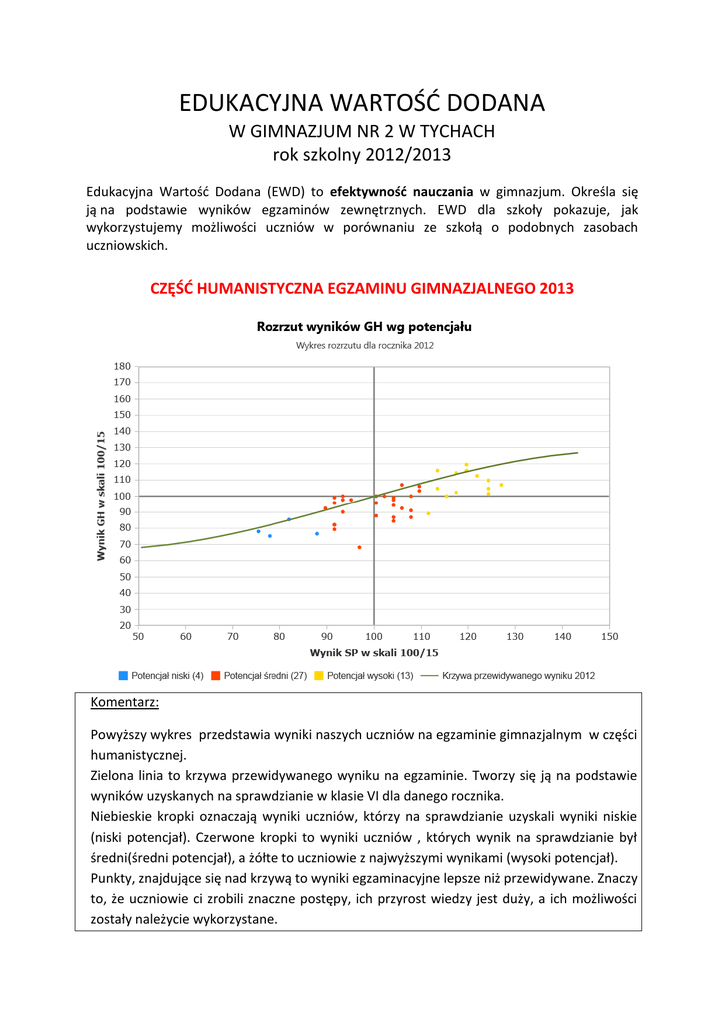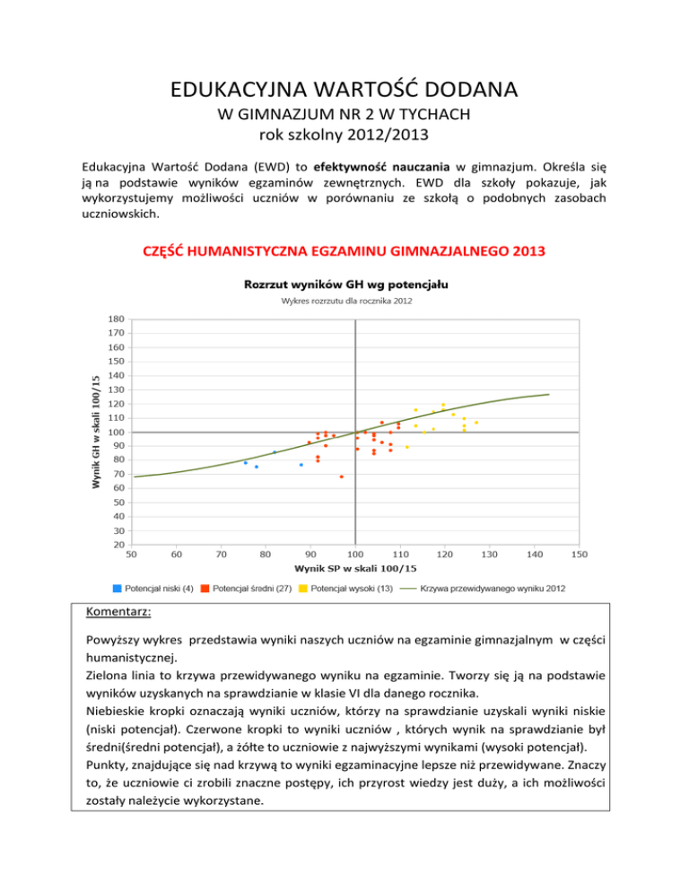 EDUKACYJNA WARTOŚĆ DODANA W GIMNAZJUM NR 2 W TYCHACH rok szkolny 2012/2013 Edukacyjna Wartość Dodana (EWD) to efektywność nauczania w gimnazjum. Określa się ją na podstawie wyników egzaminów zewnętrznych. EWD dla szkoły pokazuje, jak wykorzystujemy możliwości uczniów w porównaniu ze szkołą o podobnych zasobach uczniowskich. CZĘŚĆ HUMANISTYCZNA EGZAMINU GIMNAZJALNEGO 2013 Komentarz: Powyższy wykres przedstawia wyniki naszych uczniów na egzaminie gimnazjalnym w części humanistycznej. Zielona linia to krzywa przewidywanego wyniku na egzaminie. Tworzy się ją na podstawie wyników uzyskanych na sprawdzianie w klasie VI dla danego rocznika. Niebieskie kropki oznaczają wyniki uczniów, którzy na sprawdzianie uzyskali wyniki niskie (niski potencjał). Czerwone kropki to wyniki uczniów , których wynik na sprawdzianie był średni(średni potencjał), a żółte to uczniowie z najwyższymi wynikami (wysoki potencjał). Punkty, znajdujące się nad krzywą to wyniki egzaminacyjne lepsze niż przewidywane. Znaczy to, że uczniowie ci zrobili znaczne postępy, ich przyrost wiedzy jest duży, a ich możliwości zostały należycie wykorzystane. Na wykresie widać, że uczniowie w ogromnej większości napisali egzamin w części humanistyczną poniżej swoich możliwości, mimo iż wyniki osiągnięte na egzaminie w roku szkolnym 2012/2013 były wyższe niż w poprzednim roku. Jak wynika z wykresu ogromną większość stanowili uczniowie ze średnim i wysokim potencjałem (kolor czerwony i żółty), stąd punktowe wyniki uczniów w porównaniu z rokiem 2011/12 są dużo lepsze, ale efektywność gorsza niż w roku ubiegłym, w którym potencjał uczniów był niższy. Pozycja szkoły ze względu na wskaźniki wyniku końcowego i edukacyjnej wartości dodanej. 1. Wskaźniki obliczone na podstawie danych egzaminacyjnych z lat 2011-2013. Liczba zdających, których wyniki uwzględniono w analizie: 143. 2. Wskaźniki obliczone na podstawie danych egzaminacyjnych z lat 2010-2012. Liczba zdających, których wyniki uwzględniono w analizie: 164. Komentarz: Na wykresie widać pozycję naszej szkoły w kolejnych dwóch latach. Jesteśmy szkołą wspierającą, tzn. wspieramy uczniów, aby osiągali dobre wyniki i rozwijali się na miarę swoich możliwości. Mimo tego, że średnia ilość punktów uzyskanych na egzaminie przez naszych uczniów jest wyższa niż w roku ubiegłym, to efektywność spadła, ponieważ większość uczniów o dużych potencjalnych możliwościach napisała egzamin z wynikiem poniżej oczekiwań. Uczniowie ci nie wykorzystali maksymalnie swojego potencjału, co niekorzystnie odbiło się na edukacyjnej wartości dodanej. Podjęto zatem działania zmierzające do lepszej, efektywniejszej pracy z uczniem o dużych i średnich możliwościach.