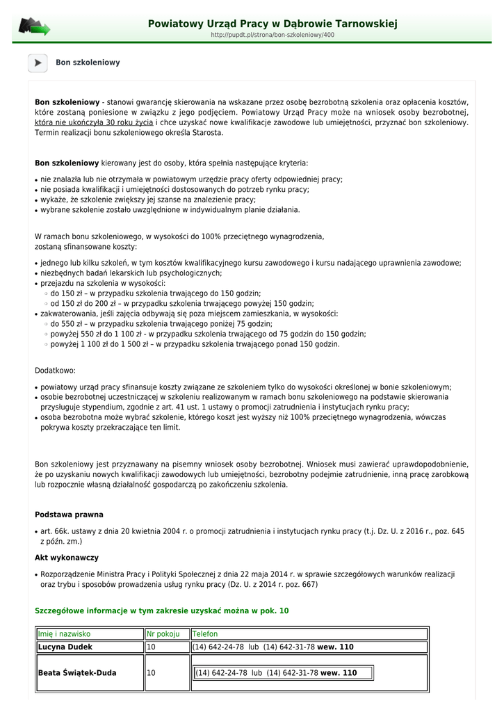 Powiatowy Urząd Pracy w Dąbrowie Tarnowskiej http://pupdt.pl/strona/bon-szkoleniowy/400 Bon szkoleniowy Bon szkoleniowy - stanowi gwarancję skierowania na wskazane przez osobę bezrobotną szkolenia oraz opłacenia kosztów, które zostaną poniesione w związku z jego podjęciem. Powiatowy Urząd Pracy może na wniosek osoby bezrobotnej, która nie ukończyła 30 roku życia i chce uzyskać nowe kwalifikacje zawodowe lub umiejętności, przyznać bon szkoleniowy. Termin realizacji bonu szkoleniowego określa Starosta. Bon szkoleniowy kierowany jest do osoby, która spełnia następujące kryteria: ● ● ● ● nie znalazła lub nie otrzymała w powiatowym urzędzie pracy oferty odpowiedniej pracy; nie posiada kwalifikacji i umiejętności dostosowanych do potrzeb rynku pracy; wykaże, że szkolenie zwiększy jej szanse na znalezienie pracy; wybrane szkolenie zostało uwzględnione w indywidualnym planie działania. W ramach bonu szkoleniowego, w wysokości do 100% przeciętnego wynagrodzenia, zostaną sfinansowane koszty: ● ● ● jednego lub kilku szkoleń, w tym kosztów kwalifikacyjnego kursu zawodowego i kursu nadającego uprawnienia zawodowe; niezbędnych badań lekarskich lub psychologicznych; przejazdu na szkolenia w wysokości: do 150 zł – w przypadku szkolenia trwającego do 150 godzin; od 150 zł do 200 zł – w przypadku szkolenia trwającego powyżej 150 godzin; zakwaterowania, jeśli zajęcia odbywają się poza miejscem zamieszkania, w wysokości: do 550 zł – w przypadku szkolenia trwającego poniżej 75 godzin; powyżej 550 zł do 1 100 zł - w przypadku szkolenia trwającego od 75 godzin do 150 godzin; powyżej 1 100 zł do 1 500 zł – w przypadku szkolenia trwającego ponad 150 godzin. ❍ ❍ ● ❍ ❍ ❍ Dodatkowo: ● ● ● powiatowy urząd pracy sfinansuje koszty związane ze szkoleniem tylko do wysokości określonej w bonie szkoleniowym; osobie bezrobotnej uczestniczącej w szkoleniu realizowanym w ramach bonu szkoleniowego na podstawie skierowania przysługuje stypendium, zgodnie z art. 41 ust. 1 ustawy o promocji zatrudnienia i instytucjach rynku pracy; osoba bezrobotna może wybrać szkolenie, którego koszt jest wyższy niż 100% przeciętnego wynagrodzenia, wówczas pokrywa koszty przekraczające ten limit. Bon szkoleniowy jest przyznawany na pisemny wniosek osoby bezrobotnej. Wniosek musi zawierać uprawdopodobnienie, że po uzyskaniu nowych kwalifikacji zawodowych lub umiejętności, bezrobotny podejmie zatrudnienie, inną pracę zarobkową lub rozpocznie własną działalność gospodarczą po zakończeniu szkolenia. Podstawa prawna ● art. 66k. ustawy z dnia 20 kwietnia 2004 r. o promocji zatrudnienia i instytucjach rynku pracy (t.j. Dz. U. z 2016 r., poz. 645 z późn. zm.) Akt wykonawczy ● Rozporządzenie Ministra Pracy i Polityki Społecznej z dnia 22 maja 2014 r. w sprawie szczegółowych warunków realizacji oraz trybu i sposobów prowadzenia usług rynku pracy (Dz. U. z 2014 r. poz. 667) Szczegółowe informacje w tym zakresie uzyskać można w pok. 10 Imię i nazwisko Nr pokoju Telefon Lucyna Dudek 10 (14) 642-24-78 lub (14) 642-31-78 wew. 110 Beata Świątek-Duda 10 (14) 642-24-78 lub (14) 642-31-78 wew. 110