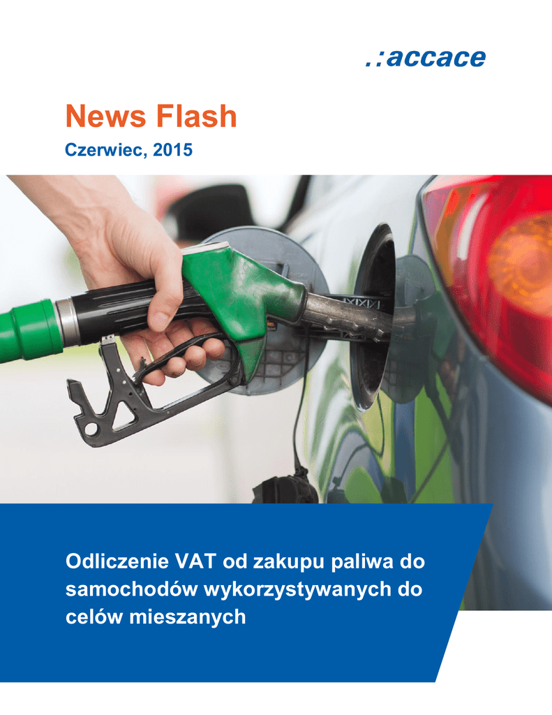 News Flash Czerwiec, 2015 Odliczenie VAT od zakupu paliwa do samochodów wykorzystywanych do celów mieszanych News Flash I Accace Poland I Odliczenie VAT od zakupu paliwa do samochodów wykorzystywanych do celów mieszanych Odliczenie VAT od zakupu paliwa do samochodów wykorzystywanych do celów mieszanych Do tej pory przedsiębiorcy posiadający samochody osobowe wykorzystywane zarówno do celów działalności gospodarczej jak i do celów prywatnych (czyli do tzw. celów mieszanych) mieli możliwość odliczenia 50% kwoty podatku VAT naliczonego od wydatków związanych z ich eksploatacją (np. od nabycia, naprawy, wymiany opon). Wyjątkiem były wydatki na zakup paliwa. Należy zwrócić uwagę, iż możliwość odliczenie podatku obejmuje jedynie paliwa zakupione po 1 lipca. W związku z tym faktura wystawiona po tej dacie, dokumentująca zakup przed 30 czerwca nie będzie dawać prawa do odliczenia podatku. Rozliczanie pozostałych wydatków związanych z wykorzystywaniem samochodów dla celów działalności gospodarczej pozostaje bez zmian. Ograniczenia w odniesieniu do paliwa obowiązujące od 1 kwietnia 2014 r. dotyczyły dwóch grup pojazdów: 1. Samochodów osobowych; 2. Innych niż samochody osobowe pojazdów o dopuszczalnej masie całkowitej nieprzekraczającej 3,5 tony, w których liczba siedzeń łącznie z miejscem dla kierowcy wynosi: - 1 - o ile dopuszczalna ładowność jest mniejsza niż 425 kg. - 2 - jeśli dopuszczalna ładowność jest mniejsza niż 493 kg. - 3 - lub więcej – kiedy dopuszczalna ładowność jest mniejsza niż 500 kg. Od początku lipca 2015 r. tracą moc ograniczenia w omawianym zakresie. W konsekwencji przedsiębiorcy będą mieli możliwość odliczenia 50% kwoty podatku VAT od zakupu paliwa do samochodów używanych do celów mieszanych. Zastrzeżenie Newsletter ma charakter jedynie informacyjny i stanowi publikację zainspirowaną treścią artykułów prasowych, interpretacji organów podatkowych i orzeczeń sądów. Nie stanowi porady ani opinii podatkowej czy prawnej w rozumieniu art. 2 ust. 1 i art. 31 ustawy o doradztwie podatkowym (Dz. U. z 1996 r. Nr 102, poz. 475, ze zm.) i jest odzwierciedleniem poglądów wyrażanych przez autorów publikacji. Accace Sp. z o.o. nie bierze odpowiedzialności za ewentualne skutki podejmowanych decyzji na ich podstawie. News Flash I Accace Poland I Odliczenie VAT od zakupu paliwa do samochodów wykorzystywanych do celów mieszanych Kontakt Krystian Kwiatkowski Tax Consultant E-Mail: [email protected] Tel: +48 223 132 950 O Accace Z ponad 250 profesjonalistami oraz oddziałami w 7 krajach, Accace jest jedną z wiodących firm outsourcingowych i doradczych w Europie Środkowo-Wschodniej. Sukcesywnie wcielamy w życie naszą strategię rozwoju poza ten region. Naszym celem jest świadczenie usług o globalnym zasięgu. Dzięki temu zaufało nam już ponad 1400 międzynarodowych firm. Nasze biura znajdują się w Czechach, na Węgrzech, w Rumunii, na Słowacji, w Polsce, na Ukrainie i w Niemczech. We wszystkich innych europejskich krajach działamy poprzez sieć firm partnerskich. Więcej o nas na stronie www.accace.pl