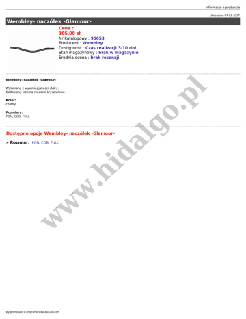Informacje o produkcie Utworzono 07-03-2017 Wembley- naczółek -GlamourCena : 105,00 zł Nr katalogowy : 95653 Producent : Wembley Dostępność : Czas realizacji 3-10 dni Stan magazynowy : brak w magazynie Średnia ocena : brak recenzji Wembley- naczółek -Glamour- .p l Wykonany z wysokiej jakości skóry. Ozdobiony trzema rzędami kryształków. Rozmiary: PON, COB, FULL al go Kolor: czarny Dostępne opcje Wembley- naczółek -Glamour- w w w .h id » Rozmiar: PON, COB, FULL. Wygenerowano w programie www.oscGold.com