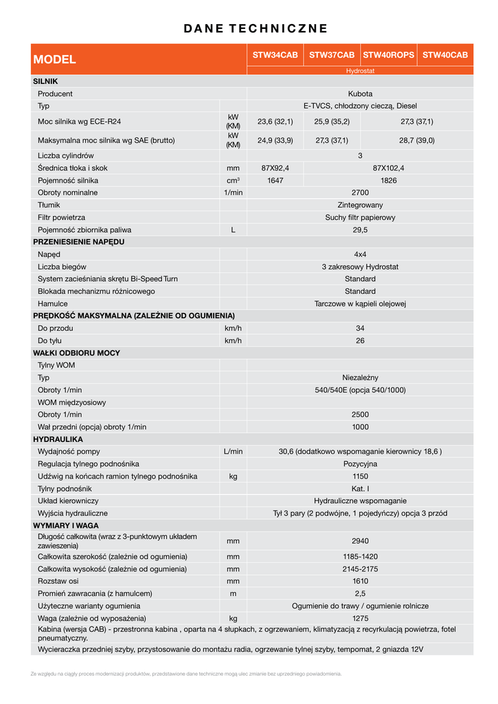 dane techniczne STW34CAB Model STW37CAB STW40ROPS STW40CAB Hydrostat Silnik Producent Kubota Typ Moc silnika wg ECE-R24 Maksymalna moc silnika wg SAE (brutto) E-TVCS, chłodzony cieczą, Diesel kW (KM) kW (KM) 23,6 (32,1) 25,9 (35,2) 27,3 (37,1) 24,9 (33,9) 27,3 (37,1) 28,7 (39,0) Liczba cylindrów 3 Średnica tłoka i skok mm 87X92,4 87X102,4 Pojemność silnika cm3 1647 1826 Obroty nominalne 1/min Tłumik Zintegrowany Filtr powietrza Pojemność zbiornika paliwa 2700 Suchy filtr papierowy L 29,5 Przeniesienie napędu Napęd 4x4 Liczba biegów 3 zakresowy Hydrostat System zacieśniania skrętu Bi-Speed Turn Standard Blokada mechanizmu różnicowego Standard Hamulce Tarczowe w kąpieli olejowej Prędkość maksymalna (zależnie od ogumienia) Do przodu km/h 34 Do tyłu km/h 26 Wałki Odbioru Mocy Tylny WOM Typ Niezależny Obroty 1/min 540/540E (opcja 540/1000) WOM międzyosiowy Obroty 1/min 2500 Wał przedni (opcja) obroty 1/min 1000 Hydraulika Wydajność pompy L/min 30,6 (dodatkowo wspomaganie kierownicy 18,6 ) Regulacja tylnego podnośnika Udźwig na końcach ramion tylnego podnośnika Pozycyjna kg 1150 Tylny podnośnik Kat. I Układ kierowniczy Hydrauliczne wspomaganie Wyjścia hydrauliczne Wymiary i waga Długość całkowita (wraz z 3-punktowym układem zawieszenia) Całkowita szerokość (zależnie od ogumienia) Tył 3 pary (2 podwójne, 1 pojedyńczy) opcja 3 przód mm 2940 mm 1185-1420 Całkowita wysokość (zależnie od ogumienia) mm 2145-2175 Rozstaw osi mm 1610 Promień zawracania (z hamulcem) Użyteczne warianty ogumienia m 2,5 Ogumienie do trawy / ogumienie rolnicze Waga (zależnie od wyposażenia) kg 1275 Kabina (wersja CAB) - przestronna kabina , oparta na 4 słupkach, z ogrzewaniem, klimatyzacją z recyrkulacją powietrza, fotel pneumatyczny. Wycieraczka przedniej szyby, przystosowanie do montażu radia, ogrzewanie tylnej szyby, tempomat, 2 gniazda 12V Ze względu na ciągły proces modernizacji produktów, przedstawione dane techniczne mogą ulec zmianie bez uprzedniego powiadomienia.