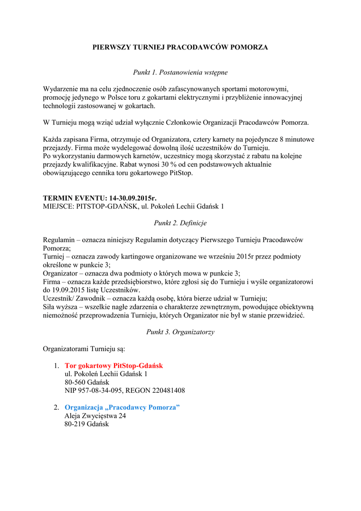 PIERWSZY TURNIEJ PRACODAWCÓW POMORZA Punkt 1. Postanowienia wstępne Wydarzenie ma na celu zjednoczenie osób zafascynowanych sportami motorowymi, promocję jedynego w Polsce toru z gokartami elektrycznymi i przybliżenie innowacyjnej technologii zastosowanej w gokartach. W Turnieju mogą wziąć udział wyłącznie Członkowie Organizacji Pracodawców Pomorza. Każda zapisana Firma, otrzymuje od Organizatora, cztery karnety na pojedyncze 8 minutowe przejazdy. Firma może wydelegować dowolną ilość uczestników do Turnieju. Po wykorzystaniu darmowych karnetów, uczestnicy mogą skorzystać z rabatu na kolejne przejazdy kwalifikacyjne. Rabat wynosi 30 % od cen podstawowych aktualnie obowiązującego cennika toru gokartowego PitStop. TERMIN EVENTU: 14-30.09.2015r. MIEJSCE: PITSTOP-GDAŃSK, ul. Pokoleń Lechii Gdańsk 1 Punkt 2. Definicje Regulamin – oznacza niniejszy Regulamin dotyczący Pierwszego Turnieju Pracodawców Pomorza; Turniej – oznacza zawody kartingowe organizowane we wrześniu 2015r przez podmioty określone w punkcie 3; Organizator – oznacza dwa podmioty o których mowa w punkcie 3; Firma – oznacza każde przedsiębiorstwo, które zgłosi się do Turnieju i wyśle organizatorowi do 19.09.2015 listę Uczestników. Uczestnik/ Zawodnik – oznacza każdą osobę, która bierze udział w Turnieju; Siła wyższa – wszelkie nagłe zdarzenia o charakterze zewnętrznym, powodujące obiektywną niemożność przeprowadzenia Turnieju, których Organizator nie był w stanie przewidzieć. Punkt 3. Organizatorzy Organizatorami Turnieju są: 1. Tor gokartowy PitStop-Gdańsk ul. Pokoleń Lechii Gdańsk 1 80-560 Gdańsk NIP 957-08-34-095, REGON 220481408 2. Organizacja „Pracodawcy Pomorza” Aleja Zwycięstwa 24 80-219 Gdańsk Realizatorem turnieju odpowiedzialnym za sprzęt, pomiar czasu i bezpieczeństwo jest: 1. Tor gokartowy PitStop-Gdańsk ul. Pokoleń Lechii Gdańsk 1 80-560 Gdańsk NIP 957-08-34-095, REGON 220481408 Punkt 4. System zawodów/ punktacja Turniej składa się z trzech etapów: Etap 1 – Kwalifikacje – organizowane w terminie 14-25.09.2015r. Etap 2 – Finał – organizowany w dniu – 30.09.2015r. Część 1. Kwalifikacje Wszystkie jazdy kwalifikacyjne odbywają się na torze halowym PitStop, na gokartach elektrycznych. Sesje kwalifikacyjne odbywają się w systemie indywidualnym. Uczestnik może przyjść na tor w dowolnym dostępnym terminie, od 14-25.09.2015r, od poniedziałku do piątku, w godzinach działania toru. W czasie jazd kwalifikacyjnych uczestnicy starają się zdobyć jak najlepsze czasy pojedynczych okrążeń „best lap” – które decydują o przejściu do kolejnego etapu Turnieju. Pod uwagę brane są czasy dwóch najlepszych Zawodników z każdej Firmy. Sesje kwalifikacyjne trwają po8 min. Każdy przejazd odnotowywany jest przez obsługę toru PitStop. Pomiar czasów dokonywany jest systemem elektronicznym, zawodnicy mają możliwość wglądu w swoje czasy po zakończeniu danej sesji. Lista z czasami odświeżana będzie raz dziennie i zamieszczana na fanpag’u firmy PitStopGdańsk https://www.facebook.com/PitStopGdansk Na podstawie uzyskanych najlepszych czasów z kwalifikacji, ustala się 10 FIRM (drużyn 2osobowych) biorących udział w wyścigu finałowym. Część 2. Finał Wyścig finałowy przeprowadzony zostanie na torze zewnętrznym, na gokartach spalinowych. Finał składa się z dwóch etapów: eliminacji oraz wyścigu głównego. Jeden zawodnik z każdej drużyny startuje w eliminacjach, drugi w wyścigu głównym. Eliminacje. Czas – 10 min. Przed rozpoczęciem sesji kwalifikacyjnych ustala się 10 gokartów uczestniczących w kwalifikacjach. Gokarty są losowane z wyznaczonej puli. Pomiar czasów dokonywany jest systemem elektronicznym, zawodnicy maja możliwość wglądu w swoje czasy i czasy rywali po zakończeniu sesji. Na podstawie uzyskanych najlepszych czasów pojedynczych okrążeń, przydzielane są pozycje startowe do wyścigu głównego. W przypadku osiągnięcia przez dwóch lub więcej zawodników takiego samego najlepszego czasu decydują kolejne najlepsze okrążenia. W przypadku awarii gokarta: jeśli nastąpi ona przed pomiarem czasu pierwszego okrążenia któregokolwiek z zawodników, sesja zatrzymywana jest czerwoną flagą i przysługuje wymiana zepsutego gokarta na rezerwowy, po czym całość jest restartowana. W każdym innym przypadku można próbować dokonać naprawy po zjeździe do pitstopu (jeśli jest to możliwe) i powrócić na tor w trakcie trwania sesji lub wycofać się z dalszej jazdy. Wyścig główny. Czas – 10 minut. Procedura startu: Gokarty ustawiane są przez Sędziego jeden za drugim wg zdobytej pozycji startowej, następnie wydawane jest zezwolenie na start, wyścig zaczyna się po ukazaniu się flagi startowej. W przypadku nieprzewidzianych okoliczności na torze wyścig uznaje się za zaliczony po pokonaniu przez leadera co najmniej połowy dystansu, w przeciwnym razie zostaje powtórzony. Dyskwalifikacja w wyścigu powoduje sklasyfikowanie zawodnika na końcu stawki w grupie. Wyścig wygrywa zawodnik który w czasie 15 minut przejedzie największą ilość okrążeń lub w przypadku takiej samej ilości co jego konkurenci pierwszy minie linię start meta po upływie regulaminowego czasu. Punkt 5. Zapisy Zapisów można dokonać poprzez kontakt z recepcją toru gokartowgo, e-mail: [email protected], telefon:733-870-870; 731-38-38-38. Punkt 6. Sygnalizacja NIEBIESKA - pokazywana w celu nakazania przepuszczenia: zbliżającego się szybszego gokarta bądź w przypadku dublowania wolniejszego zawodnika w wyścigu; ŻÓŁTA - oznacza niebezpieczeństwo na torze, nakazuje zawodnikom znaczne obniżenie prędkości, całkowity zakaz wyprzedzania, zachowanie ostrożności. Za złamanie tego przepisu grożą kary przewidziane w regulaminie w postaci sekund karnych; flaga żółta pokazywana jest również podczas ostatniego okrążenia na obu torach; CZERWONA - natychmiastow