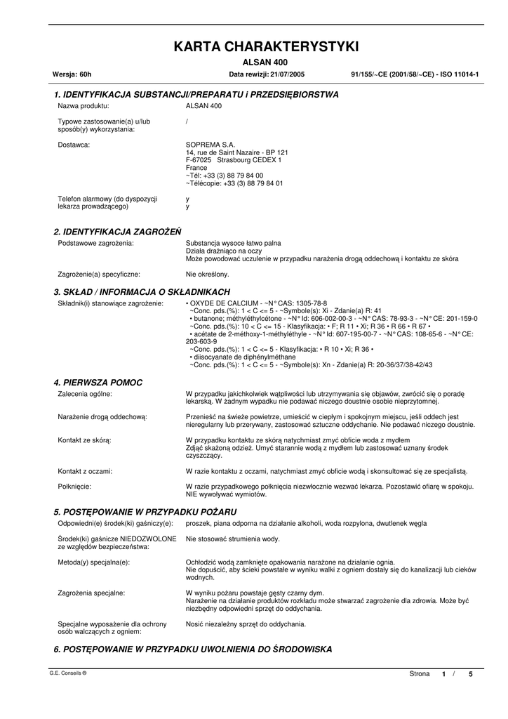 KARTA CHARAKTERYSTYKI ALSAN 400 Wersja: 60h Data rewizji: 21/07/2005 91/155/~CE (2001/58/~CE) - ISO 11014-1 1. IDENTYFIKACJA SUBSTANCJI/PREPARATU i PRZEDSI BIORSTWA Nazwa produktu: ALSAN 400 Typowe zastosowanie(a) u/lub sposób(y) wykorzystania: / Dostawca: SOPREMA S.A. 14, rue de Saint Nazaire - BP 121 F-67025 Strasbourg CEDEX 1 France ~Tél: +33 (3) 88 79 84 00 ~Télécopie: +33 (3) 88 79 84 01 Telefon alarmowy (do dyspozycji lekarza prowadz cego) y y 2. IDENTYFIKACJA ZAGRO E Podstawowe zagro enia: Substancja wysoce łatwo palna Działa dra ni co na oczy Mo e powodowa uczulenie w przypadku nara enia drog oddechow i kontaktu ze skóra Zagro enie(a) specyficzne: Nie okre lony. 3. SKŁAD / INFORMACJA O SKŁADNIKACH Składnik(i) stanowi ce zagro enie: • OXYDE DE CALCIUM - ~N° CAS: 1305-78-8 ~Conc. pds.(%): 1 < C <= 5 - ~Symbole(s): Xi - Zdanie(a) R: 41 • butanone; méthyléthylcétone - ~N° Id: 606-002-00-3 - ~N° CAS: 78-93-3 - ~N° CE: 201-159-0 ~Conc. pds.(%): 10 < C <= 15 - Klasyfikacja: • F; R 11 • Xi; R 36 • R 66 • R 67 • • acétate de 2-méthoxy-1-méthyléthyle - ~N° Id: 607-195-00-7 - ~N° CAS: 108-65-6 - ~N° CE: 203-603-9 ~Conc. pds.(%): 1 < C <= 5 - Klasyfikacja: • R 10 • Xi; R 36 • • diisocyanate de diphénylméthane ~Conc. pds.(%): 1 < C <= 5 - ~Symbole(s): Xn - Zdanie(a) R: 20-36/37/38-42/43 4. PIERWSZA POMOC Zalecenia ogólne: W przypadku jakichkolwiek w tpliwo ci lub utrzymywania si objawów, zwróci si o porad lekarsk . W adnym wypadku nie podawa niczego doustnie osobie nieprzytomnej. Nara enie drog oddechow : Przenie na wie e powietrze, umie ci w ciepłym i spokojnym miejscu, je li oddech jest nieregularny lub przerywany, zastosowa sztuczne oddychanie. Nie podawa niczego doustnie. Kontakt ze skór : W przypadku kontaktu ze skór natychmiast zmy obficie woda z mydłem Zdj ska on odzie . Umy starannie wod z mydłem lub zastosowa uznany rodek czyszcz cy. Kontakt z oczami: W razie kontaktu z oczami, natychmiast zmy obficie wod i skonsultowa si ze specjalist . Połkni cie: W razie przypadkowego połkni cia niezwłocznie wezwa lekarza. Pozostawi ofiar w spokoju. NIE wywoływa wymiotów. 5. POST POWANIE W PRZYPADKU PO ARU Odpowiedni(e) rodek(ki) ga niczy(e): proszek, piana odporna na działanie alkoholi, woda rozpylona, dwutlenek w gla rodek(ki) ga nicze NIEDOZWOLONE ze wzgl dów bezpiecze stwa: Nie stosowa strumienia wody. Metoda(y) specjalna(e): Ochłodzi wod zamkni te opakowania nara one na działanie ognia. Nie dopu ci , aby cieki powstałe w wyniku walki z ogniem dostały si do kanalizacji lub cieków wodnych. Zagro enia specjalne: W wyniku po aru powstaje g sty czarny dym. Nara enie na działanie produktów rozkładu mo e stwarza zagro enie dla zdrowia. Mo e by niezb dny odpowiedni sprz t do oddychania. Specjalne wyposa enie dla ochrony osób walcz cych z ogniem: Nosi niezale ny sprz t do oddychania. 6. POST POWANIE W PRZYPADKU UWOLNIENIA DO RODOWISKA G.E. Conseils ® Strona 1 / 5 KARTA CHARAKTERYSTYKI ALSAN 400 Wersja: 60h Data rewizji: 21/07/2005 91/155/~CE (2001/58/~CE) - ISO 11014-1 Indywidualne rodki ostro no ci: Usun ródła ognia i przewietrzy pomieszczenia. Unika wdychania par i/lub cz stek. Zastosowa si do opisu działa ochronnych podanego w rubrykach 7 i 8. rodki ostro no ci z punktu widzenia ochrony rodowiska: Zapobiec jakiemukolwiek przenikaniu do kanalizacji lub cieków wodnych. Je li dojdzie do ska enia produktem zbiorników wodnych, rzek lub kanalizacji, zawiadomi wła ciwe władze zgodnie z przepisowymi procedurami. Metoda(y) oczyszczenia Czy ci najlepiej detergentem - Unika stosowania rozpuszczalników. 7. OBCHODZENIE SI Z SUBSTANCJ I MAGAZYNOWANIE Obchodzenie si - rodki ostro no ci: Nale y wprowadzi zakaz palenia, spo ywania posiłków i napojów w pomieszczeniach, w których stosuje si preparat. Unika kontaktu ze skór i oczami. Osoby cierpi ce na ostr lub chroniczn alergi nie powinny manipulowa ani by wystawione na działanie produktu. Ochrona osobista, patrz rubryka 8. Stosowa si do przepisów bezpiecze stwa pracy. - Techniczne rodki ostro no ci: Produkt mo e by stosowany jedynie w pomieszczeniach wolnych od otwartego ognia lub innych ródeł ognia. Wyposa enie elektryczne powinno by odpowiednio chronione. - Zasada(y) stosowania: Przechowywa w szczelnie zamkni tych pojemnikach z dala od ródła ciepła, iskier i otwartego ognia. Nie stosowa narz dzi mog cych powodowa powstawanie iskier. Przechowywanie - rodki ostro no ci: Stosowa rodki ostro no ci podane na etykiecie. Nie pali tytoniu. Wprowadzi zakaz wst pu do pomieszce osobom nieuprawnionym. Przechowywa poza zasi giem dzieci. - Techniczne rodki ostro no ci: Podło e niepalne i nieprzepuszczalne tworz ce kad retencyjn . - Warunki przechowywania: Magazynowa w suchym, dobrze wentylowanym miejscu, z dala od ródeł ognia, ciepła i bezpo redniego wiatła słonecznego. Otwarte opakowania nale y ponownie zamkn i przechowywa w pozycji pionowej. - Rodzaj materiałów, z których mog by wykonywane opakowania / kontenery: tego samego rodzaju co oryginalny 8. KONTROLA NARA ENIA / RODKI OCHRONY INDYWIDUALNEJ Techniczne rodki ochrony: Dba o odpowiedni wentylacj . Zasadniczo wentylacja powinna si odbywa przez zasysanie przy stanowiskach pracy i wła ciwy wyci g ogólny. Je li to nie wystarcza do utrzymania st enia cz stek i par rozpuszczalników poni ej najwy szego dopuszczalnego st enia, nale y nosi odpowiedni sprz t do oddychania. Warto ci graniczne nara enia - Najwy sze dopuszczalne st enie(a): • OXYDE DE CALCIUM:VME mg/mł = 2 • butanone; méthyléthylcétone:VME ppm = 200 - VME mg/mł = 600 - VLE ppm = 300 - VLE mg/mł = 900 • acétate de 2-méthoxy-1-méthyléthyle:VME ppm = 50 - VME mg/mł = 275 - VLE ppm = 100 VLE mg/mł = 550 Kontrole nara enia - Ochrona dróg oddechowych: Nie wdycha par. - Ochrona dłoni: Dla ochrony eksponowanych partii skóry mog by przydatne kremy ochronne, nie powinny jednak e by stosowane po kontakcie z produktem. Wymagane s r kawice z polietylenu l