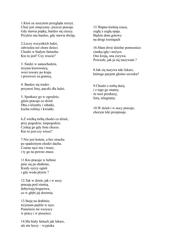 1.Ktoś za zeszytem przegląda zeszyt, Choć jest zmęczony- jeszcze pracuje. Gdy stawia piątkę, bardzo się cieszy. Przykro mu bardzo, gdy stawia dwóję. 2.Leczy wszystkich ludzi, odwiedza też chore dzieci. Chodzi w białym fartuchu. Kto to jest? Czy wiecie? 3. Siedzi w samochodzie, trzyma kierownicę, wozi towary po kraju i przewozi za granicę. 4. Bardzo się trudziprzynosi listy, paczki dla ludzi. 5. Spotkasz go w ogrodzie, gdzie pracuje co dzień Dba o klomby i rabatki, kocha rośliny i kwiatki. 6.Z wielką torbą chodzi co dzień, przy pogodzie, niepogodzie. Czekaj go gdy listu chcesz. Kto to jest-czy wiesz? 7.Nie jest kotem, a bez strachu po spadzistym chodzi dachu. Czarne ręce ma i twarz, i ty go na pewno znasz. 11.Kto pracuje w hełmie pnie się po drabinie, Kiedy syczy ogień i gdy woda płynie ? 12.Tak w dzień, jak i w nocy pracują pod ziemią, dobywają bogactwa, co w głębi jej drzemią. 13.Stoję na drabinie, trzymam pędzle w ręce. Pomóżcie mi wszyscy w pracy i w piosence. 14.Ma biały fartuch jak lekarz, ale nie leczy – wypieka 15.Wapno kielnią rzuca, cegłę z cegłą spaja. Będzie dom gotowy na drogi rozstajach 16.Mam dwie dzielne pomocnice: cienką igłę i nożyce. One kroją, ona zszywa. Powiedz, jak ja się nazywam ? 8.Jak się nazywa taki lekarz, którego pacjent głośno szczeka? 9.Chodzi z torbą dużą i z tego go znamy, że nosi przekazy, listy, telegramy. 10.W dzień i w nocy pracuje, chorym leki przepisuje.