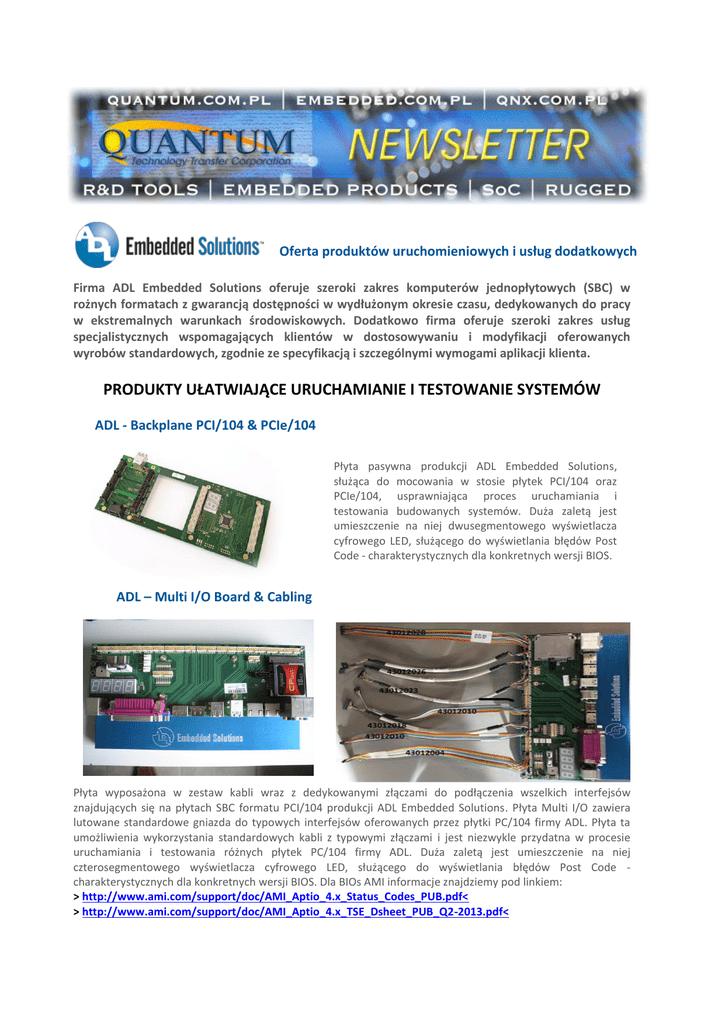 Oferta produktów uruchomieniowych i usług dodatkowych Firma ADL Embedded Solutions oferuje szeroki zakres komputerów jednopłytowych (SBC) w rożnych formatach z gwarancją dostępności w wydłużonym okresie czasu, dedykowanych do pracy w ekstremalnych warunkach środowiskowych. Dodatkowo firma oferuje szeroki zakres usług specjalistycznych wspomagających klientów w dostosowywaniu i modyfikacji oferowanych wyrobów standardowych, zgodnie ze specyfikacją i szczególnymi wymogami aplikacji klienta. PRODUKTY UŁATWIAJĄCE URUCHAMIANIE I TESTOWANIE SYSTEMÓW ADL - Backplane PCI/104 & PCIe/104 Płyta pasywna produkcji ADL Embedded Solutions, służąca do mocowania w stosie płytek PCI/104 oraz PCIe/104, usprawniająca proces uruchamiania i testowania budowanych systemów. Duża zaletą jest umieszczenie na niej dwusegmentowego wyświetlacza cyfrowego LED, służącego do wyświetlania błędów Post Code - charakterystycznych dla konkretnych wersji BIOS. ADL – Multi I/O Board & Cabling Płyta wyposażona w zestaw kabli wraz z dedykowanymi złączami do podłączenia wszelkich interfejsów znajdujących się na płytach SBC formatu PCI/104 produkcji ADL Embedded Solutions. Płyta Multi I/O zawiera lutowane standardowe gniazda do typowych interfejsów oferowanych przez płytki PC/104 firmy ADL. Płyta ta umożliwienia wykorzystania standardowych kabli z typowymi złączami i jest niezwykle przydatna w procesie uruchamiania i testowania różnych płytek PC/104 firmy ADL. Duża zaletą jest umieszczenie na niej czterosegmentowego wyświetlacza cyfrowego LED, służącego do wyświetlania błędów Post Code charakterystycznych dla konkretnych wersji BIOS. Dla BIOs AMI informacje znajdziemy pod linkiem: > http://www.ami.com/support/doc/AMI_Aptio_4.x_Status_Codes_PUB.pdf< > http://www.ami.com/support/doc/AMI_Aptio_4.x_TSE_Dsheet_PUB_Q2-2013.pdf< OFERTA SPECJALISTYCZNYCH USŁUG DODATKOWYCH Custom Systems Systemy wg specyfikacji klienta <http://www.adlusa.com/services/custom-systems.php> mogą być zaprojektowane zgodnie z życzeniem klienta, pod względem rozmiarów, warunków zasilania i chłodzenia, dostosowane do specyficznych wymogów środowiskowych. Trójwymiarowe modelowanie projektu wykonywane jest za pomocą oprogramowanie CAD Solidworks®. Podczas tego procesu inżynierowie projektanci służą klientowi pomocą w sformułowaniu specyfikacji projektu, jego budowie jak finalnej integracji systemu spełanijącego wymogi specyficznych testów zarówno o niskim jak i wysokim IP (stopnie IP <http://en.wikipedia.org/wiki/IP_Code>). Podczas procesu projektowanie rozpoczynającego się od omówienia koncepcji i wymagań klienta, firma ADL Embedded Solutions służy także pomocą w rozwinięciu i dopracowaniu strategie realizacji projektu, w sposób gwarantujący ekonomiczną jego produkcję. CAD Modeling Support Wielu klientów ma doświadczenie w trójwymiarowym projektowaniu dla własnych celów i po prostu potrzebują tylko wsparcia w modelowaniu zintegrowanego systemu zawierającego płyty ADL oraz dodatkowo wyselekcjonowanych kart peryferyjnych. Modele CAD'owskie dla wszystkich płyt SBC i wybranych kart peryferyjnych są dostępne zarówno w formatach systemu Solidworks jak i STEP 203/214. Inne formaty mogą być dostępne na podstawie zgłoszonych potrzeb, jak np. IGES, itp. Dla większości płyt SBC, modele CAD są udostępniane wraz ze zintegrowanymi standardowymi rozwiązaniami chłodzenia. Zamówienie na modele CAD może być złożone podczas typowego zamówienia produktu. Custom Thermal Solutions Wszystkie oferowane płyty SBC, firma ADL Embedded Solutions dostarcza zarówno dla standardowego jak i rozszerzonego zakresu temperatur pracy. Ponadto do standardowo oferowanych rozwiązań chłodzenia (przewodzące ciepło płyty pośrednie, różne radiatory, obudowy), firma ADL może dostarczyć specyficzne rozwiązania chłodzenia określone wymogami klienta. Współpracując z miejscowymi warsztatami obróbki mechanicznej i lakierniami, ADL może stworzyć całą koncepcję systemu chłodzenia włączając w to kombinacje miedzi i aluminium dla płyt SBCs o dużej mocy wraz z wykonaniem odpowiednich powłok utleniania anodowe (jasne, czarne) itp. W takich sprawach decyzje są podejmowane podczas procesu uzgodnień i zamówienia. Extended Temperature Screening Firma ADL Embedded Solutions oferuje pełne testowanie w rozszerzonych temperaturach dla całego asortymenty płyt SBC. Cen i zakres tej uzgadniany jest podczas procesu zapytania i składania zamówienia. Pod linkiem <http://www.adl-usa.com/services/extendedtemperature.php> znajduje się szczegółowy opis całego procesu testowania w rozszerzonych temperaturach. Coating, Underfill and Bonding for Ruggedization Conformal Coating: Usługa lakierowania wykonywana jest lakierem Akrylowym typ 1B31, inne materiały są dostępne na specjalną prośbę. Lakier akrylowy używany jest powszechnie dla produktów eksploatowanych w środowisku o wysokiej wilgotności. Bonding: Jest to sposób zabezpieczenia przed szkodami albo stratami podczas eksploatacji w wysokich wibracjach. Proces ten zaleca się stosować dla aplikacji przemysłowych i wojskowych w przypadku eksploatacji w warunkach wysokich wibracji, głównie celem zabezpieczenia przed oderwaniem komponentów o znacznej masie, montowanych na płytkach PCB. Underfill: Proces używany głównie dla umiarkowanych warunków wibracji, typowych dla aplikacji kolejowych, wojskowego transportu lądowego i lotniczego, itp. Proces ten jest ważny i zalecany dla płyt eksploatowanych w rozszerzonym zakresie temperatur, szczególnie procesorów i chipsetów typu BGA o rastrze szpilek <1mm narażonych na szybko zmieniające się temperatury. Ruggedization: Jest to usługa przystosowania do pracy w ekstremalnych wojskowych i przemysłowych środowiskach o dużych wibracjach, która czasami będzie wymagać przystosowania i wzmocnienia całego montażu, zabezpieczania lakierami i być