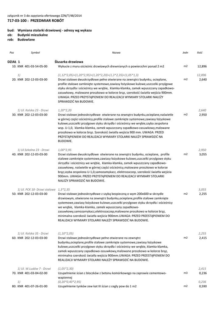 załącznik nr 3 do zapytania ofertowego ZZN/T/48/2014 717-03-100 : PRZEDMIAR ROBÓT bud: Wymiana stolarki drzwiowej - adresy wg wykazu ob: Budynki mieszkalne rob: Budowlane Poz Symbol DZIAŁ 1 Nazwa Ilość Ślusarka drzwiowa 10. KNR 401-03-54-05-00 Wykucie z muru ościeżnic drzwiowych drewnianych o powierzchni ponad 2 m2 1) 20. KNR 202-12-03-03-00 (1,12*2,05)+(1,20*2,95)+(1,20*2,20)+(1,3*2,35)+(1,05*1,3) Drzwi stalowe dwuskrzydłowe pełne otwierane na zewnątrz budynku, ocieplane, profile stalowe zamknięte systemowe,zawiasy łożyskowe kulowe,uszczelki przylgowe styku skrzydła i ościeżnicy we wrębie, klamka-klamka, zamek wpuszczany zapadkowozasuwkowy, malowane proszkowo w kolorze brąz, szerokość światła wejścia 900mm. UWAGA: PRZED PRZYSTĄPIENIEM DO REALIZACJI WYMIARY STOLARKI NALEŻY SPRAWDZIĆ NA BUDOWIE. 1) Ul. Kolska 23 - Drzwi 30. KNR 202-12-03-03-00 1,20*2,20 Drzwi stalowe jednoskrzydłowe otwierane na zewnątrz budynku,ocieplane,naświetle w górnej części ościeżnicy,profile stalowe zamknięte systemowe,zawiasy łożyskowe kulowe,uszczelki przylgowe styku skrzydła i ościeżnicy we wrębie,szyba zespolona wsp. U-1,0, klamka-klamka, zamek wpuszczany zapadkowo-zasuwkowy,malowane proszkowo w kolorze brąz. Szerokość światła wejścia 900 mm. UWAGA: PRZED PRZYSTĄPIENIEM DO REALIZACJI WYMIARY STOLARKI NALEŻY SPRAWDZIĆ NA BUDOWIE. 1) Ul.Szkolna 23 - Drzwi 40. KNR 202-12-03-03-00 1,00*2,95 Drzwi stalowe dwuskrzydłowe otwierane na zewnątrz budynku, ocieplane, profile stalowe zamknięte systemowe,zawiasy łożyskowe kulowe,uszczelki przylgowe styku skrzydła i ościeżnicy we wrębie, klamka-klamka, zamek wpuszczany zapadkowozasuwkowy, naświetle w górnej części ościeżnicy,malowane proszkowo w kolorze brąz,szyba zespolona U-1,0,samozamykacz, elektrozaczep, szerokość światła wejścia 900mm. UWAGA: PRZED PRZYSTĄPIENIEM DO REALIZACJI WYMIARY STOLARKI NALEŻY SPRAWDZIĆ NA BUDOWIE. 1) Ul. PCK 10- Drzwi stalowe 1,3*2,35 50. KNR 202-12-03-03-00 Drzwi stalowe jednoskrzydłowe z szybą bezpieczną o wym 200x600 w skrzydle drzwiowym, otwierane na zewnątrz budynku,ocieplane,profile stalowe zamknięte systemowe,zawiasy łożyskowe kulowe,uszczelki przylgowe styku skrzydła i ościeżnicy we wrębie, klamka-klamka, zamek wpuszczany zapadkowozasuwkowy,samozamykacz,elektrozaczep,malowane proszkowo w kolorze brąz, minimalna szerokość światła wejścia 900mm.UWAGA: PRZED PRZESTĄPIENIEM DO REALIZACJI WYMIARY STOLARKI NALEŻY SPRAWDZIĆ NA BUDOWIE. 1) Ul. Kolska 35 - Drzwi 60. KNR 202-12-03-03-00 (1,10*2,05) Drzwi stalowe jednoskrzydłowe pełne otwierane na zewnątrz budynku,ocieplane,profile stalowe zamknięte systemowe,zawiasy łożyskowe kulowe,uszczelki przylgowe styku skrzydła i ościeżnicy we wrębie, klamka-klamka, zamek wpuszczany zapadkowo-zasuwkowy,malowane proszkowo w kolorze brąz, minimalna szerokość światła wejścia 900mm.UWAGA: PRZED PRZESTĄPIENIEM DO REALIZACJI WYMIARY STOLARKI NALEŻY SPRAWDZIĆ NA BUDOWIE. 1) Ul. W.Ludów 7 - Drzwi 70. KNR 401-03-04-02-00 (1,05*2,30) Uzupełnienie ścian z bloczków z betonu komórkowego na zaprawie cementowowapiennej (0,20*0,40*2,95) Uzupełnienie tynków zew kat III ścian z cegły pow do 1 m2 1) 80. KNR 401-07-26-01-00 Jedn m2 12,896 m2 12,896 2,640 m2 2,640 2,950 m2 2,950 3,055 m2 3,055 2,255 m2 2,255 2,415 m3 2,415 0,236 m2 0,236 0,590 1) 90. KNR 401-07-16-01-00 2) 100. KNR 401-07-08-01-00 0,20*2,95 Tynki kat III na ścianach z cegły w pomieszczeniach o pow do 5 m2 0,20*2,95 Wykonanie tynku cementowo-wapiennego kat III na ościeżach szer do 15 cm 1) 110. 000-00-00-00-01 1) 120. KNNR N003-06-05-04-00 1) 2,95 Analiza własna - montaż odboju 5 Malowanie 2x farbą emulsyjną ścian i sufitów z przygotowaniem podłoża 6 m2 metr szt m2 0,590 0,590 0,590 2,950 2,950 5,000 5,000 6,000 6,000