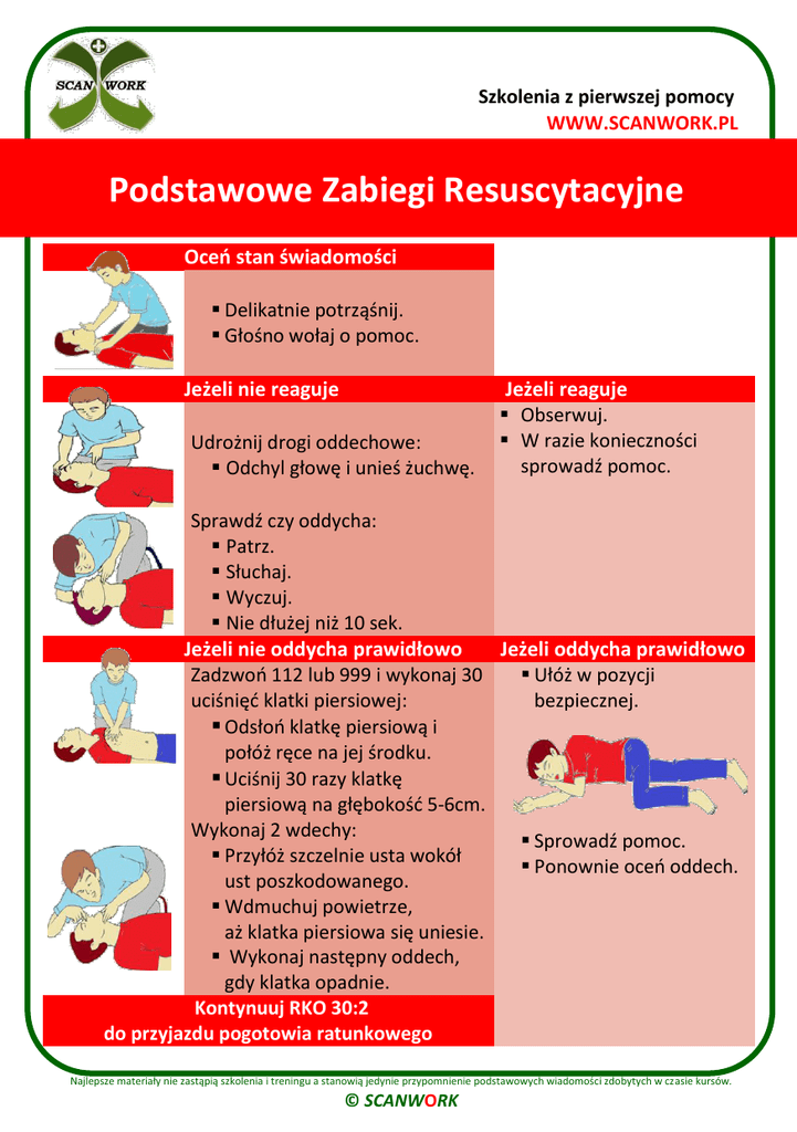 Szkolenia z pierwszej pomocy WWW.SCANWORK.PL Podstawowe Zabiegi Resuscytacyjne Oceń stan świadomości Delikatnie potrząśnij. Głośno wołaj o pomoc. Jeżeli nie reaguje Udrożnij drogi oddechowe: Odchyl głowę i unieś żuchwę. Jeżeli reaguje Obserwuj. W razie konieczności sprowadź pomoc. Sprawdź czy oddycha: Patrz. Słuchaj. Wyczuj. Nie dłużej niż 10 sek. Jeżeli nie oddycha prawidłowo Jeżeli oddycha prawidłowo Zadzwoń 112 lub 999 i wykonaj 30 Ułóż w pozycji uciśnięć klatki piersiowej: bezpiecznej. Odsłoń klatkę piersiową i połóż ręce na jej środku. Uciśnij 30 razy klatkę piersiową na głębokość 5-6cm. Wykonaj 2 wdechy: Sprowadź pomoc. Przyłóż szczelnie usta wokół Ponownie oceń oddech. ust poszkodowanego. Wdmuchuj powietrze, aż klatka piersiowa się uniesie. Wykonaj następny oddech, gdy klatka opadnie. Kontynuuj RKO 30:2 do przyjazdu pogotowia ratunkowego Najlepsze materiały nie zastąpią szkolenia i treningu a stanowią jedynie przypomnienie podstawowych wiadomości zdobytych w czasie kursów. © SCANWORK