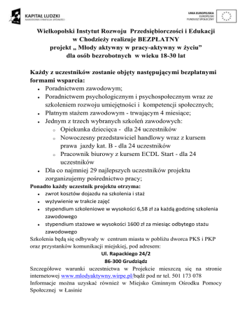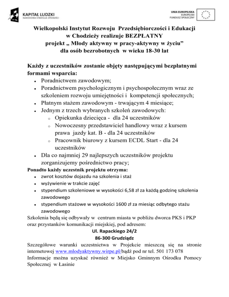 Wielkopolski Instytut Rozwoju Przedsiębiorczości i Edukacji w Chodzieży realizuje BEZPŁATNY projekt „ Młody aktywny w pracy-aktywny w życiu” dla osób bezrobotnych w wieku 18-30 lat Każdy z uczestników zostanie objęty następującymi bezpłatnymi formami wsparcia: Poradnictwem zawodowym; Poradnictwem psychologicznym i psychospołecznym wraz ze szkoleniem rozwoju umiejętności i kompetencji społecznych; Płatnym stażem zawodowym - trwającym 4 miesiące; Jednym z trzech wybranych szkoleń zawodowych: o Opiekunka dziecięca - dla 24 uczestników o Nowoczesny przedstawiciel handlowy wraz z kursem prawa jazdy kat. B - dla 24 uczestników o Pracownik biurowy z kursem ECDL Start - dla 24 uczestników Dla co najmniej 29 najlepszych uczestników projektu zorganizujemy pośrednictwo pracy; Ponadto każdy uczestnik projektu otrzyma: zwrot kosztów dojazdu na szkolenia i staż wyżywienie w trakcie zajęć stypendium szkoleniowe w wysokości 6,58 zł za każdą godzinę szkolenia zawodowego stypendium stażowe w wysokości 1600 zł za miesiąc odbytego stażu zawodowego Szkolenia będą się odbywały w centrum miasta w pobliżu dworca PKS i PKP oraz przystanków komunikacji miejskiej, pod adresem: Ul. Rapackiego 24/2 86-300 Grudziądz Szczegółowe warunki uczestnictwa w Projekcie mieszczą się na stronie internetowej www.mlodyaktywny.wirpe.pl/bądź pod nr tel. 501 173 078 Informacje można uzyskać również w Miejsko Gminnym Ośrodku Pomocy Społecznej w Łasinie