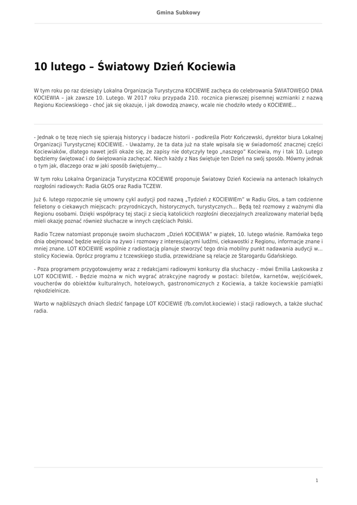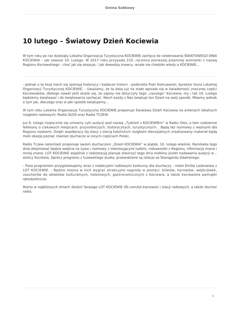Gmina Subkowy 10 lutego – Światowy Dzień Kociewia W tym roku po raz dziesiąty Lokalna Organizacja Turystyczna KOCIEWIE zachęca do celebrowania ŚWIATOWEGO DNIA KOCIEWIA – jak zawsze 10. Lutego. W 2017 roku przypada 210. rocznica pierwszej pisemnej wzmianki z nazwą Regionu Kociewskiego - choć jak się okazuje, i jak dowodzą znawcy, wcale nie chodziło wtedy o KOCIEWIE... - Jednak o tę tezę niech się spierają historycy i badacze historii - podkreśla Piotr Kończewski, dyrektor biura Lokalnej Organizacji Turystycznej KOCIEWIE. - Uważamy, że ta data już na stałe wpisała się w świadomość znacznej części Kociewiaków, dlatego nawet jeśli okaże się, że zapisy nie dotyczyły tego „naszego” Kociewia, my i tak 10. Lutego będziemy świętować i do świętowania zachęcać. Niech każdy z Nas świętuje ten Dzień na swój sposób. Mówmy jednak o tym jak, dlaczego oraz w jaki sposób świętujemy... W tym roku Lokalna Organizacja Turystyczna KOCIEWIE proponuje Światowy Dzień Kociewia na antenach lokalnych rozgłośni radiowych: Radia GŁOS oraz Radia TCZEW. Już 6. lutego rozpocznie się umowny cykl audycji pod nazwą „Tydzień z KOCIEWIEm” w Radiu Głos, a tam codzienne felietony o ciekawych miejscach: przyrodniczych, historycznych, turystycznych... Będą też rozmowy z ważnymi dla Regionu osobami. Dzięki współpracy tej stacji z siecią katolickich rozgłośni diecezjalnych zrealizowany materiał będą mieli okazję poznać również słuchacze w innych częściach Polski. Radio Tczew natomiast proponuje swoim słuchaczom „Dzień KOCIEWIA” w piątek, 10. lutego właśnie. Ramówka tego dnia obejmować będzie wejścia na żywo i rozmowy z interesującymi ludźmi, ciekawostki z Regionu, informacje znane i mniej znane. LOT KOCIEWIE wspólnie z radiostacją planuje stworzyć tego dnia mobilny punkt nadawania audycji w... stolicy Kociewia. Oprócz programu z tczewskiego studia, przewidziane są relacje ze Starogardu Gdańskiego. - Poza programem przygotowujemy wraz z redakcjami radiowymi konkursy dla słuchaczy - mówi Emilia Laskowska z LOT KOCIEWIE. - Będzie można w nich wygrać atrakcyjne nagrody w postaci: biletów, karnetów, wejściówek, voucherów do obiektów kulturalnych, hotelowych, gastronomicznych z Kociewia, a także kociewskie pamiątki rękodzielnicze. Warto w najbliższych dniach śledzić fanpage LOT KOCIEWIE (fb.com/lot.kociewie) i stacji radiowych, a także słuchać radia. 1