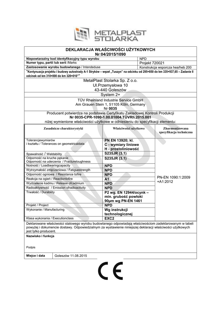 DEKLARACJA WŁAŚCIWOŚCI UŻYTKOWYCH Nr:04/2015/1090 Niepowtarzalny kod identyfikacyjny typu wyrobu Numer typu, partii lub serii /Marks Zastosowanie wyrobu budowlanego / Intendeduse NPD Projekt 720021 Konstrukcja wsporcza hea/heb 200 "Kontynuacja projektu i budowy autostrady A-1 Stryków – węzeł „Tuszyn” na odcinku od 295+850 do km 335+937,65 – Zadanie II odcinek od km 310+000 do km 320+010”" MetalPlast Stolarka Sp. Z o.o. Ul.Przemysłowa 10 43-440 Goleszów System 2+ TÜV Rheinland Industrie Service GmbH Am Grauen Stein 1, 51105 Kőln, Germany Nr 0035 Producent potwierdza na podstawie Certyfikatu Zakładowej Kontroli Produkcji Nr 0035-CPR-1090-1.00.01004.TÜVRh.2015.001 niżej wymienione właściwości użytkowe w odniesieniu do specyfikacji elementu: Zasadnicze charakterystyki Tolerancjewymiarów i kształtu / Tolerances on geometricaldata Spawalność / Weldability Odporność na kruche pękanie Odporność na uderzenia / Fracturetoughness Nośność / Loadbearingcapacity Wytrzymałość zmęczeniowa / Fatiguestrength Odporność ogniowa / Resistance tofire Reakcja na ogień / Reactiontofire Wydzielenie kadmu / Release ofcadmium Radioaktywność / Emission ofradioactivity Trwałość / Durability Projekt / Project Wykonanie / Manufacturing Klasa wykonania / Executionclass Właściwości użytkowe Zharmonizowana specyfikacja techniczna PN EN 13920; kl. C - wymiary liniowe H - prostoliniowość S235JR (3.1) S235JR (3.1) NPD NPD NPD A1 NPD NPD P2 wg. EN 12944/ocynk – min. grubość powłoki 90µm wg PN-EN 1461 NPD Wg instrukcji technologicznej EXC2 PN-EN 1090:1:2009 +A1:2012 Deklarowane właściwości stalowego wyrobu budowlanego odpowiadają właściwościom zadeklarowanym w tabeli powyżej i dokumencie dostawy. Odpowiedzialnym za wystawienie niniejszej deklaracji właściwości użytkowych jest tylko producent. Nazwisko i funkcja Podpis Miejce i data Goleszów 11.08.2015