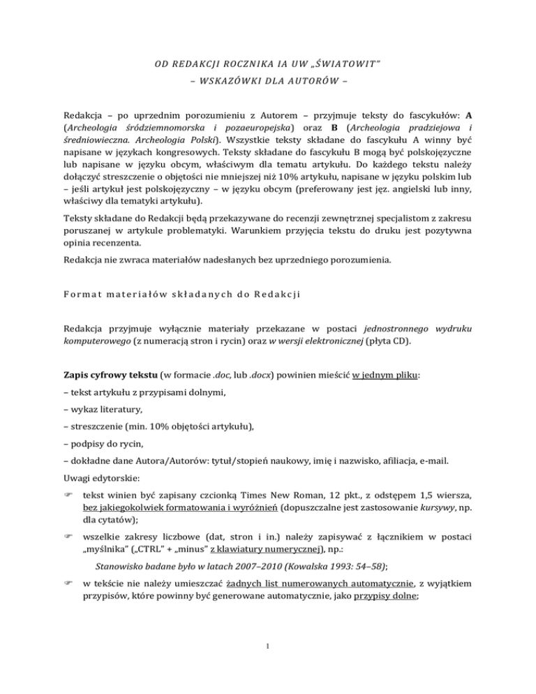 OD REDAKCJI ROCZNIKA IA UW „ŚWIATOWIT” – WSKAZÓWKI DLA AUTORÓW – Redakcja – po uprzednim porozumieniu z Autorem – przyjmuje teksty do fascykułów: A (Archeologia śródziemnomorska i pozaeuropejska) oraz B (Archeologia pradziejowa i średniowieczna. Archeologia Polski). Wszystkie teksty składane do fascykułu A winny być napisane w językach kongresowych. Teksty składane do fascykułu B mogą być polskojęzyczne lub napisane w języku obcym, właściwym dla tematu artykułu. Do każdego tekstu należy dołączyć streszczenie o objętości nie mniejszej niż 10% artykułu, napisane w języku polskim lub – jeśli artykuł jest polskojęzyczny – w języku obcym (preferowany jest jęz. angielski lub inny, właściwy dla tematyki artykułu). Teksty składane do Redakcji będą przekazywane do recenzji zewnętrznej specjalistom z zakresu poruszanej w artykule problematyki. Warunkiem przyjęcia tekstu do druku jest pozytywna opinia recenzenta. Redakcja nie zwraca materiałów nadesłanych bez uprzedniego porozumienia. Format materiałów składanych do Redakcji Redakcja przyjmuje wyłącznie materiały przekazane w postaci jednostronnego wydruku komputerowego (z numeracją stron i rycin) oraz w wersji elektronicznej (płyta CD). Zapis cyfrowy tekstu (w formacie .doc, lub .docx) powinien mieścić w jednym pliku: – tekst artykułu z przypisami dolnymi, – wykaz literatury, – streszczenie (min. 10% objętości artykułu), – podpisy do rycin, – dokładne dane Autora/Autorów: tytuł/stopień naukowy, imię i nazwisko, afiliacja, e-mail. Uwagi edytorskie: tekst winien być zapisany czcionką Times New Roman, 12 pkt., z odstępem 1,5 wiersza, bez jakiegokolwiek formatowania i wyróżnień (dopuszczalne jest zastosowanie kursywy, np. dla cytatów); wszelkie zakresy liczbowe (dat, stron i in.) należy zapisywać z łącznikiem w postaci „myślnika” („CTRL” + „minus” z klawiatury numerycznej), np.: Stanowisko badane było w latach 2007–2010 (Kowalska 1993: 54–58); w tekście nie należy umieszczać żadnych list numerowanych automatycznie, z wyjątkiem przypisów, które powinny być generowane automatycznie, jako przypisy dolne; 1 wszystkie ilustracje zamieszczone w artykule powinny być opisane jako „Ryciny” (lub odpowiednio: „Figures”, „Abbildungen” itp.) z ciągłą numeracją arabską, niezależnie czy są to rysunki, fotografie, mapy itp.; podpisy do rycin powinny zawierać, oprócz opisu, także nazwiska autorów ilustracji lub odesłanie do pracy źródłowej, np. (rys. J. Kowalska) lub (wg Godłowski 1974: tabl. I); pierwsze odwołanie do danej nazwy miejscowej w tekście artykułu winno być uzupełnione o wskazanie jednostki administracyjnej wielkości powiatu lub porównywalnej (np. Kreis w Niemczech); w przypadku transliteracji cyrylicy należy stosować reguły zgodne z normą PN-ISO 9-2000 (plik do pobrania): bg.uwb.edu.pl/download/transliteracja.pdf Pliki graficzne (ryciny) powinny być oryginalnie utworzone lub zeskanowane w rozdzielczości 600 dpi lub większej i zapisane w formacie .tif, w trybie RGB (ilustracje barwne) lub w skali szarości (ilustracje czarno-białe). W przypadku zdjęć cyfrowych dopuszczalny jest format .jpg. Do artykułu należy także dołączyć pomniejszone wersje plików z rycinami (np. w rozdzielczości 150 dpi) tak, aby możliwe było ich przesyłanie w załącznikach poczty elektronicznej. Uwagi szczegółowe: każda ilustracja powinna być zapisana w osobnym pliku graficznym, nazwanym zgodnie z odesłaniem w tekście artykułu (np. Ryc. 1); maksymalne pole rycin pełnowymiarowych wynosi 17×23 cm; podpisy do ilustracji należy zamieszczać wyłącznie w pliku tekstowym (a nie w plikach graficznych); należy unikać zamieszczania na ilustracji opisów, stosując raczej oznaczenia literowe lub cyfrowe i dołączając ich objaśnienie/legendę w podpisie; zalecane jest dołączenie wydruków makiet z sugerowanym przez Autora rozmieszczeniem rycin złożonych na pełnowymiarowej planszy. Wskazówki bibliograficzne Odsyłacze do literatury umieszczane w tekście mogą być utworzone zgodnie z tzw. systemem oksfordzkim lub mieć postać klasycznych przypisów dolnych z podaniem tytułu cytowanej pracy. System oksfordzki W nawiasach okrągłych należy podać nazwisko autora (w przypadku cytowania różnych autorów o tym samym nazwisku należy podać także inicjał imienia) i rok wydania publikacji, wraz z podaniem zakresu stron i ewentualnych ilustracji, np.: (Gąsowski 1987: 121–127); 2 Wszelkie skróty i określenia w aparacie bibliograficznym (zarówno w odsyłaczach, jak i w wykazie literatury) należy stosować zgodnie z językiem złożonego do Redakcji tekstu, np.: (Piątkowska-Małecka i in., w druku: 45, przyp. 2, tabela 2) – dla artykułu w jęz. polskim; (Piątkowska-Małecka et al., in print: 45, note 2, table 2) – dla artykułu w jęz. angielskim; W przypadku kilku prac jednego autora, wydanych w tym samym roku, należy nadać im kolejne litery alfabetu po dacie publikacji. Kolejne cytowane w jednym odwołaniu publikacje należy rozdzielić średnikiem. W przypadku odwołania do kilku prac tego samego autora wystarczy po średniku umieścić datę wydania kolejnej publikacji, np.: (J. Okulicz 1965a: 34–36; 1965b: tabl. IV:1; Ł. Okulicz 1970: 27, przyp. 3) Wykaz tak cytowanej literatury (oraz źródeł wykorzystanych ilustracji) powinien być zestawiony według następującego schematu: Literatura: Kolendo J. 1985 Źródła pisane, (w:) J. Wielowiejski (red.), Prahistoria ziem polskich, t. V: Późny okres lateński i okres rzymski, Wrocław-Warszawa-Kraków-Gdańsk, 9–17. Madyda-Legutko R. 1987a Metalowe części pasów na obszarze kultury zachodniobałtyjskiej w okresie wpływów rzymskich, „Wiadomości Archeologiczne” XLVIII/1 (1983), 21–36. 1987b Die Gürtelschnallen der Römischen Kaiserzeit und der frühen Völkerwanderungszeit im mitteleuropäischen Barbaricum, B