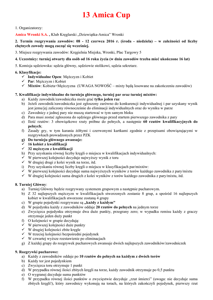 13 Amica Cup 1. Organizatorzy: Amica Wronki S.A. , Klub Kręglarski „Dziewiątka-Amica” Wronki 2. Termin rozgrywania zawodów: 08 - 12 czerwca 2016 r. (środa - niedziela) – w zależności od liczby chętnych zawody mogą zacząć się wcześniej. 3. Miejsce rozgrywania zawodów: Kręgielnia Miejska, Wronki, Plac Targowy 5 4. Uczestnicy: turniej otwarty dla osób od 16 roku życia (w dniu zawodów trzeba mieć ukończone 16 lat) 5. Komisja sędziowska: sędzia główny, sędziowie stolikowi, sędzia sekretarz. 6. Klasyfikacje: ü Indywidualne Open: Mężczyzn i Kobiet ü Par: Mężczyzn i Kobiet ü Mixtów: Kobieta+Mężczyzna (UWAGA NOWOŚĆ – mixty będą losowane na zakończeniu zawodów) 7. Kwalifikacje indywidualne do turnieju głównego, turniej par oraz turniej mixtów: a) Każdy zawodnik/zawodniczka może grać tylko jeden raz b) Jeżeli zawodnik/zawodniczka jest zgłoszony zarówno do konkurencji indywidualnej i par uzyskany wynik jest jemu/jej zaliczony równocześnie do eliminacji indywidualnych oraz do wyniku w parze c) Zawodnicy z jednej pary nie muszą startować w tym samym bloku d) Para musi zostać zgłoszona do sędziego głównego przed startem pierwszego zawodnika z pary e) Ilość rzutów: 3 obowiązkowe rzuty próbne do pełnych, a następnie 60 rzutów kwalifikacyjnych do pełnych; f) Zasady gry, w tym karania żółtymi i czerwonymi kartkami zgodnie z przepisami obowiązującymi w rozgrywkach prowadzonych przez PZK g) Do turnieju głównego awansuje: ü 16 kobiet z kwalifikacji ü 32 mężczyzn z kwalifikacji h) Przy uzyskaniu równej liczby kręgli o miejscu w kwalifikacjach indywidualnych: ü W pierwszej kolejności decyduje najwyższy wynik z toru ü W drugiej drugi z kolei wynik na torze, itd. i) Przy uzyskaniu równej liczby kręgli o miejscu w klasyfikacjach par/mixtów: ü W pierwszej kolejności decyduje suma najwyższych wyników z torów każdego zawodnika z pary/mixtu ü W drugiej kolejności suma drugich z kolei wyników z torów każdego zawodnika z pary/mixtu, itd. 8. Turniej Główny: a) Turniej Główny będzie rozgrywany systemem grupowym a następnie pucharowym. b) Z 32 najlepszych mężczyzn w kwalifikacjach stworzonych zostanie 8 grup, a spośród 16 najlepszych kobiet w kwalifikacjach stworzone zostaną 4 grupy c) W grupie pojedynki rozgrywane są „każdy z każdym” d) W pojedynku każdy z zawodników oddaje 20 rzutów do pełnych na jednym torze e) Zwycięzca pojedynku otrzymuje dwa duże punkty, przegrany zero; w wypadku remisu każdy z graczy otrzymuje jeden duży punkt f) O kolejności w grupie decydują: ü W pierwszej kolejności duże punkty ü W drugiej kolejności zbite kręgle ü W trzeciej kolejności bezpośredni pojedynek ü W czwartej wyższe rozstawienie po eliminacjach g) Z każdej grupy do rozgrywek pucharowych awansuje dwóch najlepszych zawodników/zawodniczek 9. Rozgrywki pucharowe: a) Każdy z zawodników oddaje po 10 rzutów do pełnych na każdym z dwóch torów b) Każdy tor jest pojedynkiem c) Zwycięzca toru otrzymuje 1 punkt d) W przypadku równej ilości zbitych kręgli na torze, każdy zawodnik otrzymuje po 0,5 punktu e) O wygranej decyduje suma punktów f) W przypadku równej ilości punktów o zwycięstwie decyduje „rzut śmierci” (uwaga: nie decyduje suma zbitych kręgli!), który zawodnicy wykonują na torach, na których zakończyli pojedynek, pierwszy rzut śmierci wykonuje zawodnik na torze nieparzystym; jeżeli zawodnicy zbiją w rzucie śmierci taką samą ilość kręgli ponownie oddają po rzucie i tak do momentu wyłonienia zwycięzcy. 10. Mixty: Nowością jest, że mixty będą losowane z wszystkich uczestników podczas zakończenia turnieju w niedzielę. Będziemy losować tyle mixtów ile będziemy mogli stworzyć ze startujących zawodniczek i zawodników. Suma wyników wylosowanych zawodniczek i zawodników, którzy będą tworzyć mixt będą tworzyć klasyfikację. O zwycięstwie decydować będzie lepsza suma dwóch wyników. W drugiej kolejności decydować będzie suma najlepszych torów itd. – podobnie jak w klasyfikacji par. 11. Nagrody: a) Organizatorzy zapewniają nagrody rzeczowe minimum dla: ü 8 najlepszych zawodniczek w klasyfikacji indywidualnej open kobiet, ü 8 najlepszych zawodników w klasyfikacji indywidualnej open mężczyzn, ü miejsc 1 – 4 w klasyfikacji par kobiet, ü miejsc 1 – 6 w klasyfikacji par mężczyzn, ü miejsc 1 – 6 w klasyfikacji mixtów, b) Organizatorzy mogą dokonać zmian ilości osób nagradzanych po zamknięciu listy zgłoszeń. c) Nagrodami będzie sprzęt AGD Amica Wronki S.A. d) dekoracje najlepszych zawodników i zawodniczek we wszystkich klasyfikacjach odbędą się w niedzielę po zakończeniu Turnieju Głównego; warunkiem otrzymania nagrody w klasyfikacjach indywidualnej jest obecność nagradzanego na dekoracji, a w konkurencjach par i mikstów obecna musi być przynajmniej jedna osoba z pary lub mikstu. W przypadku nieobecności nagroda będzie wykorzystana przez organizatorów na innych zawodach. 12. Zgłoszenia do 13 Pucharu Amica Wronki S.A. przyjmowane będą za pomocą formularza internetowego na stronie amicacup.9wronki.pl - w zgłoszeniu należy sugerować możliwy dzień i godzinę gry – będziemy się starali na bieżąco wprowadzać zgłoszenia do terminarza – DECYDUJE KOLEJNOŚĆ ZGŁOSZEŃ. 13. Termin zgłoszeń poniedziałek 1 czerwca 2016 r. godz. 22.00 (ilość zgłoszonych osób będzie na bieżąco publikowana na stronie internetowej amicacup.9wronki.pl ). Zgłaszamy się tylko indywidualnie, pary i miksty zgłasza się do sędziego podczas zawodów – przed startem pierwszego zawodnika/czki z pary i mikstu. 14. Wpisowe: a) turniej indywidualny: 35 zł od osoby b) turniej par: 10 zł od pary c) turniej mixt: bez opłaty (mixty będą losowane na koniec zawodów – podczas zakończenia turnieju) d) chcąc być klasyfikowanym we wszystkich konkurencjach zawodnik wpłaca 40 zł e) wpisowe należy wpłaca