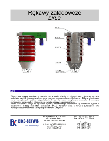 Rękawy załadowcze BKLS Opis Telesk opowe rękawy załadowcz e znajdują zastos owanie głównie przy bezpyłowym załadunk u suchych materiałów sypkich i drobnokawałkowych w trans porcie samoc hodowym i kolejowym. Rękawy zbudowane są z wewnęt rznyc h stożk ów odpowiedzialnych za kierowanie przepły wem materiału. Z zewnątrz zastosowano kompensatory miechowe zapewniając e bezpyłową pracę rękawa. Nasze rozwiąz anie bazują na wy nikach symulacji rzeczy wistego zachowania się materiałów sypkich i kawałk owych met odą elementów dyskretnych (DEM). Jesteśmy jedną z niewielu europejskich firm wykorzystujących możliwości DEM przy projektowaniu urządz eń. Biko-Serwis sp. z o. o. sp. k. al. Partyzant ów 6, 26-060 Chęciny, POLAND e-mail: biuro@ bikoserwis.pl www.bikoserw is.pl www.4industry.pl tel. +48 041 315 30 20 fax +48 041 315 21 68 Sprzedaż: +48 664 195 146 +48 604 131 267 +48 604 195 347 Zasada działania Teleskopowe rękawy załadowcze przeznaczone są do ciągłego załadunku mat eriałów sypkich i drobnokawałkowych z maksymalną wydajnością do 700 m3/h. Dolna część miec ha wyposażana jest w zależności od zastosowania w specjalny kołpak służący do załadunk u cystern lub ot warty wylot do załadunku plat form i ciężarówek. Istnieje możliwość zastosowania (w przy padku cystern) czujnika napełnienia. Rękawy zaopatrzone są w króćce odpyleniowe, które można podłączyć do zewnętrznego odpylacza. Miech załadunkowy opuszczany jest za pomocą wciągarki elektrycznej na króciec cysterny lub dno ciężarówki. Po osiągnięciu miejsca doc elowego poprz ez zamontowany na jednej z linek wyłącznik krańc owy, następuje zatrzymanie miecha co zarazem oznacza gotowość do rozpoczęcia załadunku. Rękawy wyposażone w czujnik napełnienia dostarczają dodatkowy sygnał służący do zat rzymania załadunk u. Dane techniczne Typ Do załadunk u cystern – A, do załadunku samochodów otwart ych – B, hałdujący – C Rozmiar i wydajność BKLS 300: 220 m3/h BKLS 400: 440 m3/h BKLS 500: 700 m3/h Rodzaj stożk ów Stożki wyk onane z blachy 4mm. Połączenie k ołnierzowe DN300/400/500 PN10 wewnęt rznych Króciec odpyleniowy Ø132mm Opylenie Opcja wewnętrznego filtra: F Opcje i akcesoria Miechy w wykonaniu standardowym, wydłużonym lub do podwyższonych temp. Wskaźnik napełnienia (obrotowy lub wibracyjny ) Wibrator wylotowy Odpylacz lokalny Zalety Trzy stalowe linki nośnie zainstalowane poz a obrębem przepły wu materiału, chronią przed przecieraniem się miechów oraz niwelują ewent ualne zaburzenia przepływu. Prowadzenie mat eriału przez wewnęt rzne stożki ograniczają wycieranie miechów i wpływają korzystnie na ich trwałość. Szybka wy miana elementów mieszków zewnętrznych i stożków wewnętrznych bez demontażu całego rękawa Duż a wytrzymałość i elastyczność mieszków zewnęt rznych, zwłaszcza w niskic h temperaturach Zastosowanie sprawdz onych motoredukt orów Nord/SEW Możliwość łatwej rozbudowy (wydłużenia) Biko-Serwis sp. z o. o. sp. k. al. Partyzantów 6, 26-060 Chęciny, POLAND e-mail: [email protected] www.bikoserwis.pl www.4industry.pl tel. +48 041 315 30 20 fax +48 041 315 21 68 Sprzedaż: +48 664 195 146 +48 604 131 267 +48 604 195 347