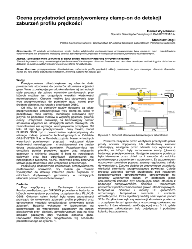 Ocena przydatności przepływomierzy clamp-on do detekcji zaburzeń profilu prędkości Daniel Wysokiński Operator Gazociągów Przesyłowych GAZ-SYSTEM S.A. Stanisław Dagil Polskie Górnictwo Naftowe i Gazownictwo SA oddział Centralne Laboratorium Pomiarowo Badawcze Streszczenie. W artykule przedstawiono wyniki badań właściwości metrologicznych przepływomierza typu clamp-on oraz opracowaną na ich podstawie metodykę detekcji zaburzeń profilu prędkości w istniejących układach pomiarowo-rozliczeniowych. przedstawiono Abstract. "Evaluation of the usefulness of clamp-on flow meters for detecting flow profile disorders" The article presents study on metrological performance of the clamp-on ultrasonic flowmeter and describes developed methodology for disturbances detection in existing custody transfer metering systems for natural gas. Słowa kluczowe: przepływomierze ultradźwiękowe, zaburzenia profilu prędkości, układy pomiarowe do gazu ziemnego, ultrasonic flowmeter, clamp-on, flow profile disturbances detection, metering systems for natural gas Wstęp Przepływomierze ultradźwiękowe są obecnie dość powszechnie stosowane do pomiarów strumienia objętości gazu. Wraz z postępującym udoskonaleniem tej technologii stale poszerza się zakres warunków pomiarowych, przy których możliwe jest osiągnięcie wysokich właściwości metrologicznych. Obecnie możliwe jest stosowanie tego typu przepływomierzy do pomiarów gazu nawet przy średnim ciśnieniu, na rurach o średnicach DN80. Od kilku lat do pomiarów gazów dostępne są także przepływomierze ultradźwiękowe typu clamp-on, które w początkowej fazie rozwoju technologii stosowane były jedynie do pomiarów mediów o większej gęstości, głównie cieczy. Urządzenia pozwalają na bezinwazyjny pomiar strumienia objętości na istniejących rurach stalowych, ich zamontowanie nie wymaga wstrzymywania przepływu. Od kilku lat tego typu przepływomierz firmy Flexim, model FLUXUS G608 był z powodzeniem wykorzystywany do różnego rodzaju pomiarów technologicznych w Oddziale GAZ-SYSTEM S.A. w Rembelszczyźnie. Nawet w trudnych warunkach pomiarowych przyrząd wykazywał dobre właściwości metrologiczne i charakteryzował się bardzo dobrą powtarzalnością pomiarów. Przepływomierz ten umożliwia pomiar przepływu gazów oraz mieszanin gazowych o ciśnieniu powyżej 5 barg na rurociągach stalowych oraz bez ograniczeń ciśnieniowych na rurociągach z tworzywa, np.PE. Możliwość pracy bateryjnej ułatwia jego stosowanie jako urządzenia przewoźnego. Poszukując dodatkowych zastosowań przepływomierza postanowiono sprawdzić, czy można go również wykorzystać do detekcji zaburzeń profilu prędkości w odcinkach dopływowych gazomierzy w istniejących układach pomiarowo-rozliczeniowych. Gazomierz wzorcowy z odcinkami G65 lub G650 1234.56 WENTYLATOR ~400V t wz dp wz SM2 Prosty odcinek dopływowy lub t bad element zakłócający FLU XU S G 608 impulsy HF z gazomierza SM1 dp bad badany przepływomierz RS232 RS485 SM3 t atm p atm IPC Rysunek 1. Schemat stanowiska badawczego w laboratorium Powietrze zasysane przez wentylator przepływało przez prosty odcinek dopływowy lub standardowy element zakłócający, następnie przez odcinek rury wykonany z plastiku, na którym były zamocowane sondy (głowice) badanego przepływomierza. Następnie zasysane powietrze było kierowane przez układ rur i zaworów do odcinka pomiarowego z gazomierzem wzorcowym. Za gazomierzem wzorcowym powietrze poprzez zasuwę regulacyjną trafiało do wentylatora. Zasuwa służyła do precyzyjnego ustawiania wielkości strumienia przepływającego powietrza. Całość procesu zbierania danych przebiegała pod nadzorem specjalistycznego oprogramowania opracowanego na potrzeby wykonanych badań. W odstępach jedno sekundowych zbierane były następujące dane: strumień z badanego przepływomierza, ciśnienie i temperatura powietrza w pobliżu zamocowania głowic ultradźwiękowych, temperatura, ciśnienie i impulsy HF gazomierza wzorcowego, temperatura otoczenia i ciśnienie atmosferyczne. Czas rejestracji każdej serii wynosił ponad 512s. Przykładowe wykresy rejestracji strumienia powietrza z przepływomierza i gazomierza wzorcowego pokazano na rysunku 2 (bez elementu zakłócającego) oraz 3 i 4, gdzie elementem zakłócającym było pojedyncze i podwójne kolanko bez przesłony. Badania Przy współpracy z Centralnym Laboratorium Pomiarowo-Badawczym O/PGNiG prowadzono badania, w których wykorzystano posiadany przepływomierz FLUXUS G608. Głównym celem badań była ocena przydatności przyrządu do wykrywania zaburzeń profilu prędkości oraz opracowanie metodyki umożliwiającej wykrywanie takich zaburzeń. Badania wykonano w laboratorium na stanowiskach do wzorcowania gazomierzy na rurach plastikowych przy ciśnieniu atmosferycznym oraz na kilku stacjach gazowych przy wysokim ciśnieniu gazu. Stanowisko laboratoryjne przygotowano wg schematu przedstawionego na rysunku 1. 1 Rysunek 2. Schemat stanowiska i zarejestrowany przebieg zmian strumienia dla układu „bez zakłóceń” Badania wskazały, że wielkość fluktuacji strumienia w przypadku prostego odcinka rury bez elementu zakłócającego jest niewielka. W przypadku pojedynczego lub podwójnego kolana wielkość fluktuacji strumienia jest znacznie większa . Rysunek 4. Schemat stanowiska i zarejestrowany przebieg zmian strumienia dla układu „podwójne kolano” Do opracowania metodyki wykrywania zaburzeń przepływu użyto parametru odnoszącego się do odchylenia standardowego rejestrowanego strumienia objętości przepływającego gazu, nazywanego na potrzeby pracy „ssigma”, który jest obliczany wg poniższej zależności: n qi ssigma (1) q śr 2 i 1 n 1 gdzie: qi - chwilowa wartość strumienia, qśr - wartość średnia strumienia, n - liczba pomiarów. Drugim wyznaczanym parametrem był błąd liczony wg wzoru: (2) e Qzmierzone Q poprawne Q poprawne 100 