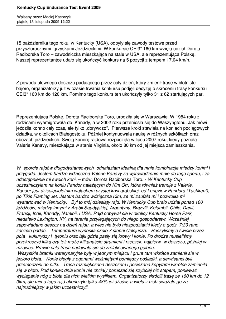 Kentucky Cup Endurance Test Event 2009 Wpisany przez Maciej Kacprzyk piątek, 13 listopada 2009 12:22 15 października tego roku, w Kentucky (USA), odbyły się zawody testowe przed przyszłorocznymi Igrzyskami Jeździeckimi. W konkursie CEI3* 160 km wzięła udział Dorota Raciborska Toro – zawodniczka mieszkająca na stałe w USA, ale reprezentująca Polskę. Naszej reprezentantce udało się ukończyć konkurs na 5 pozycji z tempem 17,04 km/h. Z powodu ulewnego deszczu padającego przez cały dzień, który zmienił trasę w błotniste bajoro, organizatorzy już w czasie trwania konkursu podjęli decyzję o skróceniu trasy konkursu CEI3* 160 km do 120 km. Pomimo tego konkurs ten ukończyły tylko 31 z 62 startujących par. Reprezentująca Polskę, Dorota Raciborska Toro, urodziła się w Warszawie. W 1984 roku z rodzicami wyemigrowała do Kanady, a w 2002 roku przeniosła się do Waszyngtonu. Jak mówi jeździła konno cały czas, ale tylko „dorywczo”. Pierwsze kroki stawiała na koniach pociągowych dziadka, w okolicach Białegostoku. Później kontynuowała naukę w różnych szkółkach oraz obozach jeździeckich. Swoją karierę rajdową rozpoczęła w lipcu 2007 roku, kiedy poznała Valerie Kanavy, mieszkająca w stanie Virginia, około 80 km od jej miejsca zamieszkania. W sporcie rajdów długodystansowych odnalazłam idealną dla mnie kombinacje miedzy końmi i przygoda. Jestem bardzo wdzięczna Valerie Kanavy za wprowadzenie mnie do tego sportu, i za udostępnienie mi swoich koni. – mówi Dorota Raciborska Toro. - W Kentucky Cup uczestniczyłam na koniu Pandor należącym do Kim Orr, która również trenuje z Valerie. Pandor jest dziesięcioletnim wałachem czystej krwi arabskiej, od Longview Pandora (Tashkent), po Tikis Flaming Jet. Jestem bardzo wdzięczna Kim, że mi zaufała mi i pozwoliła mi wystartować w Kentucky. Był to mój dziesiąty rajd. W Kentucky Cup brało udział ponad 100 jeźdźców, miedzy innymi z Arabii Saudyjskiej, Argentyny, Brazylii, Kolumbii, Chile, Danii, Francji, Indii, Kanady, Namibii, i USA. Rajd odbywał sie w okolicy Kentucky Horse Park, niedaleko Lexington, KY, na terenie przylegających do niego gospodarstw. Wcześniej zapowiadano deszcz na dzień rajdu, a wiec nie było niespodzianki kiedy o godz. 7:30 rano zaczęło padać. Temperatura wynosiła około 7 stopni Celsjusza. Ruszyliśmy o świcie przez pola kukurydzy i tytoniu oraz łąki gdzie pasły się krowy i konie. Po drodze musieliśmy przekroczyć kilka czy też może kilkanaście strumieni i rzeczek, najpierw w deszczu, później w mżawce. Prawie cala trasa nadawała się do zrelaksowanego galopu. Wszystkie bramki weterynaryjne były w jednym miejscu i grunt tam wkrótce zamienił sie w jezioro błota. Konie biegły z ogonami wciśniętymi pomiędzy pośladki, a serwisanci byli przemoczeni do nitki. Trasa rozmiękczona deszczem i posiekana kopytami wkrótce zamieniła się w błoto. Pod koniec dnia konie nie chciały poruszać się szybciej niż stepem, ponieważ wyciąganie nóg z błota dla nich wielkim wysiłkiem. Organizatorzy skrócili trasę ze 160 km do 12 0km, ale mimo tego rajd ukończyło tylko 48% jeźdźców, a wielu z nich uważało go za najtrudniejszy w jakim uczestniczyli. 1/3 Kentucky Cup Endurance Test Event 2009 Wpisany przez Maciej Kacprzyk piątek, 13 listopada 2009 12:22 W ramach zawodów, których oficjalna nazwa brzmiała „Kentucky Cup Endurance Test Event”, rozegrano również konkurs CEI2* 120 km, w którym Polskę reprezentowała Juliette Fusiarska-Cannon, zawodniczka również na stałe mieszkająca w USA. Wyniki CEI3* 160 km Eliminacje CEI3* 160 km Lista startowa CEI3* 160 km Wyniki CEI2* 120 km Eliminacje CEI2* 120 km Lista startowa CEI2* 120 km Kentucky Cup Endurance Test Event 2009 na Endurance.net 2/3 Kentucky Cup Endurance Test Event 2009 Wpisany przez Maciej Kacprzyk piątek, 13 listopada 2009 12:22 2010 Alltech FEI World Equestrian Games - Strona oficjalna 3/3