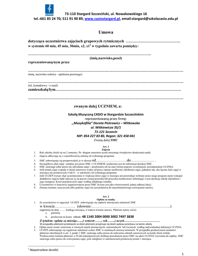 73-110 Stargard Szczeciński, ul. Nowakowskiego 16 tel.:661 85 24 70; 511 91 90 89, www.casiostargard.pl, email:[email protected] Umowa dotycząca uczestnictwa zajęciach grupowych rytmicznych …………………………………… w systemie 60 min, 45 min, 30min, x2, x11 w tygodniu zawarta pomiędzy: ………………………………………………………………………………………….. (imię,nazwisko,pesel) reprezentowaną/nym przez ………………………………………………………………………………………………………… (imię, nazwisko rodzica - opiekuna prawnego) ………………………………………………………………………………………………………… (tel. kontaktowy / e-mail) zamieszkałą/łym……………………………………………………………………………………. ………………………………………………………………………………………………………… zwanym dalej UCZNIEM, a: Szkołą Muzyczną CASIO w Stargardzie Szczecińskim reprezentowaną przez firmę: ,,Muzykofilia” Dorota Piotrowicz – Witkowska ul. Witkiewicza 35/1 71-121 Szczecin NIP: 854 227 83 80, Regon: 321 458 041 Zwaną dalej SMC 1. 2. Art. 1 Zajęcia Rok szkolny dzieli się na 2 semestry. Po drugim semestrze uczeń otrzymuje świadectwo ukończenia nauki. Zajęcia odbywają się z częstotliwością zależną od wybranego programu 8. 9. SMC zobowiązuje się przeprowadzić je w okresie od……………………do……………… . Szczegółowy plan zajęć ustalany jest przez SMC z UCZNIEM i podawany jest do informacji dyrekcji SMC. SMC zastrzega sobie prawo do odwołania zajęć i przełożenia ich na inny termin poprzez wcześniejsze zawiadomienie UCZNIA. Jeśli termin zajęć wypada w dzień ustawowo wolny od pracy istnieje możliwość odrobienia zajęć, jednakże tak, aby łączna ilość zajęć w miesiącu nie przekroczyła 4 lub 8 – w zależności od wybranego programu. Jeśli UCZEŃ wyrazi chęć uczestniczenia w większej ilości zajęć w miesiącu niż przewiduje wybrany przez niego program może wykupić dodatkowe zajęcia bądź zaliczyć je na poczet swojej przeszłej lub przyszłej nieobecności informując o tym dyrekcję szkoły (dyrektora i jego zastępcę). Koszt pojedynczych zajęć według odrębnego cennika. Uczestnictwo w koncercie organizowanym przez SMC liczone jest jako równowartość jednej odbytej lekcji. Zmiana terminu, nauczyciela albo godziny zajęć nie jest podstawą do natychmiastowego rozwiązania umowy. 1. Art. 2 Opłata za naukę Za uczestnictwo w zajęciach UCZEŃ zobowiązuje się zapłacić miesięcznie należność SMC 3. 4. 5. 6. 7. w kwocie……………. (słownie:…………………………………………………….) najpóźniej do dnia …… każdego miesiąca, w trakcie trwania umowy. Płatność należy uiścić: a. gotówką b. przelewem na konto mBank: 48 1140 2004 0000 3002 7497 3838 Z tytułem: opłata za miesiąc…..,( semestr……, rok…….) uczeń…………………………… 2. 3. 1 W przypadku płatności przelewem za dzień płatności przyjmuje się dzień wpływu przelewu na konto szkoły. Opłata może zostać wniesiona w równych ratach miesięcznych, semestralnych lub rocznych, według indywidualnej deklaracji UCZNIA. UCZEŃ zobowiązuje się regulować należność wobec SMC w ustalonych umową terminach. W przypadku przekroczenia terminów płatności określonych w art. 2, punkt 1 SMC zastrzega sobie prawo do naliczenia odsetek ustawowych za każdy dzień zwłoki. Przekroczenie terminu płatności o 20 dni kalendarzowych skutkuje przesłaniem przez SMC na adres UCZNIA wezwania do zapłaty. SMC zastrzega sobie prawo do wstrzymania zajęć, jeśli zaległości w należnościach przekroczą termin 1 miesiąca. Niepotrzebne skreślić. 1 73-110 Stargard Szczeciński, ul. Nowakowskiego 16 tel.:661 85 24 70; 511 91 90 89, www.casiostargard.pl, email:[email protected] 4. Jeśli SMC zadecyduje o przydziale UCZNIA do grupy o młodszym lub starszym przedziale wiekowym niż jego obecny powiadamia o tym UCZNIA. Cena za zajęcia będzie wynosiła tyle ile opłata w danej grupie. Art. 3 Nieobecność ucznia 1. 2. 3. W przypadku zaplanowanej nieobecności UCZNIA na zajęciach, należy powiadomić o tym fakcie SMC, co najmniej z trzygodzinnym wyprzedzeniem. W przeciwnym razie – zajęcia przepadają i opłata się nie zmienia. W przypadku usprawiedliwionej i zgłoszonej trzy godziny wcześniej nieobecności UCZNIA na zajęciach, nauczyciel może odrobić lekcję w innym terminie lub wydłużyć czas zajęć, na prośbę rodzica po uprzednim powiadomieniu dyrekcji SMC (dyrektora albo Jego zastępcę) oraz UCZNIA o wybranej formie odrabiania. W przypadku gdy choroba UCZNIA trwa minimum 2 opuszczone zajęcia i jest udokumentowana zwolnieniem lekarskim, nie będzie pobierana opłata za opuszczone zajęcia. Jeśli powstanie w ten sposób nadpłata, to następna wpłata pomniejszona będzie o tę kwotę. Chorobę UCZNIA należy zgłosić w pierwszym tygodniu jej trwania, w przeciwnym razie nie będzie możliwości zwrotu nadpłaty Art. 4 Czas trwania umowy i odstąpienie od niej 1. 2. 3. SMC zobowiązuje się zorganizować i przeprowadzić zajęcia, zaś uczeń jest zobowiązany uczestniczyć w nich w okresie wymienionym w Art.1 pkt 3 Za okres wypowiedzenia umowy w następnych miesiącach jej trwania, uważa się termin 30 dni kalendarzowych od daty wpłynięcia do SMC pisemnego wniosku rezygnacyjnego UCZNIA. Termin oraz sposób wypowiedzenia umowy obowiązuje obydwie strony Art. 5 Inne postanowienia umowy 1. 2. Za bezpieczeństwo UCZNIA w drodze do szkoły jak i po zajęciach odpowiedzialni są rodzice lub opiekunowie. UCZEŃ wyraża zgodę, aby w trakcie zajęć wykonywane były zdjęcia, nagrania audio i wideo wykorzystywane przez SMC wyłącznie w celach marketingowych na stronie internetowej, ulo
