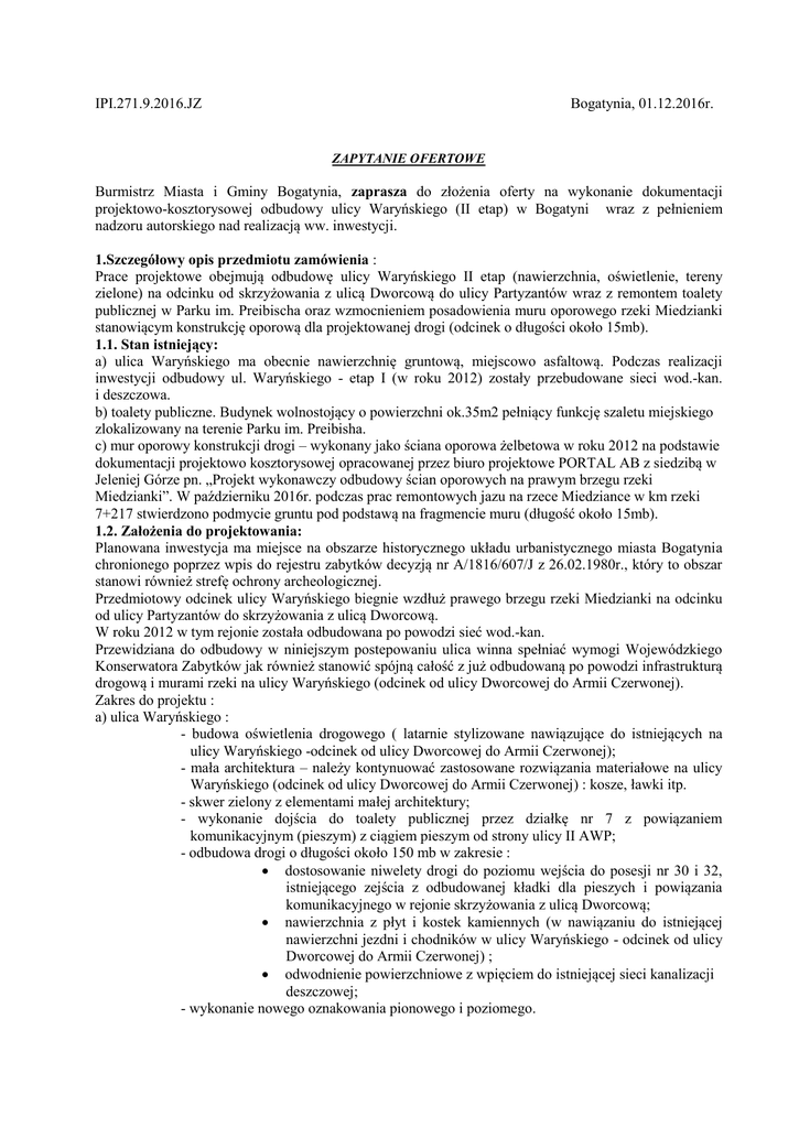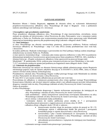 IPI.271.9.2016.JZ Bogatynia, 01.12.2016r. ZAPYTANIE OFERTOWE Burmistrz Miasta i Gminy Bogatynia, zaprasza do złożenia oferty na wykonanie dokumentacji projektowo-kosztorysowej odbudowy ulicy Waryńskiego (II etap) w Bogatyni wraz z pełnieniem nadzoru autorskiego nad realizacją ww. inwestycji. 1.Szczegółowy opis przedmiotu zamówienia : Prace projektowe obejmują odbudowę ulicy Waryńskiego II etap (nawierzchnia, oświetlenie, tereny zielone) na odcinku od skrzyżowania z ulicą Dworcową do ulicy Partyzantów wraz z remontem toalety publicznej w Parku im. Preibischa oraz wzmocnieniem posadowienia muru oporowego rzeki Miedzianki stanowiącym konstrukcję oporową dla projektowanej drogi (odcinek o długości około 15mb). 1.1. Stan istniejący: a) ulica Waryńskiego ma obecnie nawierzchnię gruntową, miejscowo asfaltową. Podczas realizacji inwestycji odbudowy ul. Waryńskiego - etap I (w roku 2012) zostały przebudowane sieci wod.-kan. i deszczowa. b) toalety publiczne. Budynek wolnostojący o powierzchni ok.35m2 pełniący funkcję szaletu miejskiego zlokalizowany na terenie Parku im. Preibisha. c) mur oporowy konstrukcji drogi – wykonany jako ściana oporowa żelbetowa w roku 2012 na podstawie dokumentacji projektowo kosztorysowej opracowanej przez biuro projektowe PORTAL AB z siedzibą w Jeleniej Górze pn. „Projekt wykonawczy odbudowy ścian oporowych na prawym brzegu rzeki Miedzianki”. W październiku 2016r. podczas prac remontowych jazu na rzece Miedziance w km rzeki 7+217 stwierdzono podmycie gruntu pod podstawą na fragmencie muru (długość około 15mb). 1.2. Założenia do projektowania: Planowana inwestycja ma miejsce na obszarze historycznego układu urbanistycznego miasta Bogatynia chronionego poprzez wpis do rejestru zabytków decyzją nr A/1816/607/J z 26.02.1980r., który to obszar stanowi również strefę ochrony archeologicznej. Przedmiotowy odcinek ulicy Waryńskiego biegnie wzdłuż prawego brzegu rzeki Miedzianki na odcinku od ulicy Partyzantów do skrzyżowania z ulicą Dworcową. W roku 2012 w tym rejonie została odbudowana po powodzi sieć wod.-kan. Przewidziana do odbudowy w niniejszym postepowaniu ulica winna spełniać wymogi Wojewódzkiego Konserwatora Zabytków jak również stanowić spójną całość z już odbudowaną po powodzi infrastrukturą drogową i murami rzeki na ulicy Waryńskiego (odcinek od ulicy Dworcowej do Armii Czerwonej). Zakres do projektu : a) ulica Waryńskiego : - budowa oświetlenia drogowego ( latarnie stylizowane nawiązujące do istniejących na ulicy Waryńskiego -odcinek od ulicy Dworcowej do Armii Czerwonej); - mała architektura – należy kontynuować zastosowane rozwiązania materiałowe na ulicy Waryńskiego (odcinek od ulicy Dworcowej do Armii Czerwonej) : kosze, ławki itp. - skwer zielony z elementami małej architektury; - wykonanie dojścia do toalety publicznej przez działkę nr 7 z powiązaniem komunikacyjnym (pieszym) z ciągiem pieszym od strony ulicy II AWP; - odbudowa drogi o długości około 150 mb w zakresie : dostosowanie niwelety drogi do poziomu wejścia do posesji nr 30 i 32, istniejącego zejścia z odbudowanej kładki dla pieszych i powiązania komunikacyjnego w rejonie skrzyżowania z ulicą Dworcową; nawierzchnia z płyt i kostek kamiennych (w nawiązaniu do istniejącej nawierzchni jezdni i chodników w ulicy Waryńskiego - odcinek od ulicy Dworcowej do Armii Czerwonej) ; odwodnienie powierzchniowe z wpięciem do istniejącej sieci kanalizacji deszczowej; - wykonanie nowego oznakowania pionowego i poziomego. b) toalety publiczne : jest to obiekt murowany o powierzchni ok.35m2. W ramach planowanych prac remontowych przewiduje się : wymianę wyposażenia (ustępy, umywalki itp.), wymiana pokrycia dachowego wraz z odwodnieniem, wymiana okładzin ściennych i podłogowych oraz tynków wewnętrznych i zewnętrznych, wymiana stolarki okiennej i drzwiowej, wymiana instalacji elektrycznej oraz wod.-kan. c) wzmocnienie i uzupełnienie wymytego (pod fragmentem muru oporowego) gruntu. 1.3. Zakres prac projektowych Dokumentacja projektowo-kosztorysowa odbudowy ulicy Waryńskiego II etap oraz remont toalet publicznych w zakresie : - projekt budowlany – 5 egz. ( w tym 2 egz. dla Starostwa) - projekt wykonawczy z podziałem na poszczególne branże – 4 egz. - ocena stanu technicznego fragmentu ściany oporowej pod którą stwierdzono podmycie gruntu oraz wykonanie dokumentacji technicznej prac naprawczych (uzupełnienie podbudowy, zabezpieczenie ściany przed ponownym podmyciem, naprawa ewentualnych uszkodzeń konstrukcji) w zakresie uzależnionym od szczegółowych badań i wyników oceny stanu technicznego – 4 egz. - specyfikacja techniczna wykonania i odbioru robót – 4 egz. - projekt organizacji ruchu drogowego na czas budowy – 4 egz. - docelowy projekt organizacji ruchu – 4 egz. - przedmiar robót z podziałem na poszczególne branże – 4 egz. - kosztorys inwestorski z podziałem na poszczególne branże– 2 egz. - zbiorcze zestawienie kosztów – 5 egz. - pozwolenie na budowę lub zaświadczenie przyjęcia zgłoszenia robót nie wymagających pozwolenia na budowę; - całość dokumentacji na nośniku elektronicznym typu CD-R – 3 szt. 1.4. Do obowiązków projektanta należy : - wykonanie aktualnej mapy do celów projektowych, - uzyskanie wypisów i wyrysów z ewidencji gruntów, - uzgodnienia projektu z właścicielami sieci, - uzgodnienia projektu z właścicielami terenu, - uzgodnienia projektu w zakresie kolizji (w przypadku ich wystąpienia) z właścicielami zainteresowanych stron oraz (w razie konieczności) wykonanie projektu likwidacji tych kolizji wg wytycznych właściciela sieci, - dokonanie wszystkich niezbędnych uzgodnień wymaganych do uzyskania pozwolenia na budowę lub przyjęcia zgłoszenia rozpoczęcia robót nie wymagających pozwolenia na budowę. 1.5. Dokumentacja winna zawierać: - optymalne rozwiązania technologiczne, konstrukcyjne, materiałowe i