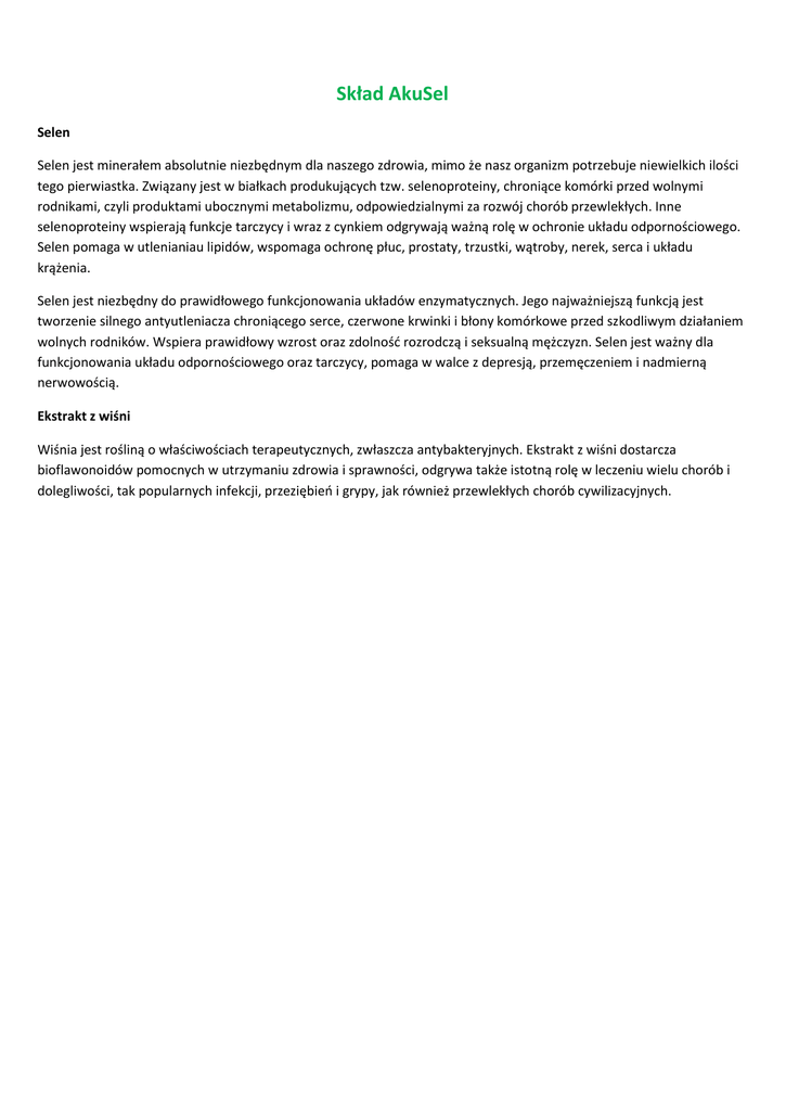 Skład AkuSel Selen Selen jest minerałem absolutnie niezbędnym dla naszego zdrowia, mimo że nasz organizm potrzebuje niewielkich ilości tego pierwiastka. Związany jest w białkach produkujących tzw. selenoproteiny, chroniące komórki przed wolnymi rodnikami, czyli produktami ubocznymi metabolizmu, odpowiedzialnymi za rozwój chorób przewlekłych. Inne selenoproteiny wspierają funkcje tarczycy i wraz z cynkiem odgrywają ważną rolę w ochronie układu odpornościowego. Selen pomaga w utlenianiau lipidów, wspomaga ochronę płuc, prostaty, trzustki, wątroby, nerek, serca i układu krążenia. Selen jest niezbędny do prawidłowego funkcjonowania układów enzymatycznych. Jego najważniejszą funkcją jest tworzenie silnego antyutleniacza chroniącego serce, czerwone krwinki i błony komórkowe przed szkodliwym działaniem wolnych rodników. Wspiera prawidłowy wzrost oraz zdolność rozrodczą i seksualną mężczyzn. Selen jest ważny dla funkcjonowania układu odpornościowego oraz tarczycy, pomaga w walce z depresją, przemęczeniem i nadmierną nerwowością. Ekstrakt z wiśni Wiśnia jest rośliną o właściwościach terapeutycznych, zwłaszcza antybakteryjnych. Ekstrakt z wiśni dostarcza bioflawonoidów pomocnych w utrzymaniu zdrowia i sprawności, odgrywa także istotną rolę w leczeniu wielu chorób i dolegliwości, tak popularnych infekcji, przeziębień i grypy, jak również przewlekłych chorób cywilizacyjnych.