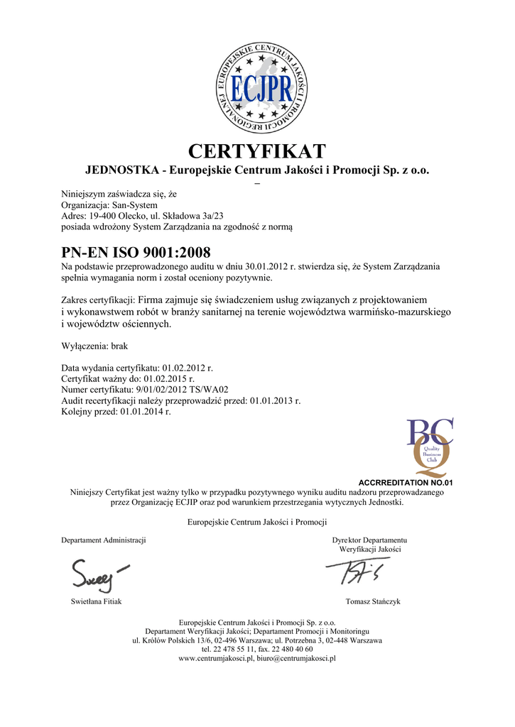 CERTYFIKAT JEDNOSTKA - Europejskie Centrum Jakości i Promocji Sp. z o.o. – Niniejszym zaświadcza się, że Organizacja: San-System Adres: 19-400 Olecko, ul. Składowa 3a/23 posiada wdrożony System Zarządzania na zgodność z normą PN-EN ISO 9001:2008 Na podstawie przeprowadzonego auditu w dniu 30.01.2012 r. stwierdza się, że System Zarządzania spełnia wymagania norm i został oceniony pozytywnie. Zakres certyfikacji: Firma zajmuje się świadczeniem usług związanych z projektowaniem i wykonawstwem robót w branży sanitarnej na terenie województwa warmińsko-mazurskiego i województw ościennych. Wyłączenia: brak Data wydania certyfikatu: 01.02.2012 r. Certyfikat ważny do: 01.02.2015 r. Numer certyfikatu: 9/01/02/2012 TS/WA02 Audit recertyfikacji należy przeprowadzić przed: 01.01.2013 r. Kolejny przed: 01.01.2014 r. ACCRREDITATION NO.01 Niniejszy Certyfikat jest ważny tylko w przypadku pozytywnego wyniku auditu nadzoru przeprowadzanego przez Organizację ECJIP oraz pod warunkiem przestrzegania wytycznych Jednostki. Europejskie Centrum Jakości i Promocji Departament Administracji Swietłana Fitiak Dyre ktor Departamentu Weryfikacji Jakości Tomasz Stańczyk Europejskie Centrum Jakości i Promocji Sp. z o.o. Departament Weryfikacji Jakości; Departament Promocji i Monitoringu ul. Królów Polskich 13/6, 02-496 Warszawa; ul. Potrzebna 3, 02-448 Warszawa tel. 22 478 55 11, fax. 22 480 40 60 www.centrumjakosci.pl, [email protected]