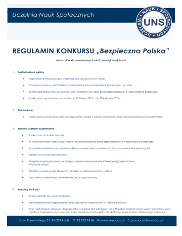 Łódź, dn. ……………………2014 r. Uczelnia Nauk Społecznych REGULAMIN KONKURSU „Bezpieczna Polska” dla uczniów klas mundurowych szkół ponadgimnazjalnych 1. 2. Postanowienia ogólne • Organizatorem Konkursu jest Uczelnia Nauk Społecznych w Łodzi • Partnerem Konkursu jest Wyższa Szkoła Edukacji Zdrowotnej i Nauk Społecznych w Łodzi. • Konkurs jest skierowany do uczniów klas mundurowych szkół ponadgimnazjalnych z województwa Łódzkiego. • Konkurs jest organizowany w okresie od 20 lutego 2015 r. do 30 kwietnia 2015 r. Cel konkursu • 3. 4. Celem głównym Konkursu jest propagowanie wiedzy z zakresu obronności kraju i bezpieczeństwa wewnętrznego. Warunki i zasady uczestnictwa • Konkurs ma charakter otwarty. • W Konkursie może wziąć udział każda szkoła na poziomie ponadgimnazjalnym z województwa Łódzkiego. • Uczestnikami Konkursu są uczniowie, którzy wyrażą chęć uczestnictwa (z wyłączeniem klas pierwszych). • Udział w Konkursie jest bezpłatny. • Wszystkie informacje będą na bieżąco publikowane na stronie internetowej Organizatora: http://uns.lodz.pl • Wszelkie pytania proszę kierować na adres e-mail: [email protected] • Zgłoszenia nadesłane po terminie nie będą rozpatrywane. Przebieg konkursu • Konkurs składa się z dwóch etapów. • Szkoła przesyła do Organizatora Kartę Zgłoszenia Uczestnictwa w I Etapie Konkursu. • Etap I jest etapem szkolnym. Jego podstawą będzie test składający się z 30 pytań. Test jest opracowany i przesłany wraz z osobno zabezpieczonym kluczem odpowiedzi do poszczególnych szkół przez organizatora. Celem tego etapu jest ul. Kamińskiego 21, 90-229 Łódź 42 232 74 86 www.uns.lodz.pl [email protected] wyłonienie 4 najlepszych osób, które wezmą udział w II Etapie Konkursu. Nad prawidłowością przebiegu testu czuwa Szkolna Komisja Konkursowa składająca się z co najmniej 2 nauczycieli wyłonionych przez Dyrektora danej placówki. 5. 6. • Szkoła przesyła do Organizatora listę uczniów którzy uzyskali najwyższą ilość punktów z testu zgodnie z Kartą Zgłoszenia Uczestników II Etapu. Do listy dołączone zostaną testy wszystkich uczestników Konkursu, którzy brali udział w Etapie I. • Etap II jest etapem pozaszkolnym i będzie prowadzony przez Organizatora w jego siedzibie. Będzie to test wiedzy składający się z 30 pytań. Celem tego etapu jest wyłonienie 3 osób (laureaci Konkursu) o najwyższym poziomie wiedzy z zakresu obronności i bezpieczeństwa wewnętrznego kraju. • Laureaci Konkursu otrzymają nagrody, adekwatnie do zajętego miejsca w Konkursie. • Wszyscy uczestnicy II Etapu Konkursu otrzymają dyplomy potwierdzające ich uczestnictwo. • Wszyscy uczestnicy II Etapu Konkursu otrzymają nagrodę rzeczową. • Laureat i Finaliści Konkursu po złożeniu wymaganych dokumentów zostają przyjęci na wybrany przez nich kierunek studiów pierwszego stopnia realizowanych w Uczelni Nauk Społecznych bez udziału w postępowaniu rekrutacyjnym. Harmonogram konkursu • Do 10.03.2015 r. - nadsyłanie Kart uczestnictwa w I Etapie Konkursu • 16 - 20.03.2015 r. - I Etap Konkursu (etap szkolny) • Do 31.03.2015 r. - szkoły przesyłają Kartę Zgłoszenia Uczestników II Etapu wraz z testami wszystkich uczestników I Etapu • 14.04.2015 r. - II Etap Konkursu oraz Uroczyste wręczenie nagród i dyplomów Postanowienia końcowe • Przystąpienie do Konkursu jest równoznaczne z akceptacją jego warunków. • W wyjątkowych sytuacjach Organizator zastrzega sobie prawo do zmian w Regulaminie Konkursu, które nie będą jednak naruszały jego ogólnych zasad. • Organizator Konkursu nie ponosi odpowiedzialności za odwołanie Konkursu bądź zmiany w jego harmonogramie, które wyniknęły z przyczyn od niego niezależnych. • Kwestie nieuregulowane w niniejszym regulaminie będą rozstrzygane przez Organizatora. • Wszystkie testy i protokoły konkursowe zostają u Organizatora. • Bliższych informacji udziela Organizator Konkursu: Uczelnia Nauk Społecznych 90-229 Łódź, ul. Kamińskiego 21 42 232 74 86 [email protected] ul. Kamińskiego 21, 90-229 Łódź 42 232 74 86 www.uns.lodz.pl [email protected] ul. Kamińskiego 21, 90-229 Łódź 42 232 74 86 www.uns.lodz.pl [email protected]