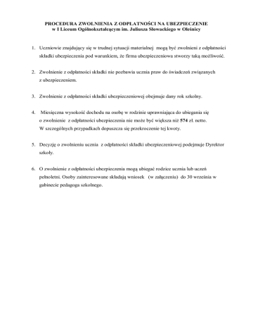 PROCEDURA ZWOLNIENIA Z ODPŁATNOŚCI NA UBEZPIECZENIE w I Liceum Ogólnokształcącym im. Juliusza Słowackiego w Oleśnicy 1. Uczniowie znajdujący się w trudnej sytuacji materialnej mogą być zwolnieni z odpłatności składki ubezpieczenia pod warunkiem, że firma ubezpieczeniowa stworzy taką możliwość. 2. Zwolnienie z odpłatności składki nie pozbawia ucznia praw do świadczeń związanych z ubezpieczeniem. 3. Zwolnienie z odpłatności składki ubezpieczeniowej obejmuje dany rok szkolny. 4. Miesięczna wysokość dochodu na osobę w rodzinie uprawniająca do ubiegania się o zwolnienie z odpłatności ubezpieczenia nie może być większa niż 574 zł. netto. W szczególnych przypadkach dopuszcza się przekroczenie tej kwoty. 5. Decyzję o zwolnieniu ucznia z odpłatności składki ubezpieczeniowej podejmuje Dyrektor szkoły. 6. O zwolnienie z odpłatności ubezpieczenia mogą ubiegać rodzice ucznia lub uczeń pełnoletni. Osoby zainteresowane składają wniosek (w załączeniu) do 30 września w gabinecie pedagoga szkolnego. załącznik nr 1 Oleśnica , dn. ………………… DANE RODZICÓW (PRAWNYCH OPIEKUNÓW) Imię: ……………………………………………… Nazwisko: …………………………………….… Adres:……………………………………………. Dyrektor I Liceum Ogólnokształcące im. Juliusza Słowackiego w Oleśnicy Wniosek o zwolnienie z odpłatności ubezpieczenia Proszę o zwolnienie z odpłatności na ubezpieczenia syn/córka……………………………… , uczeń/uczennica klasy ……………………………... w roku szkolnym 201…/201…. UZASADNIENIE ……………………………………………………………………………………………………. ……………………………………………………………………………………………………. ……………………………………………………………………………………………………. ……………………………………………………………………………………………………. …………………………………………………………………………………………………… Miesięczny dochód netto na osobę w rodzinie wynosi……… Jestem świadoma(y) odpowiedzialności karnej z art. 233 Kodeksu karnego za złożenie fałszywego oświadczenia. ……………………………………………… Podpis rodzica (opiekuna) Oleśnica , dn. ………………… DANE UCZNIA PEŁNOLETNIEGO Imię: ……………………………………………… Nazwisko: …………………………………….… Adres:……………………………………………. Dyrektor I Liceum Ogólnokształcące im. Juliusza Słowackiego w Oleśnicy Wniosek o zwolnienie z odpłatności ubezpieczenia Proszę o zwolnienie mnie z odpłatności na ubezpieczenia w roku szkolnym 201…/201…. UZASADNIENIE ……………………………………………………………………………………………………. ……………………………………………………………………………………………………. ……………………………………………………………………………………………………. ……………………………………………………………………………………………………. …………………………………………………………………………………………………… Miesięczny dochód netto na osobę w rodzinie wynosi……… Jestem świadoma(y) odpowiedzialności karnej z art. 233 Kodeksu karnego za złożenie fałszywego oświadczenia. ……………………………………………… Podpis rodzica (opiekuna)