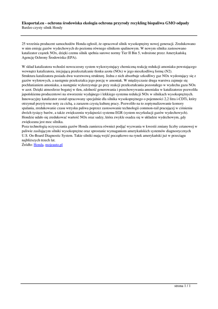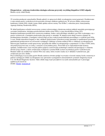 Ekoportal.eu - ochrona środowiska ekologia ochrona przyrody recykling biopaliwa GMO odpady Bardzo czysty silnik Hondy 25 września producent samochodów Honda ogłosił, że opracował silnik wysokoprężny nowej generacji. Zredukowano w nim emisję gazów wydechowych do poziomu równego silnikom spalinowym. W nowym silniku zastosowano katalizator cząstek NOx, dzięki czemu silnik spełnia surowe normy Tier II Bin 5, wdrożone przez Amerykańską Agencję Ochrony Środowiska (EPA). W skład katalizatora wchodzi nowoczesny system wykorzystujący chemiczną reakcję redukcji amoniaku powstającego wewnątrz katalizatora, inicjującą przekształcanie tlenku azotu (NOx) w jego nieszkodliwą formę (N2). Struktura katalizatora posiada dwu warstwową strukturę. Jedna z nich absorbuje szkodliwy gaz NOx wydostający się z gazów wylotowych, a następnie przekształca jego porcję w amoniak. W międzyczasie druga warstwa zajmuje się pochłanianiem amoniaku, a następnie wykorzystuje go przy reakcji przekształcania pozostałego w wydechu gazu NOx w azot. Dzięki atmosferze bogatej w tlen, zdolność generowania i przechowywania amoniaku w katalizatorze pozwoliła japońskiemu producentowi na stworzenie wydajnego i lekkiego systemu redukcji NOx w silnikach wysokoprężnych. Innowacyjny katalizator został opracowany specjalnie dla silnika wysokoprężnego o pojemności 2,2 litra i-CDTi, który otrzymał pozytywne noty za cichą, a zarazem czystą kulturę pracy. Pozwoliło na to zoptymalizowanie komory spalania, zredukowanie czasu wtrysku paliwa poprzez zastosowanie technologii common-rail pracującej w ciśnieniu dwóch tysięcy barów, a także zwiększeniu wydajności systemu EGR (system recyrkulacji gazów wydechowych). Hondzie udało się zredukować wartość NOx oraz sadzy, która zwykle osadza się w układzie wydechowym, gdy zwiększana jest moc silnika. Poza technologią oczyszczania gazów Honda zamierza również podjąć wyzwania w kwestii zmiany liczby cetanowej w paliwie zasilającym silniki wysokoprężne oraz sprostanie wymaganiom amerykańskich systemów diagnostycznych U.S. On-Board Diagnostic System. Takie silniki mają wejść początkowo na rynek amerykański już w przeciągu najbliższych trzech lat. Źródło: Honda, mojeauto.pl strona 1 / 1