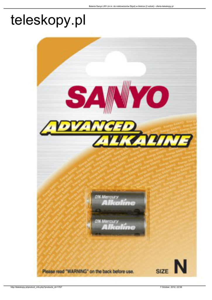 Bateria Sanyo LR1 (m.in. do noktowizorów Dipol) w blistrze (2 sztuki) - oferta teleskopy.pl teleskopy.pl http://teleskopy.pl/product_info.php?products_id=1767 7 October, 2012, 22:58 Bateria Sanyo LR1 (m.in. do noktowizorów Dipol) w blistrze (2 sztuki) - oferta teleskopy.pl Baterie alkaliczne Sanyo Alkaline LR1 - cena za 2 sztuki w blistrze Baterie alkaliczne Sanyo Alkaline LR1, stosowane m.in. do zasilania noktowizorów Dipol. Parametry • typ: N LR1; • inne oznaczenia: E90, 910A, lady; • napiêcie [V]: 1,5 • ¶rednica [mm]: 12,0 • wysoko¶æ [mm]: 30,2 • opakowanie: blister 2 sztuki http://teleskopy.pl/product_info.php?products_id=1767 7 October, 2012, 22:58