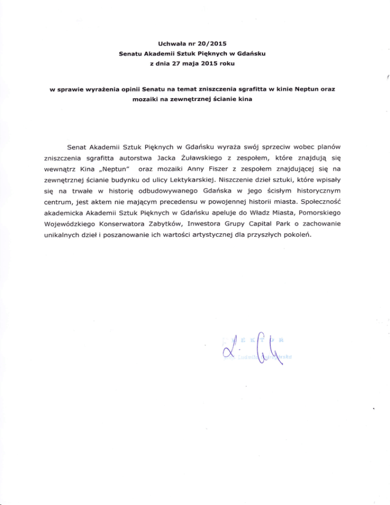 Uchwała nr 2o/2oL5 Senatu Akademii Sztuk Pięknych w Gdańsku z dnia 27 maja 2O15 roku w sprawie wyrażenia opinii Senatu na temat zniszczenia sgrafitta w kinie Neptun oraz mozaiki na zewnętrznej ścianiekina Senat Akademii Sztuk Pięknych w Gdańsku wyraŻa SWój sprzeciw Wobec planów zniszczenia sgrafitta autorstwa Jacka Zuławskiego z zespołem/ które znajdują się wewnątrz Kina ,'Neptun'' oraz mozaiki Anny Fiszer z zespołem znajdującej się na zewnętrznej ścianiebudynku od ulicy Lektykarskiej. Niszczenie dzieł sztuki, które wpisały się na trwałe W historię odbudowywanego Gdańska w jego ścisłymhistorycznym centrum, jest aktem nie mającym precedensu W powojennej historii miasta. Społeczność akademicka Akademii Sztuk Pięknych w Gdańsku apeluje do Władz Miasta, Pomorskiego Wojewódzkiego Konserwatora Zabytków, Inwestora Grupy Capital Park o zachowanie unikalnych dzieł i poszanowanie ich wartości artystycznej dla przyszłych pokoleń. .1 ['Ę