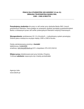 PRACA DLA STUDENTÓW (OD GODZINY 15 do 21) OBSŁUGA TELEFONICZNA BANKU ING. 1300 – 2300 zł BRUTTO Poszukujemy studentów do pracy w call center przy obsłudze Banku ING i innych prestiżowych Klientów. Praca polega na umawianiu spotkać pomiędzy przedstawicielami Banku a wskazanymi przez call center potencjalnymi klientami instytucji finansowych. Wynagrodzenie: podstawowe 10 i 11 zł brutto/h + rozbudowany system prowizyjny. Średnia płaca miesięczna oscyluje między 1300 a 2300 zł brutto. Osoby zainteresowany prosimy o kontakt telefoniczny: 516844990 emailowy: [email protected] (CV z dopiskiem STU-KCC/10/12) Miejsce pracy zlokalizowane jest przy lotnisku Chopina. 3 dniowe szkolenie rozpoczyna się w każdy poniedziałek. Agencja Lobo www.lobohr.pl