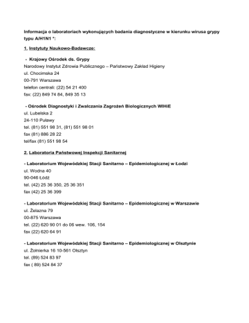 Informacja o laboratoriach wykonujących badania diagnostyczne w kierunku wirusa grypy typu A/H1N1 *: 1. Instytuty Naukowo-Badawcze: - Krajowy Ośrodek ds. Grypy Narodowy Instytut Zdrowia Publicznego – Państwowy Zakład Higieny ul. Chocimska 24 00-791 Warszawa telefon centrali: (22) 54 21 400 fax: (22) 849 74 84, 849 35 13 - Ośrodek Diagnostyki i Zwalczania Zagrożeń Biologicznych WIHiE ul. Lubelska 2 24-110 Puławy tel. (81) 551 98 31, (81) 551 98 01 fax (81) 886 28 22 tel/fax (81) 551 98 54 2. Laboratoria Państwowej Inspekcji Sanitarnej - Laboratorium Wojewódzkiej Stacji Sanitarno – Epidemiologicznej w Łodzi ul. Wodna 40 90-046 Łódź tel. (42) 25 36 350, 25 36 351 fax (42) 25 36 399 - Laboratorium Wojewódzkiej Stacji Sanitarno – Epidemiologicznej w Warszawie ul. Żelazna 79 00-875 Warszawa tel. (22) 620 90 01 do 06 wew. 106, 154 fax (22) 620 64 91 - Laboratorium Wojewódzkiej Stacji Sanitarno – Epidemiologicznej w Olsztynie ul. Żołnierka 16 10-561 Olsztyn tel. (89) 524 83 97 fax ( 89) 524 84 37 - Laboratorium Wojewódzkiej Stacji Sanitarno – Epidemiologicznej w Katowicach ul. Raciborska 39 40-957 Katowice tel. (32) 351 23 32 fax (32) 351 23 18 - Laboratorium Wojewódzkiej Stacji Sanitarno – Epidemiologicznej w Gdańsku ul. Dębinki 4 80-211 Gdańsk tel/fax (58) 520 27 43 - Laboratorium Wojewódzkiej Stacji Sanitarno – Epidemiologicznej w Poznaniu ul. Nowowiejskiego 60 61-734 Poznań tel. (61) 85 44 902, (61) 85 44 903 fax (61) 85 44 910 - Laboratorium Wojewódzkiej Stacji Sanitarno – Epidemiologicznej w Białymstoku ul. Legionowa 8 15-099 Białystok tel. (85) 740 85 40, (85) 740-85-76 fax (85) 740 48 99 - Laboratorium Wojewódzkiej Stacji Sanitarno – Epidemiologicznej w Bydgoszczy ul. Kujawska 4 85-031 Bydgoszcz tel. (52) 376 18 59 fax (52) 345 98 40 - Laboratorium Wojewódzkiej Stacji Sanitarno – Epidemiologicznej we Wrocławiu ul. Marii Curie-Skłodowskiej 73/77 50-396 Wrocław tel. (71) 328 70 55 (wew. 135, 137) fax (71) 328 35 92 - Laboratorium Wojewódzkiej Stacji Sanitarno – Epidemiologicznej w Krakowie ul. Prądnicka 76 31-202 Kraków tel. (12) 254 94 85, (12) 254 94 86 fax (12) 416 20 93 - Laboratorium Wojewódzkiej Stacji Sanitarno – Epidemiologicznej w Kielcach ul. Jagiellońska 68 25-734 Kielce sekretariat: tel: (41) 345 09 44, fax: (41) 345 18 73 centrala: tel: (41) 365 54 00, (41) 345 67 81, (41) 366 00 39 - Laboratorium Wojewódzkiej Stacji Sanitarno – Epidemiologicznej w Rzeszowie ul. Wierzbowa 16 35-959 Rzeszów Centrala: (17) 852 21 11 Fax: (17) 852 22 92 3. Laboratoria szpitalne i pozostałe laboratoria diagnostyczne - Centralne Laboratorium Analityczne Wojewódzkiego Szpitala Zakaźnego w Warszawie ul. Wolska 37, 01 – 201 Warszawa tel. (22) 33 55 314 www.zakazny.pl - Centralne Laboratorium Kliniczne – Uniwersyteckie Centrum Kliniczne w Gdańsku ul. Dębinki 7 80-952 Gdańsk tel. (58) 349 27 57 www.uck.gda.pl - Laboratoria Medyczne - Diagnostyka ul. Olszańska 5 31-513 Kraków tel. (12) 295 01 00 www.diag.pl - Zakład Wirusologii Uniwersytetu Medycznego w Lublinie ul. Chodźki 1 20-093 Lublin tel. (81) 742 37 88 www.wirusologia.lublin.pl - Laboratorium Samodzielnego Publicznego Wojewódzkiego Szpitala Zespolonego w Szczecinie ul. Arkońska 4 71-455 Szczecin tel. (91) 813 90 00 www.spwsz.szczecin.pl * Przedstawione informacje oparte są na danych przekazanych do Głównego Inspektoratu Sanitarnego przez poszczególne laboratoria i mogą nie stanowić pełnej listy ośrodków wykonujących badania w kierunku grypy typu A/H1N1v.