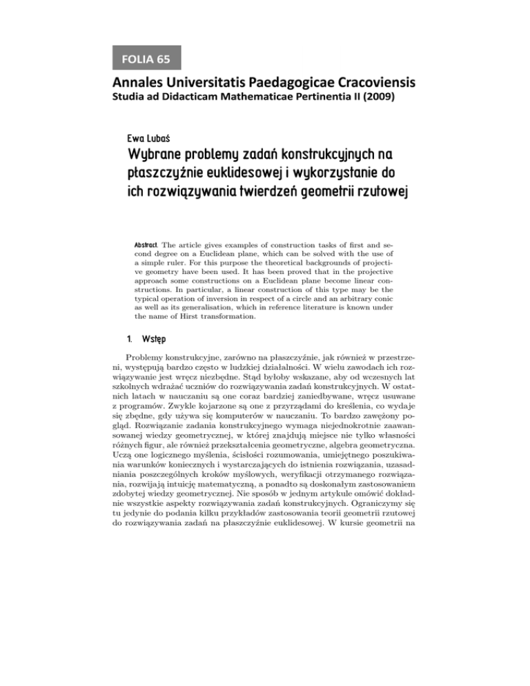 zdobytej wiedzy geometrycznej. Nie sposób w jednym artykule omówić dokładnie wszystkie aspekty rozwiązywania zadań konstrukcyjnych. Ograniczymy się