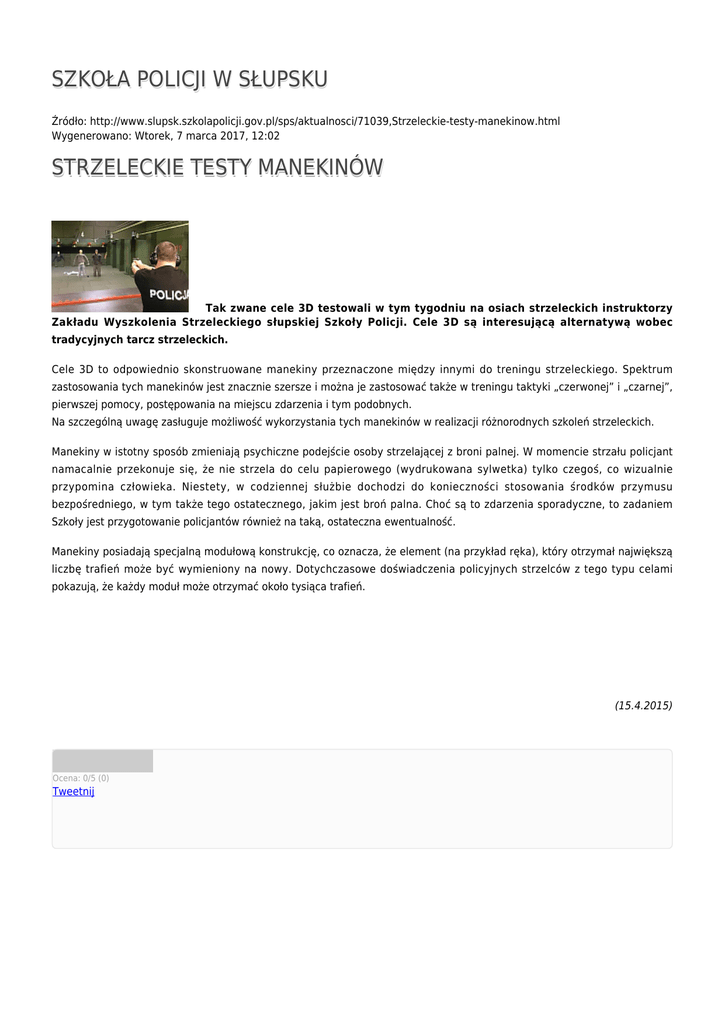 SZKOŁA POLICJI W SŁUPSKU Źródło: http://www.slupsk.szkolapolicji.gov.pl/sps/aktualnosci/71039,Strzeleckie-testy-manekinow.html Wygenerowano: Wtorek, 7 marca 2017, 12:02 STRZELECKIE TESTY MANEKINÓW Tak zwane cele 3D testowali w tym tygodniu na osiach strzeleckich instruktorzy Zakładu Wyszkolenia Strzeleckiego słupskiej Szkoły Policji. Cele 3D są interesującą alternatywą wobec tradycyjnych tarcz strzeleckich. Cele 3D to odpowiednio skonstruowane manekiny przeznaczone między innymi do treningu strzeleckiego. Spektrum zastosowania tych manekinów jest znacznie szersze i można je zastosować także w treningu taktyki „czerwonej” i „czarnej”, pierwszej pomocy, postępowania na miejscu zdarzenia i tym podobnych. Na szczególną uwagę zasługuje możliwość wykorzystania tych manekinów w realizacji różnorodnych szkoleń strzeleckich. Manekiny w istotny sposób zmieniają psychiczne podejście osoby strzelającej z broni palnej. W momencie strzału policjant namacalnie przekonuje się, że nie strzela do celu papierowego (wydrukowana sylwetka) tylko czegoś, co wizualnie przypomina człowieka. Niestety, w codziennej służbie dochodzi do konieczności stosowania środków przymusu bezpośredniego, w tym także tego ostatecznego, jakim jest broń palna. Choć są to zdarzenia sporadyczne, to zadaniem Szkoły jest przygotowanie policjantów również na taką, ostateczna ewentualność. Manekiny posiadają specjalną modułową konstrukcję, co oznacza, że element (na przykład ręka), który otrzymał największą liczbę trafień może być wymieniony na nowy. Dotychczasowe doświadczenia policyjnych strzelców z tego typu celami pokazują, że każdy moduł może otrzymać około tysiąca trafień. (15.4.2015) Ocena: 0/5 (0) Tweetnij