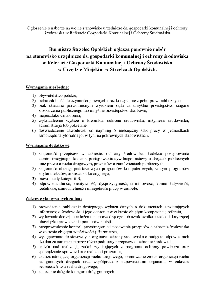 Ogłoszenie o naborze na wolne stanowisko urzędnicze ds. gospodarki komunalnej i ochrony środowiska w Referacie Gospodarki Komunalnej i Ochrony Środowiska Burmistrz Strzelec Opolskich ogłasza ponownie nabór na stanowisko urzędnicze ds. gospodarki komunalnej i ochrony środowiska w Referacie Gospodarki Komunalnej i Ochrony Środowiska w Urzędzie Miejskim w Strzelcach Opolskich. Wymagania niezbędne: 1) obywatelstwo polskie, 2) pełna zdolność do czynności prawnych oraz korzystanie z pełni praw publicznych, 3) brak skazania prawomocnym wyrokiem sądu za umyślne przestępstwo ścigane z oskarżenia publicznego lub umyślne przestępstwo skarbowe, 4) nieposzlakowana opinia, 5) wykształcenie wyższe o kierunku: ochrona środowiska, inżynieria środowiska, administracja lub pokrewne, 6) doświadczenie zawodowe: co najmniej 5 miesięczny staż pracy w jednostkach samorządu terytorialnego, w tym na pokrewnych stanowiskach, Wymagania dodatkowe: 1) znajomość przepisów w zakresie: ochrony środowiska, kodeksu postępowania administracyjnego, kodeksu postępowania cywilnego, ustawy o drogach publicznych oraz prawo o ruchu drogowym, przepisów o zamówieniach publicznych, 2) znajomość obsługi podstawowych programów komputerowych, w tym programów edytora tekstów, arkusza kalkulacyjnego, 3) prawo jazdy kategorii B, 4) odpowiedzialność, kreatywność, dyspozycyjność, terminowość, komunikatywność, rzetelność, samodzielność i umiejętność pracy w zespole. Zakres wykonywanych zadań: 1) prowadzenie publicznie dostępnego wykazu danych o dokumentach zawierających informację o środowisku i jego ochronie w zakresie objętym kompetencją referatu, 2) wydawanie decyzji o nałożeniu na prowadzącego lub użytkownika instalacji dotyczącej obowiązku prowadzenia pomiarów emisji, 3) przeprowadzanie kontroli przestrzegania i stosowania przepisów o ochronie środowiska w zakresie objętym właściwością Burmistrza, 4) występowanie do stosownych organów ochrony środowiska o podjęcie odpowiednich działań za naruszenie przez różne podmioty przepisów o ochronie środowiska, 5) nadzór nad realizacją zadań wynikających z programu ochrony powietrza oraz sporządzanie sprawozdań z realizacji programu, 6) analiza istniejącej organizacji ruchu drogowego, opiniowanie zmian organizacji ruchu na gminnych drogach oraz współpraca z odpowiednimi organami w zakresie bezpieczeństwa ruchu drogowego, 7) zaliczanie dróg do kategorii dróg gminnych. Informacja o warunkach pracy na danym stanowisku: 1) Praca w budynku Urzędu Miejskiego w Strzelcach Opolskich - ul. Plac Myśliwca 1, drugie piętro (brak windy), w pełnym wymiarze czasu pracy, w równoważnym systemie czasu pracy. Stanowisko pracy związane z pracą przy komputerze, praca w zespole, wymagane przemieszczanie się w terenie, codzienny kontakt bezpośredni lub telefoniczny z klientem. 2) W miesiącu lipcu 2016 roku wskaźnik zatrudnienia osób niepełnosprawnych, w Urzędzie Miejskim w Strzelcach Opolskich, w rozumieniu przepisów o rehabilitacji zawodowej i społecznej oraz zatrudnianiu osób niepełnosprawnych przekracza 6%. Wymagane dokumenty: 1) list motywacyjny, 2) CV z uwzględnieniem dokładnego przebiegu kariery zawodowej, 3) kserokopia dokumentów potwierdzających wykształcenie (dyplom lub zaświadczenie o odbytych studiach), staż pracy (świadectwa pracy, zaświadczenia) oraz posiadane kwalifikacje, umiejętności i uprawnienia, 4) kwestionariusz osobowy dla osób ubiegających się o zatrudnienie dostępny do pobrania na stronie (www.bip.strzelceopolskie.pl) lub w Referacie Kadr, 5) oświadczenie kandydata o pełnej zdolności do czynności prawnych i korzystania z pełni praw publicznych, 6) oświadczenie kandydata, iż nie był skazany prawomocnym wyrokiem sądu za umyślne przestępstwo ścigane z oskarżenia publicznego lub umyślne przestępstwo skarbowe, 7) oświadczenie kandydata o wyrażeniu zgody na przetwarzanie danych osobowych zawartych w ofercie pracy dla potrzeb niezbędnych do realizacji procesu rekrutacji zgodnie z ustawą z dnia 29 sierpnia 1997 r. o ochronie danych osobowych (Dz. U. z 2015 poz. 2135 z późn. zm) oraz ustawą o pracownikach samorządowych (druki oświadczeń dostępne do pobrania na stronie www.bip.strzelceopolskie.pl). 8) dokument potwierdzający niepełnosprawność.* Dokumenty aplikacyjne: list motywacyjny i CV powinny być opatrzone własnoręcznym podpisem oraz zawierać klauzulę: „Niniejszym udzielam zgody Urzędowi Miejskiemu w Strzelcach Opolskich na przetwarzanie danych osobowych zawartych w moim CV na potrzeby rekrutacji na stanowisko urzędnicze ds. gospodarki komunalnej i ochrony środowiska, zgodnie z ustawą z dnia 29 sierpnia 1997roku o ochronie danych osobowych (Dz. U. z 2015 poz. 2135 z późn. zm.) oraz ustawą z dnia 21 listopada 2008 roku o pracownikach samorządowych (Dz. U. z 2016 poz. 902)". W przypadku niedostarczenia kompletu wyżej wymaganych dokumentów kandydat nie spełni wymogów formalnych zawartych w ogłoszeniu i nie zostanie dopuszczony do dalszego postepowania kwalifikacyjnego. Termin i miejsce składania dokumentów: Wymagane dokumenty aplikacyjne należy składać w zamkniętych kopertach w Kancelarii Urzędu Miejskiego pokój 1, lub pocztą na adres: Urząd Miejski w Strzelcach Opolskich, Referat Kadr, 47-100 Strzelce Opolskie Plac Myśliwca 1 z dopiskiem „Nabór na stanowisko urzędnicze ds. gospodarki komunalnej i ochrony środowiska” w terminie do dnia 30.09.2016r. do godziny 1530. Oferty pracy, które wpłyną do Urzędu po wyżej określonym terminie nie będą rozpatrywane. Osoby zakwalifikowane do następnego etapu zostaną poinformowane telefonicznie o dalszej procedurze postępowania kwalifikacyjnego. Informacja o wyniku naboru będzie umieszczona na stronie podmiotowej Urzędu Miejskiego w Strzelcach Opolskich w Biuletynie Informacji Publicznej – www.bip.strzelceopolskie.pl w menu „Ogłoszenia” – zakł