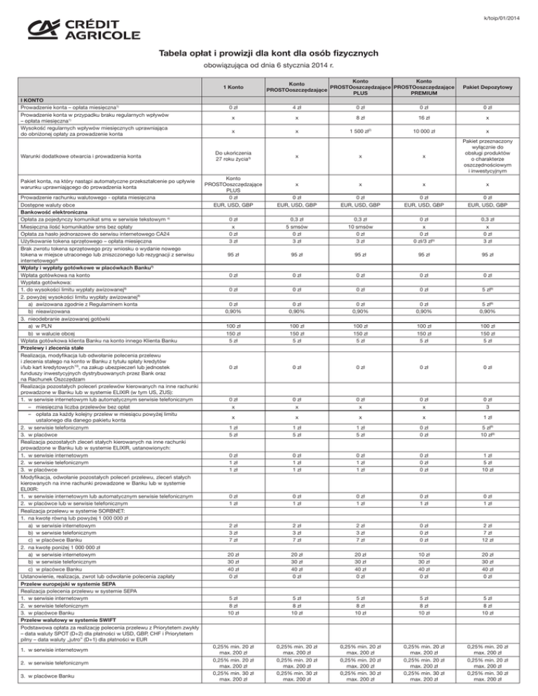 k/toip/01/2014 Tabela opłat i prowizji dla kont dla osób fizycznych obowiązująca od dnia 6 stycznia 2014 r. 1 Konto I KONTO Prowadzenie konta – opłata miesięczna1) Prowadzenie konta w przypadku braku regularnych wpływów – opłata miesięczna1) Wysokość regularnych wpływów miesięcznych uprawniająca do obniżonej opłaty za prowadzenie konta Warunki dodatkowe otwarcia i prowadzenia konta Pakiet konta, na który nastąpi automatyczne przekształcenie po upływie warunku uprawniającego do prowadzenia konta Prowadzenie rachunku walutowego - opłata miesięczna Dostępne waluty obce Bankowość elektroniczna Opłata za pojedynczy komunikat sms w serwisie tekstowym 4) Miesięczna ilość komunikatów sms bez opłaty Opłata za hasło jednorazowe do serwisu internetowego CA24 Użytkowanie tokena sprzętowego – opłata miesięczna Brak zwrotu tokena sprzętowego przy wniosku o wydanie nowego tokena w miejsce utraconego lub zniszczonego lub rezygnacji z serwisu internetowego6) Wpłaty i wypłaty gotówkowe w placówkach Banku7) Wpłata gotówkowa na konto Wypłata gotówkowa: 1. do wysokości limitu wypłaty awizowanej8) 2. powyżej wysokości limitu wypłaty awizowanej8) a) awizowana zgodnie z Regulaminem konta b) nieawizowana 3. nieodebranie awizowanej gotówki a) w PLN b) w walucie obcej Wpłata gotówkowa klienta Banku na konto innego Klienta Banku Przelewy i zlecenia stałe Realizacja, modyfikacja lub odwołanie polecenia przelewu i zlecenia stałego na konto w Banku z tytułu spłaty kredytów i/lub kart kredytowych10), na zakup ubezpieczeń lub jednostek funduszy inwestycyjnych dystrybuowanych przez Bank oraz na Rachunek Oszczędzam Realizacja pozostałych poleceń przelewów kierowanych na inne rachunki prowadzone w Banku lub w systemie ELIXIR (w tym US, ZUS): 1. w serwisie internetowym lub automatycznym serwisie telefonicznym – miesięczna liczba przelewów bez opłat – opłata za każdy kolejny przelew w miesiącu powyżej limitu ustalonego dla danego pakietu konta 2. w serwisie telefonicznym 3. w placówce Realizacja pozostałych zleceń stałych kierowanych na inne rachunki prowadzone w Banku lub w systemie ELIXIR, ustanowionych: 1. w serwisie internetowym 2. w serwisie telefonicznym 3. w placówce Modyfikacja, odwołanie pozostałych poleceń przelewu, zleceń stałych kierowanych na inne rachunki prowadzone w Banku lub w systemie ELIXIR: 1. w serwisie internetowym lub automatycznym serwisie telefonicznym 2. w placówce lub w serwisie telefonicznym Realizacja przelewu w systemie SORBNET: 1. na kwotę równą lub powyżej 1 000 000 zł a) w serwisie internetowym b) w serwisie telefonicznym c) w placówce Banku 2. na kwotę poniżej 1 000 000 zł a) w serwisie internetowym b) w serwisie telefonicznym c) w placówce Banku Ustanowienie, realizacja, zwrot lub odwołanie polecenia zapłaty Przelew europejski w systemie SEPA Realizacja polecenia przelewu w systemie SEPA 1. w serwisie internetowym 2. w serwisie telefonicznym 3. w placówce Banku Przelew walutowy w systemie SWIFT Podstawowa opłata za realizację polecenia przelewu z Priorytetem zwykły – data waluty SPOT (D+2) dla płatności w USD, GBP, CHF i Priorytetem pilny – data waluty „jutro” (D+1) dla płatności w EUR 1. w serwisie internetowym 2. w serwisie telefonicznym 3. w placówce Banku Konto Konto Konto PROSTOoszczędzające PROSTOoszczędzające PROSTOoszczędzające PLUS PREMIUM Pakiet Depozytowy 0 zł 4 zł 0 zł 0 zł 0 zł x x 8 zł 16 zł x x x 1 500 zł Do ukończenia 27 roku życia3) 2) 10 000 zł x x x x Pakiet przeznaczony wyłącznie do obsługi produktów o charakterze oszczędnościowym i inwestycyjnym Konto PROSTOoszczędzające PLUS 0 zł EUR, USD, GBP x x x x 0 zł EUR, USD, GBP 0 zł EUR, USD, GBP 0 zł EUR, USD, GBP 0 zł EUR, USD, GBP 0 zł x 0 zł 3 zł 0,3 zł 5 smsów 0 zł 3 zł 0,3 zł 10 smsów 0 zł 3 zł 0 zł x 0 zł 0 zł/3 zł5) 0,3 zł x 0 zł 3 zł 95 zł 95 zł 95 zł 95 zł 95 zł 0 zł 0 zł 0 zł 0 zł 0 zł 0 zł 0 zł 0 zł 0 zł 5 zł9) 0 zł 0,90% 0 zł 0,90% 0 zł 0,90% 0 zł 0,90% 5 zł9) 0,90% 100 zł 150 zł 5 zł 100 zł 150 zł 5 zł 100 zł 150 zł 5 zł 100 zł 150 zł 5 zł 100 zł 150 zł 5 zł 0 zł 0 zł 0 zł 0 zł 0 zł 0 zł x 0 zł x 0 zł x 0 zł x 0 zł 3 x x x x 1 zł 1 zł 5 zł 1 zł 5 zł 1 zł 5 zł 0 zł 0 zł 5 zł9) 10 zł9) 0 zł 1 zł 1 zł 0 zł 1 zł 1 zł 0 zł 1 zł 1 zł 0 zł 0 zł 0 zł 1 zł 5 zł 10 zł 0 zł 1 zł 0 zł 1 zł 0 zł 1 zł 0 zł 1 zł 0 zł 1 zł 2 zł 3 zł 7 zł 2 zł 3 zł 7 zł 2 zł 3 zł 7 zł 0 zł 0 zł 0 zł 2 zł 7 zł 12 zł 20 zł 30 zł 40 zł 0 zł 20 zł 30 zł 40 zł 0 zł 20 zł 30 zł 40 zł 0 zł 10 zł 30 zł 40 zł 0 zł 20 zł 30 zł 40 zł 0 zł 5 zł 8 zł 10 zł 5 zł 8 zł 10 zł 5 zł 8 zł 10 zł 5 zł 8 zł 10 zł 5 zł 8 zł 10 zł 0,25% min. 20 zł max. 200 zł 0,25% min. 20 zł max. 200 zł 0,25% min. 30 zł max. 200 zł 0,25% min. 20 zł max. 200 zł 0,25% min. 20 zł max. 200 zł 0,25% min. 30 zł max. 200 zł 0,25% min. 20 zł max. 200 zł 0,25% min. 20 zł max. 200 zł 0,25% min. 30 zł max. 200 zł 0,25% min. 20 zł max. 200 zł 0,25% min. 20 zł max. 200 zł 0,25% min. 30 zł max. 200 zł 0,25% min. 20 zł max. 200 zł 0,25% min. 20 zł max. 200 zł 0,25% min. 30 zł max. 200 zł 1 Konto Konto Konto Konto PROSTOoszczędzające PROSTOoszczędzające PROSTOoszczędzające PLUS PREMIUM Pakiet Depozytowy Realizacja przelewu z Priorytetem pilny – data waluty „jutro” (D+1) dla 30 zł 30 zł 30 zł 30 zł 30 zł płatności w USD i GBP11) (nie dotyczy płatności w EUR realizowanych z Priorytetem pilny). Priorytet pilny niedostępny dla płatności w CHF. Realizacja przelewu z Priorytetem ekspresowy – data waluty „dziś” (D) dla 50 zł 50 zł 50 zł 50 zł 50 zł płatności w EUR i USD11) Priorytet ekspresowy niedostępny dla płatności w CHF i GBP. Opcja kosztowa OUR (całość kosztów po stronie banku nadawcy 80 zł 80 zł 80 zł 80 zł 80 zł i odbiorcy p