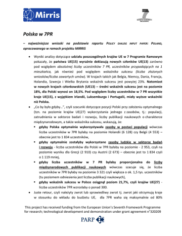 Polska w 7PR – najważniejsze wnioski na podstawie raportu POLICY opracowanego w ramach projektu MIRRIS DIALOG INPUT PAPER: POLAND, Wyniki analizy dotyczące udziału poszczególnych krajów UE w 7 Programie Ramowym pokazały, że państwa UE(15) wyraźnie deklasują nowych członków UE(13) zarówno pod względem absolutnej liczby uczestników 7 PR, uczestników przypadających na 1 mieszkańca, jak również pod względem wskaźnika sukcesu (liczba złożonych wniosków/liczba zawartych umów). W krajach takich jak Belgia, Niemcy, Dania, Francja, Holandia, Szwecja i Wielka Brytania wskaźnik sukcesu jest powyżej 23%. Natomiast w nowych krajach członkowskich (UE13) – średni wskaźnik sukcesu jest na poziomie 18%, dla Polski wynosi on 18,5%. Pod względem liczby uczestników w 7 PR wszystkie kraje UE(15), z wyjątkiem Irlandii, Luksemburga i Portugalii, miały wyższe wskaźniki niż Polska. „Co by było gdyby…”, czyli szacunki dotyczące pozycji Polski przy założeniu optymalnego (tzn. na poziomie krajów UE(27) wykorzystania jednego z zasobów, tj.: populacji, zatrudnienia w sektorze badań i rozwoju, liczby publikacji naukowych o charakterze międzynarodowym, a także wskaźnika sukcesu, wskazują, że: gdyby Polska optymalnie wykorzystywała zasoby w postaci populacji wówczas liczba uczestników w 7PR byłaby na poziomie Holandii (6 128) czy Belgii (4 553) – obecnie jest to 1 834 uczestników, gdyby optymalnie zostałyby wykorzystane zasoby ludzkie w sektorze badań i rozwoju - liczba uczestników dla Polski w 7PR byłaby na poziomie - 2 953, czyli na poziomie wyniku dla Grecji (2 910) czy Austrii (2 673) – obecnie jest to 1 834 czyli o 1 119 mniej, gdyby liczba uczestników w 7 PR byłaby proporcjonalna do liczby międzynarodowych publikacji naukowych wówczas szacuje się, że liczba uczestników w 7PR byłaby na poziomie 3 321 czyli większa o ok. 1,5 tys. uczestników (tu poziomem odniesienia jest liczba publikacji naukowych), gdyby wskaźnik sukcesu w Polsce osiągnął poziom 21,7%, czyli krajów UE(27) liczba uczestników 7PR wzrosłaby o ponad 300. Juste retour, czyli należyty zwrot lub sprawiedliwy zwrot tj. zwrot jaki otrzymują kraje w stosunku do wkładu do budżetu UE, dla 7PR waha się maksymalnie od 80% This project has received funding from the European Union’s Seventh Framework Programme for research; technological development and demonstration under grant agreement n°320209 w Holandii do mniej niż 3% w wielu krajach. Polska jest wśród krajów o najniższej stawce juste retour – 2% razem z Czechami (2,6%), Litwą (2,0%), Rumunią (1,5%) i Słowacją (1,4%). Polska jest niewystarczająco skuteczna jeśli bierzemy pod uwagę zatrudnienie w sektorze badań i rozwoju. W przypadku gdy uczestnictwo zestawimy z populacją wyniki są jeszcze słabsze. Wskaźnik sukcesu w aplikowaniu o fundusze w ramach 7 PR jest zbliżony do średniej UE(13) i wynosi 18,5%. Pod względem liczby beneficjentów 7 PR na 1 mln mieszkańców (47,6) i wielkości środków z 7 PR (8,9 EUR) Polska ma jeden ze słabszych wyników. Dla porównania średnie wartości dla krajów UE (13) wynoszą odpowiednio – 80,5 i 13,5EUR. Uczestnictwo Polski w Europejskiej Przestrzeni Badawczej jest relatywnie silne w wybranych obszarach tematycznych, w szczególności: ICT (230 beneficjentów), Nanotechnologie, materiały i nowe technologie produkcji” (164) i transport (149). Bariery i czynniki sprzyjające w 7 PR Różnice między krajami UE w doświadczeniu o ubieganie się o środki z EFRR i z 7 PR można wyrazić stosunkiem wielkości środków pozyskanych w ramach obu tych źródeł, tj. 7PR/EFRR, który jest w Polsce na poziomie 0,03. Dla porównania w Danii relacja ta wynosi 3,8, w Belgii 3,5, a w Słowenii 0,1. Warto zwrócić uwagę na fakt, że w starych krajach UE dostępność EFRR jest znacznie bardziej ograniczona niż w nowych państwach UE, przy czym jak widać na przykładzie Słowenii relacja środków z 7PR do EFRR może być bardziej korzystna niż ma to miejsce w Polsce. W Polsce brakuje wiodących uczelni obecnych w 7PR. Lista „Shanghai 500” zawiera dwa polskie uniwersytety: Uniwersytet Jagielloński i Uniwersytet Warszawski (ale dopiero na dalekich miejscach – pierwsza 300. i 400.). Istotne różnice w działalności uniwersytetów widać również w danych dotyczących liczby publikacji. Dane wskazują, że uczelnie z krajów UE(15) mają znacznie więcej publikacji międzynarodowych (51 200) w porównaniu z krajami UE(13) (7 600). This project has received funding from the European Union’s Seventh Framework Programme for research; technological development and demonstration under grant agreement n°320209 Głównym językiem międzynarodowych badań naukowych, w tym programów ramowych, jest angielski. W przypadku Polski poziom kompetencji języka angielskiego wśród ludności jest nawet poniżej średniej krajów UE(13). Czynniki sprzyjające rozwijaniu współpracy w ramach Europejskiej Przestrzeni Badawczej Wydatki publiczne na edukację jako procent produktu krajowego brutto są w Polsce na poziomie krajów UE(13), ale niższe niż w krajach UE(15) – odpowiednio 5,1% oraz 5,6%. Nie bez znaczenia dla oceny innowacyjności w jej szerszym znaczeniu jest otoczenie biznesu. Pod tym względem Rada Europejska i Komisja zaleca Polsce poprawę klimatu przedsiębiorczości. Niemniej jednak należy zauważyć, że w rankingu Banku Światowego pt. Doing Business (2013) Polska zajmuje 45. miejsce. Jest to wynik znacznie powyżej średniej EU(13) i nawet powyżej kilku państw członkowskich z UE(15): Hiszpania (52), Luksemburg (60) i Włochy (65). Innowacyjności sprzyja także dyskrecjonalny system uczenia się. W tym względzie Polska wykazuje wyższy poziom organizacji pracy niż w krajach UE(13), ale niższy niż średni poziom dla EU(15) krajów. Mimo, że całkowity budżet przeznaczany przez polski rząd na B+R jest stosunkowo niewielki, to ma on ten
