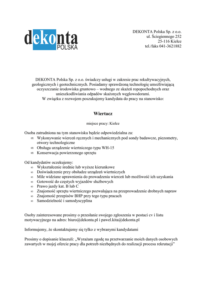 DEKONTA Polska Sp. z o.o. ul. Ściegiennego 252 25-116 Kielce tel./faks 041-3621882 DEKONTA Polska Sp. z o.o. świadczy usługi w zakresie prac rekultywacyjnych, geologicznych i geotechnicznych. Posiadamy sprawdzoną technologię umoŜliwiającą oczyszczanie środowiska gruntowo – wodnego ze skaŜeń ropopochodnych oraz unieszkodliwiania odpadów skaŜonych węglowodorami. W związku z rozwojem poszukujemy kandydata do pracy na stanowisko: Wiertacz miejsce pracy: Kielce Osoba zatrudniona na tym stanowisku będzie odpowiedzialna za: • Wykonywanie wierceń ręcznych i mechanicznych pod sondy badawcze, piezometry, otwory technologiczne • Obsługa urządzenie wiertniczego typu WH-15 • Konserwacja powierzonego sprzętu Od kandydatów oczekujemy: • Wykształcenie średnie lub wyŜsze kierunkowe • Doświadczenie przy obsłudze urządzeń wiertniczych • Mile widziane uprawnienia do prowadzenia wierceń lub moŜliwość ich uzyskania • Gotowość do częstych wyjazdów słuŜbowych • Prawo jazdy kat. B lub C • Znajomość sprzętu wiertniczego pozwalająca na przeprowadzenie drobnych napraw • Znajomość przepisów BHP przy tego typu pracach • Samodzielność i samodyscyplina Osoby zainteresowane prosimy o przesłanie swojego zgłoszenia w postaci cv i listu motywacyjnego na adres: [email protected] i [email protected] Informujemy, Ŝe skontaktujemy się tylko z wybranymi kandydatami Prosimy o dopisanie klauzuli: „WyraŜam zgodę na przetwarzanie moich danych osobowych zawartych w mojej ofercie pracy dla potrzeb niezbędnych do realizacji procesu rekrutacji”