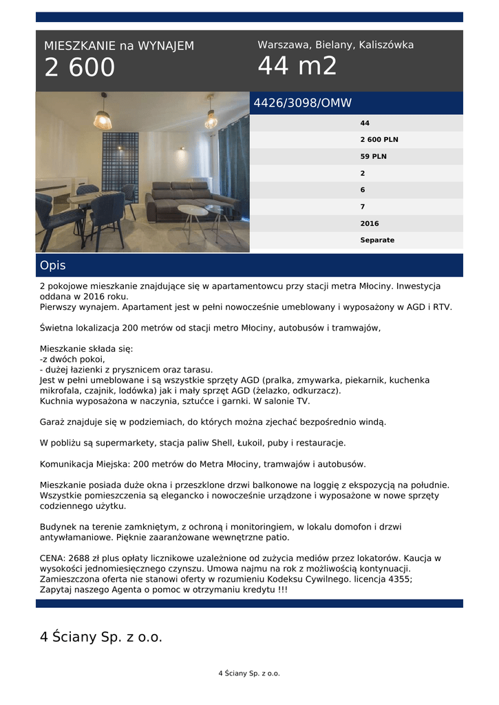 MIESZKANIE na WYNAJEM 2 600 Warszawa, Bielany, Kaliszówka 44 m2 4426/3098/OMW 44 2 600 PLN 59 PLN 2 6 7 2016 Separate Opis 2 pokojowe mieszkanie znajdujące się w apartamentowcu przy stacji metra Młociny. Inwestycja oddana w 2016 roku. Pierwszy wynajem. Apartament jest w pełni nowocześnie umeblowany i wyposażony w AGD i RTV. Świetna lokalizacja 200 metrów od stacji metro Młociny, autobusów i tramwajów, Mieszkanie składa się: -z dwóch pokoi, - dużej łazienki z prysznicem oraz tarasu. Jest w pełni umeblowane i są wszystkie sprzęty AGD (pralka, zmywarka, piekarnik, kuchenka mikrofala, czajnik, lodówka) jak i mały sprzęt AGD (żelazko, odkurzacz). Kuchnia wyposażona w naczynia, sztućce i garnki. W salonie TV. Garaż znajduje się w podziemiach, do których można zjechać bezpośrednio windą. W pobliżu są supermarkety, stacja paliw Shell, Łukoil, puby i restauracje. Komunikacja Miejska: 200 metrów do Metra Młociny, tramwajów i autobusów. Mieszkanie posiada duże okna i przeszklone drzwi balkonowe na loggię z ekspozycją na południe. Wszystkie pomieszczenia są elegancko i nowocześnie urządzone i wyposażone w nowe sprzęty codziennego użytku. Budynek na terenie zamkniętym, z ochroną i monitoringiem, w lokalu domofon i drzwi antywłamaniowe. Pięknie zaaranżowane wewnętrzne patio. CENA: 2688 zł plus opłaty licznikowe uzależnione od zużycia mediów przez lokatorów. Kaucja w wysokości jednomiesięcznego czynszu. Umowa najmu na rok z możliwością kontynuacji. Zamieszczona oferta nie stanowi oferty w rozumieniu Kodeksu Cywilnego. licencja 4355; Zapytaj naszego Agenta o pomoc w otrzymaniu kredytu !!! 4 Ściany Sp. z o.o. 4 Ściany Sp. z o.o. tel. 22 629 80 80 email: [email protected] 4 Ściany Sp. z o.o. Powered by TCPDF (www.tcpdf.org)
