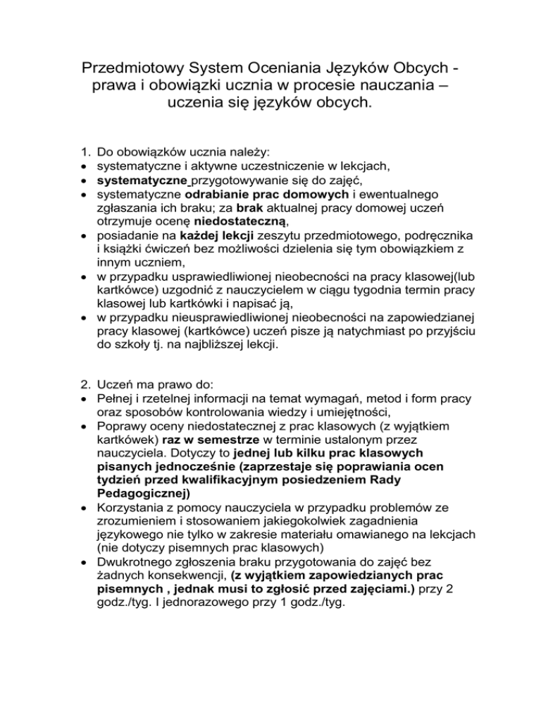 Przedmiotowy System Oceniania Języków Obcych prawa i obowiązki ucznia w procesie nauczania – uczenia się języków obcych. Do obowiązków ucznia należy: systematyczne i aktywne uczestniczenie w lekcjach, systematyczne przygotowywanie się do zajęć, systematyczne odrabianie prac domowych i ewentualnego zgłaszania ich braku; za brak aktualnej pracy domowej uczeń otrzymuje ocenę niedostateczną, posiadanie na każdej lekcji zeszytu przedmiotowego, podręcznika i książki ćwiczeń bez możliwości dzielenia się tym obowiązkiem z innym uczniem, w przypadku usprawiedliwionej nieobecności na pracy klasowej(lub kartkówce) uzgodnić z nauczycielem w ciągu tygodnia termin pracy klasowej lub kartkówki i napisać ją, w przypadku nieusprawiedliwionej nieobecności na zapowiedzianej pracy klasowej (kartkówce) uczeń pisze ją natychmiast po przyjściu do szkoły tj. na najbliższej lekcji. 1. 2. Uczeń ma prawo do: Pełnej i rzetelnej informacji na temat wymagań, metod i form pracy oraz sposobów kontrolowania wiedzy i umiejętności, Poprawy oceny niedostatecznej z prac klasowych (z wyjątkiem kartkówek) raz w semestrze w terminie ustalonym przez nauczyciela. Dotyczy to jednej lub kilku prac klasowych pisanych jednocześnie (zaprzestaje się poprawiania ocen tydzień przed kwalifikacyjnym posiedzeniem Rady Pedagogicznej) Korzystania z pomocy nauczyciela w przypadku problemów ze zrozumieniem i stosowaniem jakiegokolwiek zagadnienia językowego nie tylko w zakresie materiału omawianego na lekcjach (nie dotyczy pisemnych prac klasowych) Dwukrotnego zgłoszenia braku przygotowania do zajęć bez żadnych konsekwencji, (z wyjątkiem zapowiedzianych prac pisemnych , jednak musi to zgłosić przed zajęciami.) przy 2 godz./tyg. I jednorazowego przy 1 godz./tyg. 3. Zabrania się na lekcjach języka obcego: Podpowiadania Przygotowywania się do zajęć z innych przedmiotów Korzystania ze źródeł niedozwolonych podczas prac klasowych Żucia gumy Jedzenia i picia Niszczenia mienia szkoły. 4. Za nieprzestrzeganie powyższych zasad uczniowi grozi: Upomnienie nauczyciela Ocena niedostateczna za brak przygotowania do zajęć, ściąganie w czasie prac klasowych lub powtarzający się brak aktywności na lekcji Uwaga wpisana do zeszytu wychowawczego, dziennika lekcyjnego Dodatkowa praca domowa. 5. Do obowiązków nauczyciela należy: Systematyczne i jawne ocenianie postępów ucznia (ilość i częstotliwość prac pisemnych i ustnych ustalana jest indywidualnie przez każdego nauczyciela) Informowanie klasy o pisemnej pracy klasowej na tydzień przed planowanym jej terminem Dokładne informowanie ucznia o zakresie materiału obowiązującego do testu lub sprawdzianu i organizowanie lekcji powtórzeniowej przed sprawdzianem obejmujący szerszy zakres materiału (np.: całego semestru lub znacznej jego części) Nagradzanie aktywności uczniów na lekcji przez wpisywanie plusów do dziennika zajęć (za 5 plusów uczeń otrzymuje ocenę bardzo dobrą) Wpisywanie minusów za brak aktywności uczniów na lekcji ( 5 minusów ocena niedostateczna) Sprawdzanie ilościowe prac domowych uczniów na każdej lekcji oraz jakościowe w miarę potrzeb, nie rzadziej niż raz w semestrze. Egzekwowanie wiedzy zdobytej przez uczniów wyłącznie w zakresie materiału, który uczeń może znaleźć w obowiązującym w klasie podręczniku, książce ćwiczeń, zeszycie przedmiotowym lub materiałach dodatkowych opracowanych dla niego przez nauczyciela ( w przypadku korzystania z materiałów dodatkowych nauczyciel zobowiązany jest do uprzedniej analizy ich przydatności – leksykalnej i gramatycznej na danym poziomie zaawansowania ucznia, a ponadto do zadbania o to, aby każdy mógł otrzymać kopię tych materiałów na własność) Systematyczne informowanie uczniów o wynikach ich prac pisemnych, w ciągu dwóch tygodni od przekazania ich nauczycielowi. 6. W przypadku nieprzestrzegania przez nauczyciela w/w postanowień uczeń ma prawo do: Wyjaśnienia kwestii spornej z nauczycielem Wyjaśnienia kwestii spornej z dyrektorem, zastępcą dyrektora lub pedagogiem szkolnym. 7. Ustala się następujący system oceniania: Prace klasowe, testy, sprawdziany (ocena czerwona) I. Poniżej 50% - ocena niedostateczna II. 50% - 59% - ocena dopuszczająca III. 60% - 74% - ocena dostateczna IV. 75% - 88% - ocena dobra V. 89% - 100% - ocena bardzo dobra Ocenę celującą uczeń może otrzymać wówczas, gdy treść zadań obejmuje szeroki zakres materiału i gdy stosowane są różnorodne techniki testowania zdobytych przez ucznia umiejętności, wymaganych na poziomie wyższym niż poziom objęty programem.