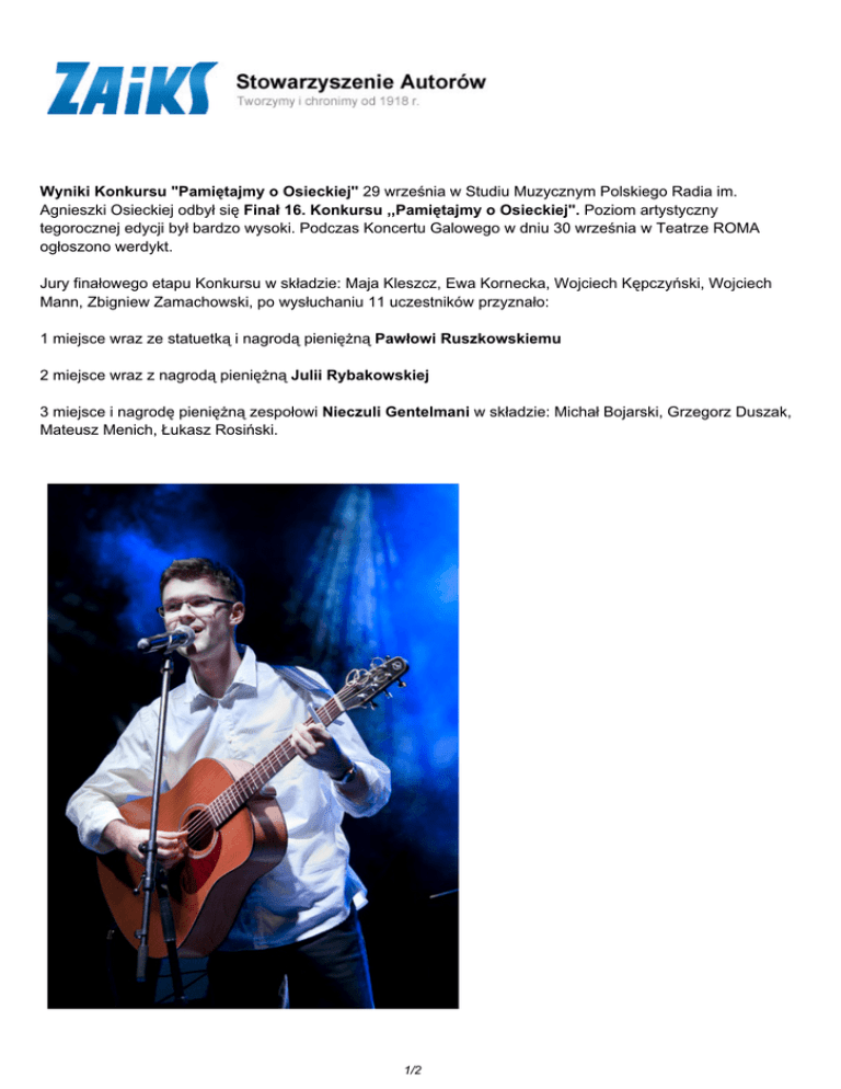 Wyniki Konkursu "Pamiętajmy o Osieckiej'' 29 września w Studiu Muzycznym Polskiego Radia im. Agnieszki Osieckiej odbył się Finał 16. Konkursu ,,Pamiętajmy o Osieckiej''. Poziom artystyczny tegorocznej edycji był bardzo wysoki. Podczas Koncertu Galowego w dniu 30 września w Teatrze ROMA ogłoszono werdykt. Jury finałowego etapu Konkursu w składzie: Maja Kleszcz, Ewa Kornecka, Wojciech Kępczyński, Wojciech Mann, Zbigniew Zamachowski, po wysłuchaniu 11 uczestników przyznało: 1 miejsce wraz ze statuetką i nagrodą pieniężną Pawłowi Ruszkowskiemu 2 miejsce wraz z nagrodą pieniężną Julii Rybakowskiej 3 miejsce i nagrodę pieniężną zespołowi Nieczuli Gentelmani w składzie: Michał Bojarski, Grzegorz Duszak, Mateusz Menich, Łukasz Rosiński. 1/2 (Paweł Ruszkowski, fot. Patrycja Kosela) Młodzi wykonawcy ujęli publiczność i jury swoimi interpretacjami takich piosenek jak Zielono mi, Biedne badyliszcze czy Ballada o fryzjerze z St. Denis. Nagrodę specjalną, ufundowaną przez Muzeum Polskiej Piosenki w Opolu otrzymała Karolina Czarnecka. 28 września podczas koncertu w Muzeum Powstania Warszawskiego publiczność wybrała ulubionego wykonawcę. Laureatką plebiscytu publiczności została Julia Rybakowska; wynik ogłoszono podczas Koncertu Galowego. Podczas Gali Konkursu została wręczona Statuetka ? autograf Agnieszki Osieckiej za zasługi dla popularyzacji polskiej piosenki Panu Adamowi Sławińskiemu, kompozytorowi, autorowi muzyki do wielu niezapomnianych piosenek z tekstami Agnieszki Osieckiej. Koncert ,,Archipelag Sław" w oparciu o utwory kompozytora do tekstów wybitnych poetów piosenki uświetnił drugą część Koncertu Galowego. Honorowy Patronat nad 16. Konkursem i Festiwalem ,,Pamiętajmy o Osieckiej'' objęli Minister Kultury i Dziedzictwa Narodowego Bogdan Zdrojewski oraz Marszałek Województwa Mazowieckiego Adam Struzik, zaś nad samą Galą Konkursu ? małżonka Prezydenta RP Pani Anna Komorowska. Już dziś, w poniedziałek 7 października, w TVP Kultura o godzinie 17.45 będzie można obejrzeć retransmisję pierwszej części Koncertu Galowego - Koncert Laureatów wraz z ogłoszeniem zwycięzcy tegorocznego Konkursu. Wszelkie prawa zastrzeżone 2017 ZAiKS / data wygenerowania strony 07.03.2017 12:06:14 PDF ze strony: http://www.zaiks.org.pl/691,196 2/2