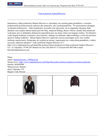 Dane pochodzą ze strony: http://www.jarocin.org/. Wygenerowano dnia: 07-03-2017. Frak jeździecki StajniaMiszewo Internetowy sklep jeździecki Stajnia Miszewo w sprzedaży ma szeroką gamę produktów i towarów jeździeckich przeznaczonych zarówno dla amatorów, jak i profesjonalistów. W asortymencie dostępne są ubrania konkursowe – fraki jeździeckie, koszulki oraz akcesoria. Są to elegancko skrojone fraki damskie oraz męskie takich marek jak Fair Play, Imperial Riding, Busse i Horze. Każdy frak jeździecki wykonany jest ze dokładnie dobranych materiałóworaz ma fason, który nie krępuje ruchów. Na klientów czeka bogata kolekcja rozmiarów oraz kolorów, dlatego też dobranie odpowiedniego z nich nie powinno sprawić żadnej trudności. Sklep Stajnia Miszewo zapewnia zawsze przystępne ceny oraz szybko realizuje zamówienia. Zachęcamy do wejścia na stronę i zapoznania się z całą ofertą produktów, a także życzymy udanych zakupów! Frak jeździecki Stajnia Miszewo S.C. http://www.stajniamiszewo.pl/sklep/dla-jezdzca/odziez-konkursowa/frak-jezdziecki Stajnia Miszewo S.C. ul. Gdyńska 179 80-297 Banino tel./fax (58) 684-87-73 tel.kom 603 045 046 e-mail: [email protected] Dane: email: [email protected] Strona www: http://www.stajniamiszewo.pl/sklep/dla-jezdzca/odziez-konkursowa/frak-jezdziecki telefon: 603045046 Miejscowość: Banino ulica: Gdyńska 179 Region: Cały Powiat